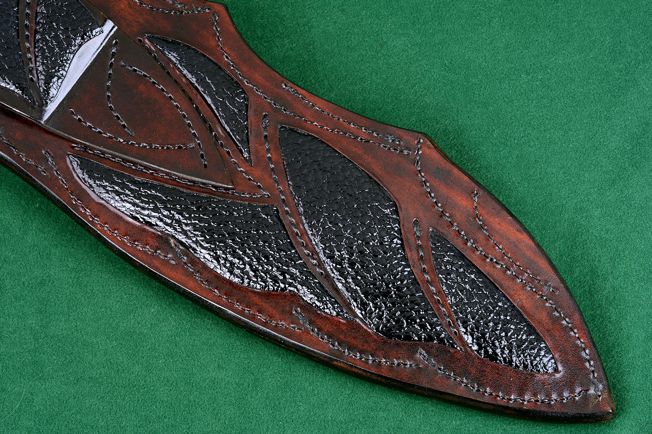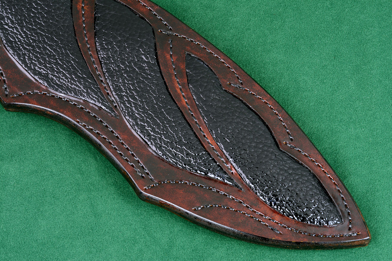 In the photo above, you can see the magnificent texture and appearance of the buffalo skin inlays and stitching arrangement in the sheath front face. Buffalo skin is difficult to work with; it's extremely thick and heavy, and extensive and careful skiving and thinning of the back side of the material was necessary to form-fit it into the inlays. The stitching arrangement was tight and accurate, with curved lines and flowing forms matching the inlay panel shapes. These are all reflected in the overall curves of the knife and its relationship with the fine sheath.