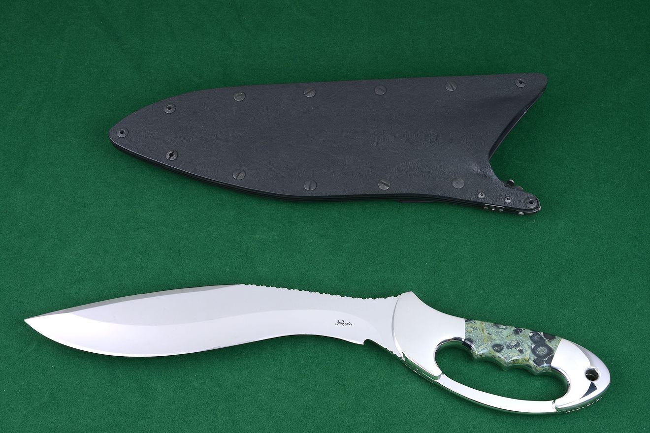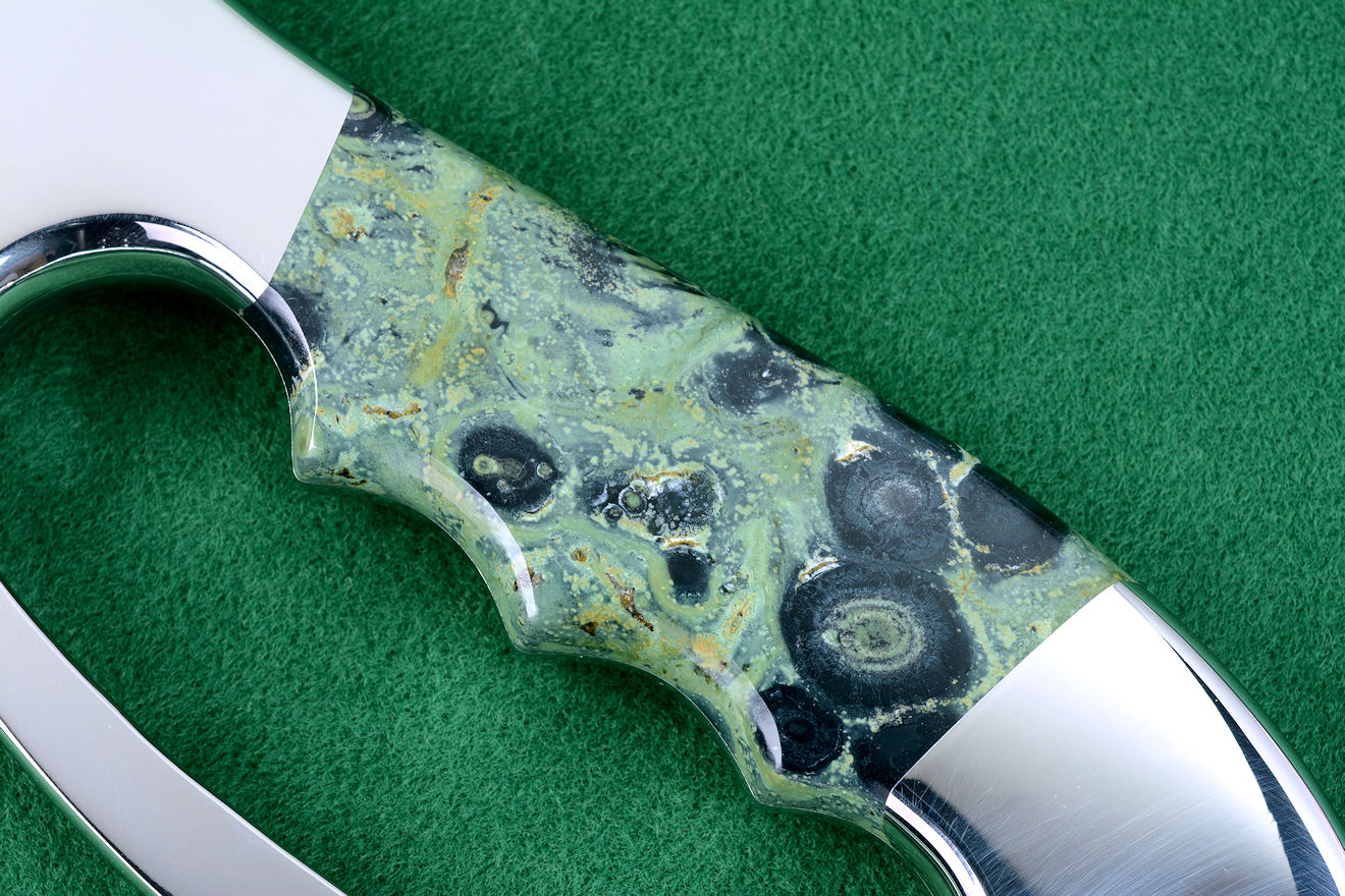 The handle chosen for this khukri is Kambaba Jasper originating in Madagascar. This is a true jasper, a cryptocrystalline quartz, literally billions of years old. Kambaba jasper is fossilized stromatolite cyanobacteria. Often called algae (though not quite biologically and technically correct), they are the earliest fossilized biological remains on earth. The ancient life form was replaced through fossilization, and the patterns and shapes of bacterial colonies are preserved. This is a very hard, very tough gem and will withstand heavy use. In fact, this material will outlast the entire knife, since it is stone. Considering the intense age (about 3.5 billion years), this is not a material that's going away soon! While mostly quartzite, the orange hue is iron sulfide. At that time, when this simple life form ruled the earth, the oceans were filled with iron, and there was little oxygen in the air. It's through this cyanobacterial photosynthesis action that our oxygen-rich atmosphere was created. This is known as the "great oxygenation event." Also called the "rusting" event, it had the effect of turning a lot of iron on the surface of the planet to iron oxides and iron compounds, so the bit of iron sulfide in the stone tells a characteristic story.