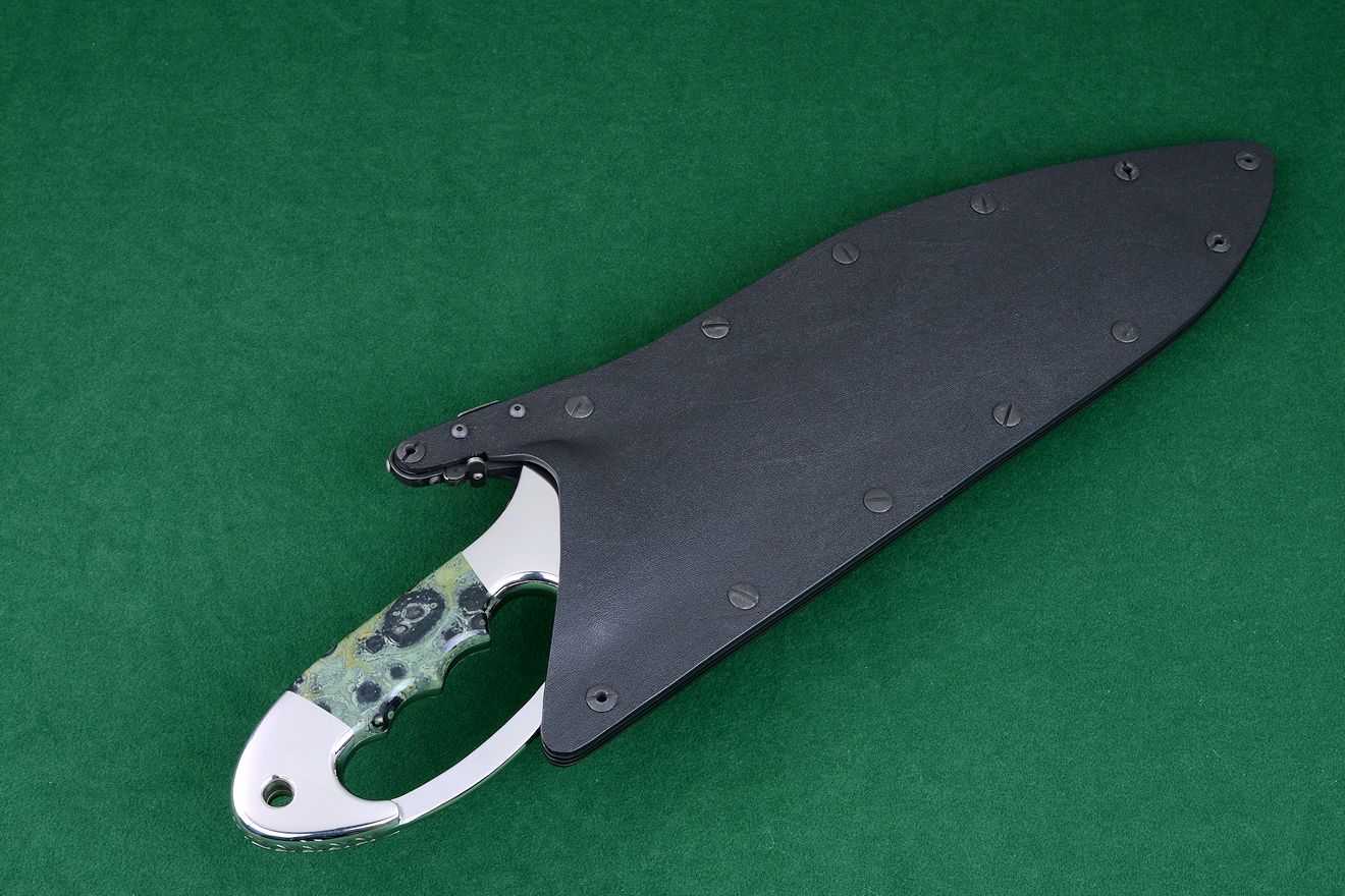 The "Ananke" custom khukri in the positively locking sheath. The sheath is constructed of double thickness kydex, .125" thick, whereas most makers only use kydex half this thickness. Kydex is a thermoforming blend of polyvinylchloride and acrylic, and is extremely durable in thick sections, impervious to all common chemical exposures. The sheath front and back are built on a frame of 5052 H32 corrosion resistant, high strength aluminum alloy, and I've anodized the aluminum with a permanent, near-ceramic hard coating, into which is sealed the black dye. This makes the aluminum even more resilient, scratch resistant, and corrosion resistant: the best it can be. It's also flat and non-reflective. The aluminum welt frame supports the multi-component locking system, made of all stainless steel (304, 302, and 316) for the highest strength and corrosion resistance. I've made these locking sheaths for military and tactical use since 1994, and have not had a failure of a single one. The sheath is secured with all 304 stainless steel hardware and fasteners, which have been blasted for glare reduction and treated with a black oxide finish that darkens the stainless steel.