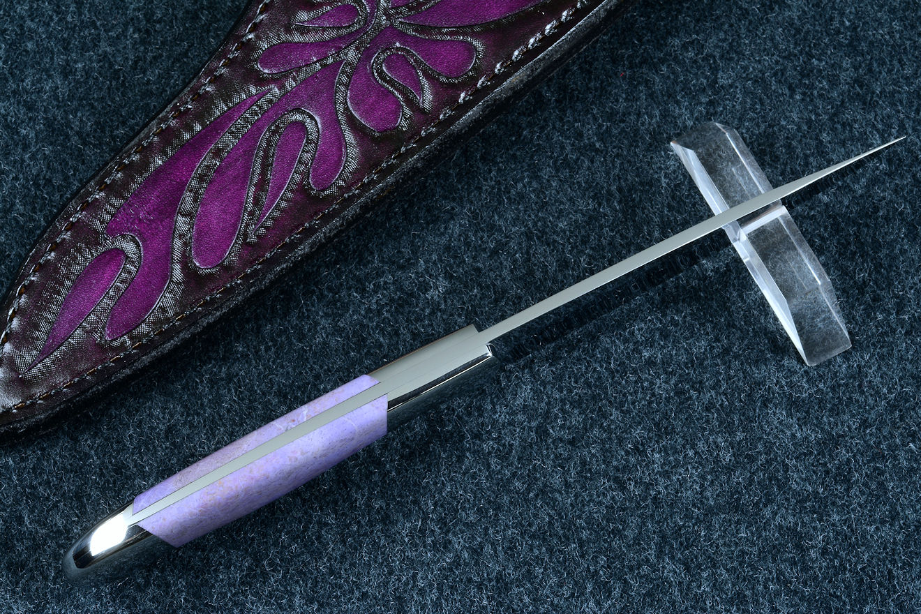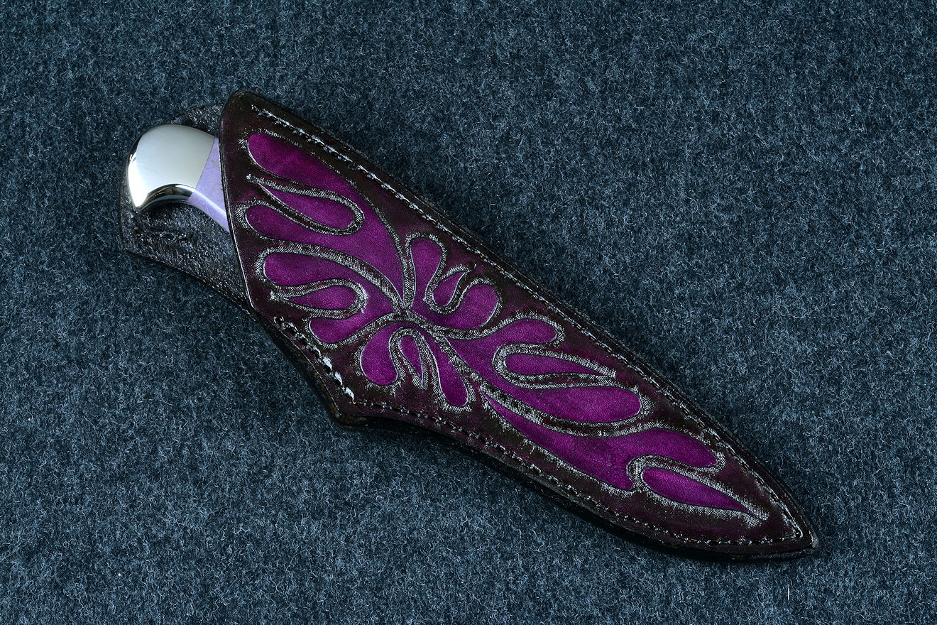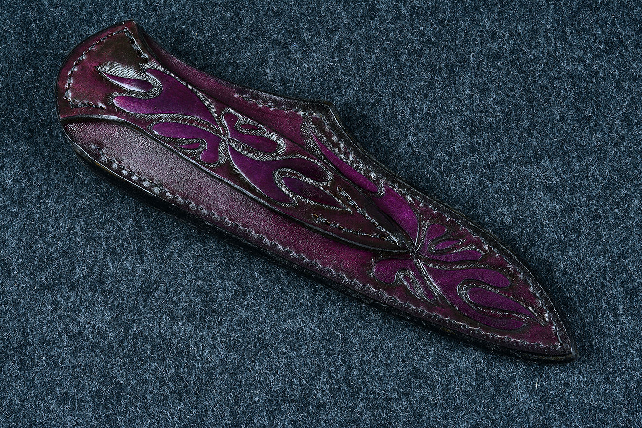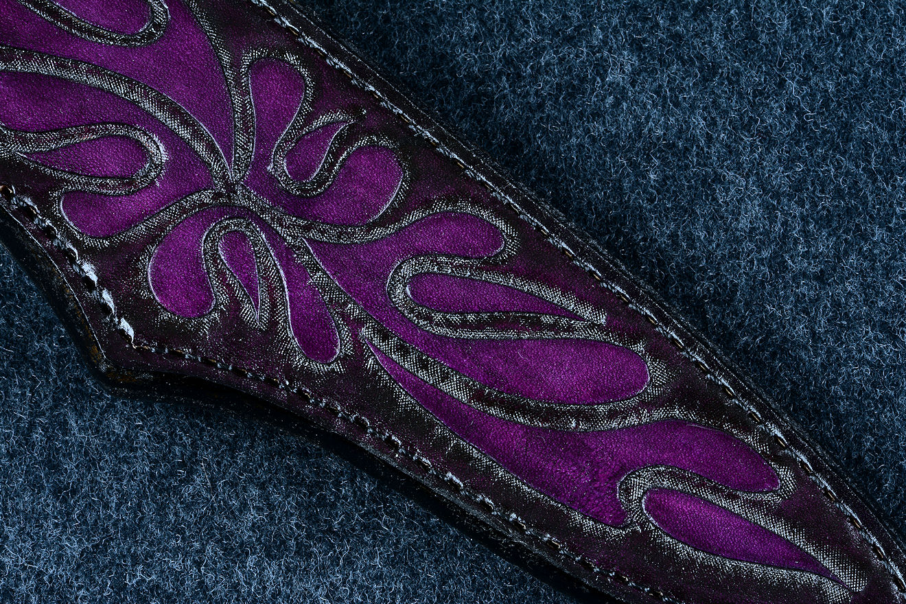 the sheath front, back, and belt loop, and hand-tooled and hand-dyed