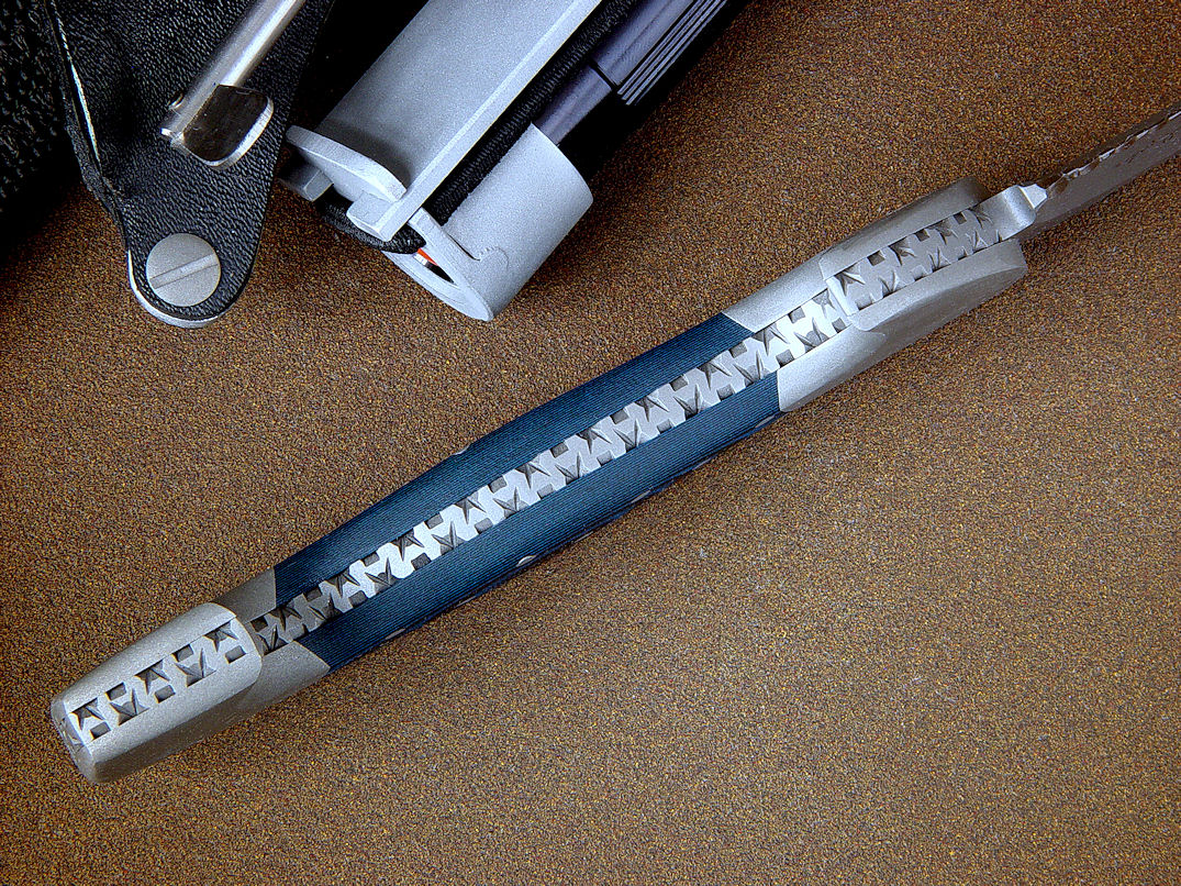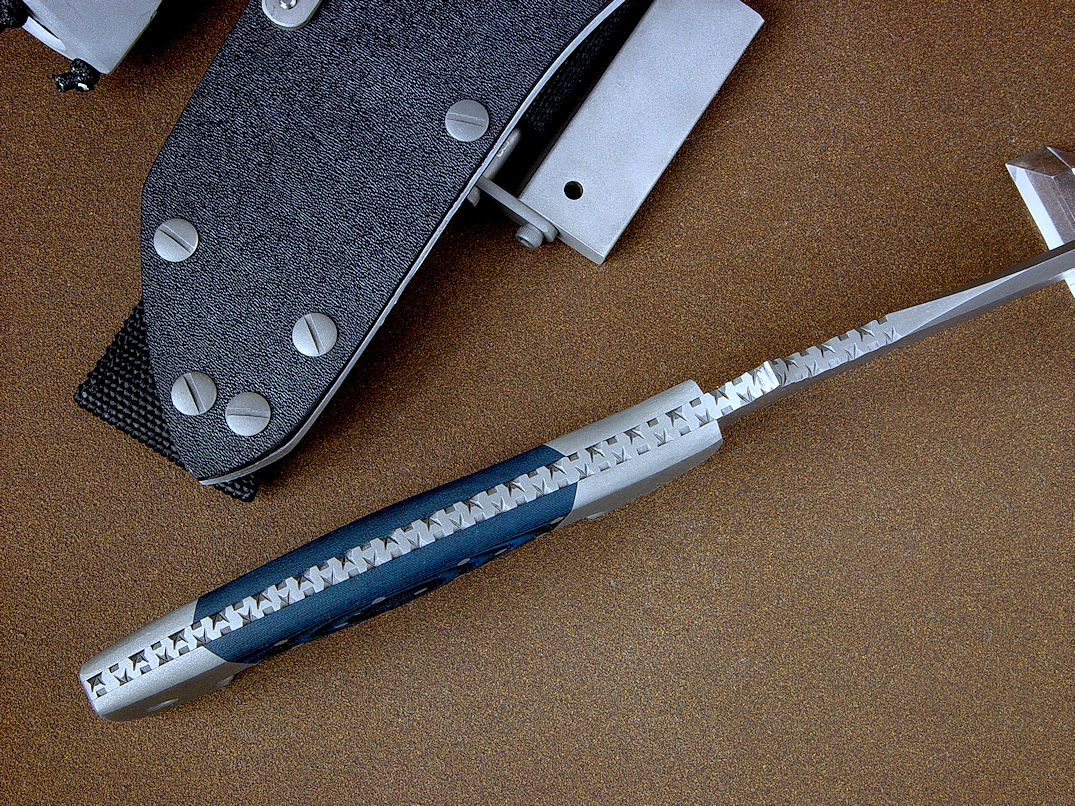 What a great looking handle, with the brass fibers providing a visual texture that made me want to pick up the knife. Taking the knife, in the sheath, in hand and appreciating the solidity of it as a unit is a striking tactile indicator of how tight the design and implementation is. This is a precision piece of engineering. I'm relieved that the handle isn't too large for my hand. Now to the really fun part, hitting that locking-mechanism release with the tip of my thumb and drawing the blade from the sheath. And then doing it again and again, just to enjoy it; it locks securely with no play of knife in sheath, but releases so easily with the natural draw grip. I wondered if you had an "Aha!" moment when you thought of the design.