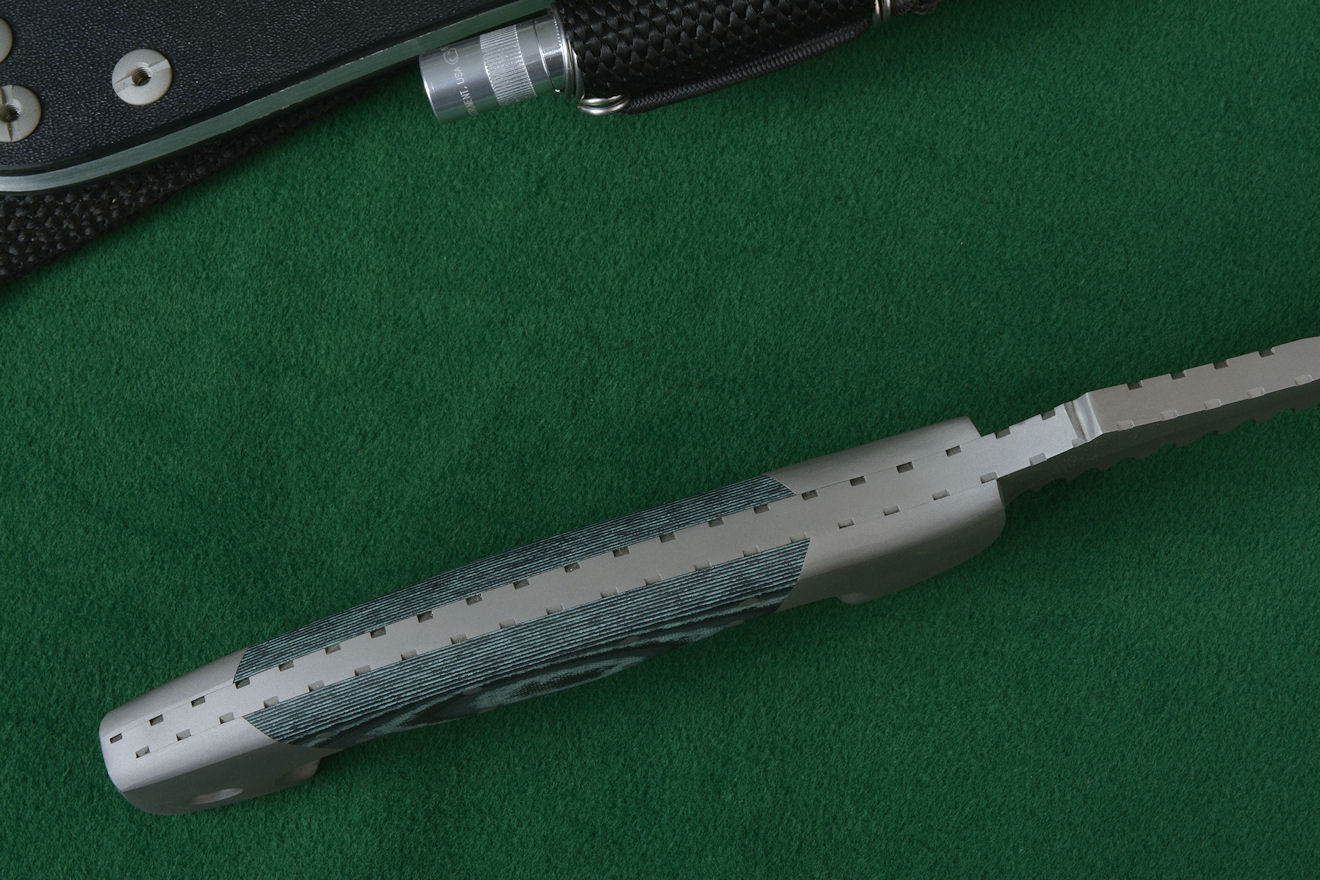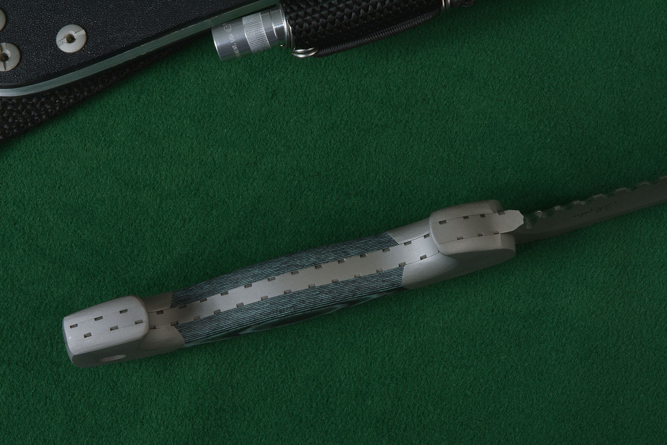 What a great looking handle, with the brass fibers providing a visual texture that made me want to pick up the knife. Taking the knife, in the sheath, in hand and appreciating the solidity of it as a unit is a striking tactile indicator of how tight the design and implementation is. This is a precision piece of engineering. I'm relieved that the handle isn't too large for my hand. Now to the really fun part, hitting that locking-mechanism release with the tip of my thumb and drawing the blade from the sheath. And then doing it again and again, just to enjoy it; it locks securely with no play of knife in sheath, but releases so easily with the natural draw grip. I wondered if you had an "Aha!" moment when you thought of the design.