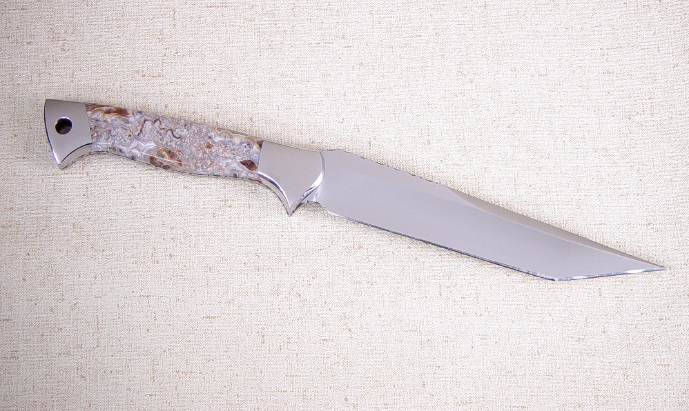 style is an aggressive tanto, with a beefy spine, half-length top swage,
