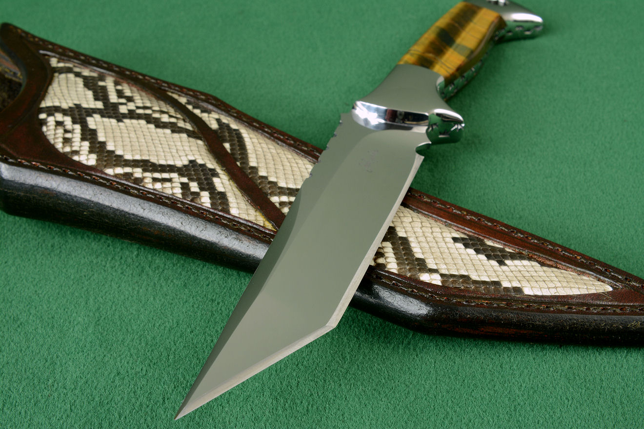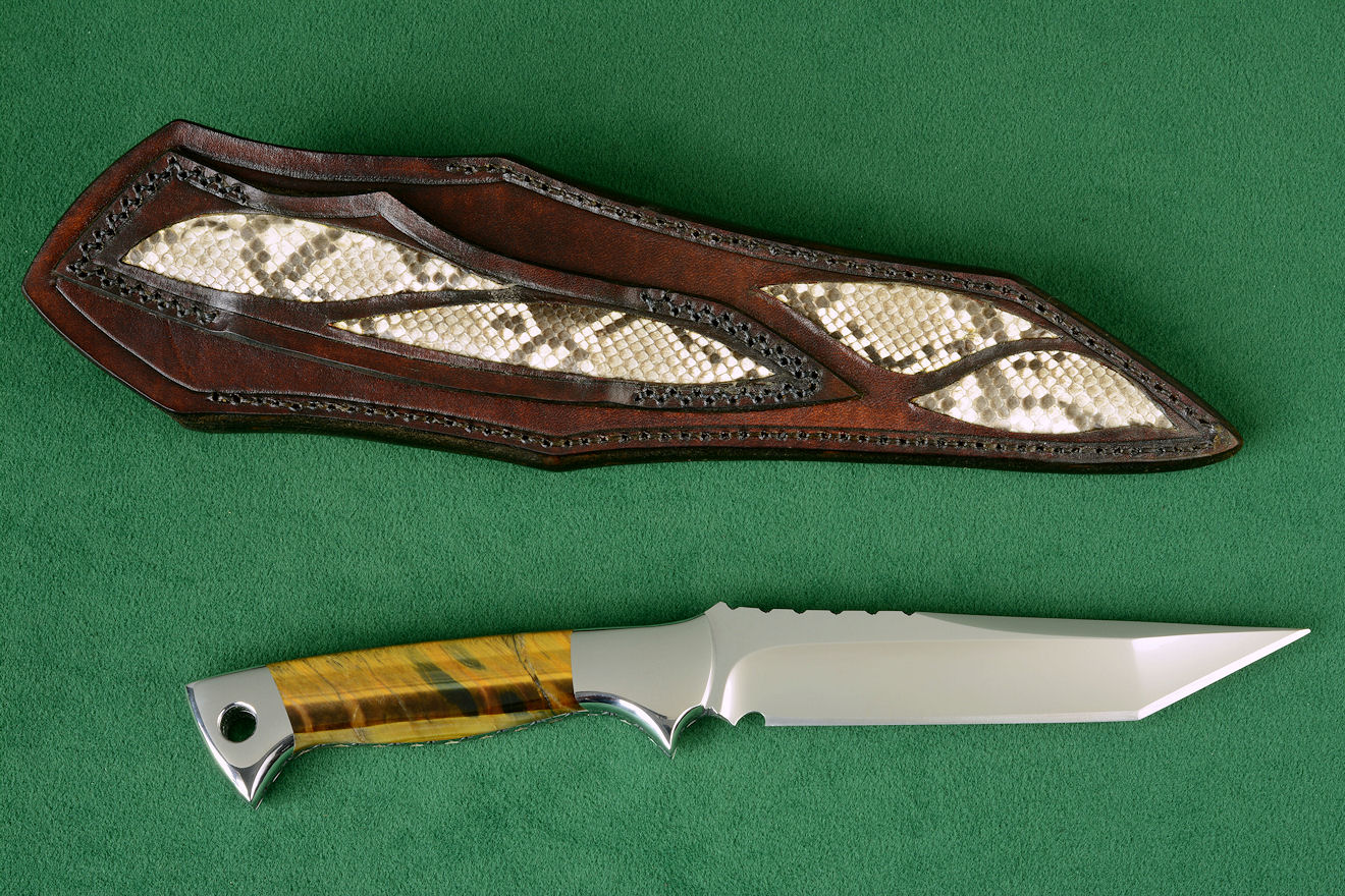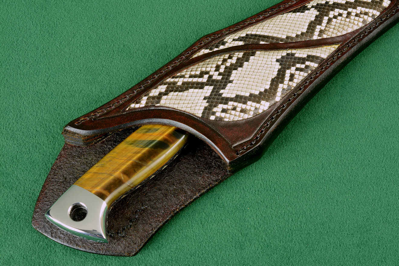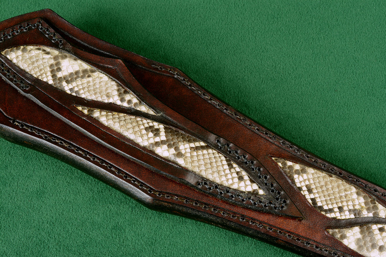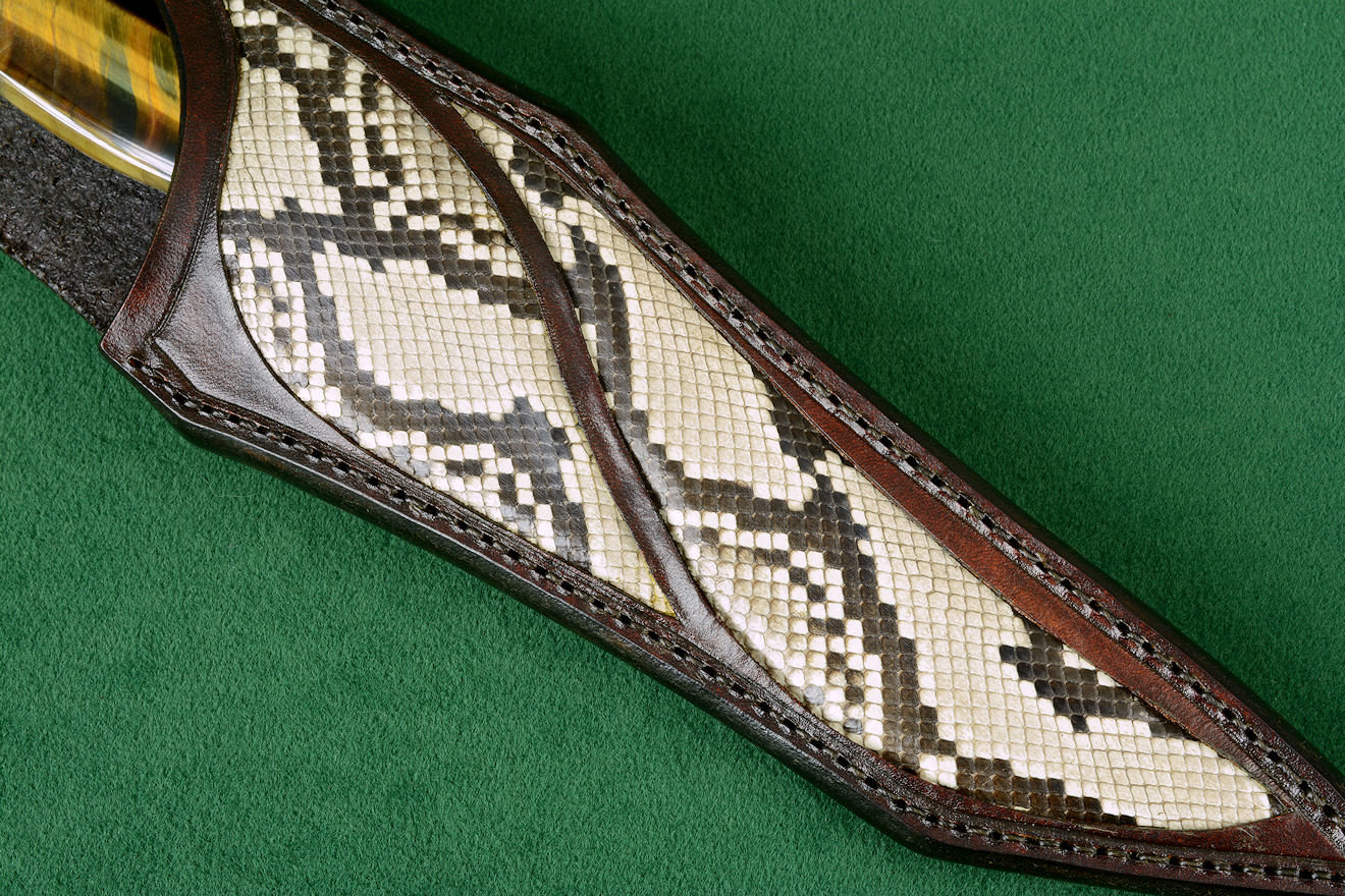 - Sheath: Hand-carved leather, hand-dyed, inlaid with Python skin