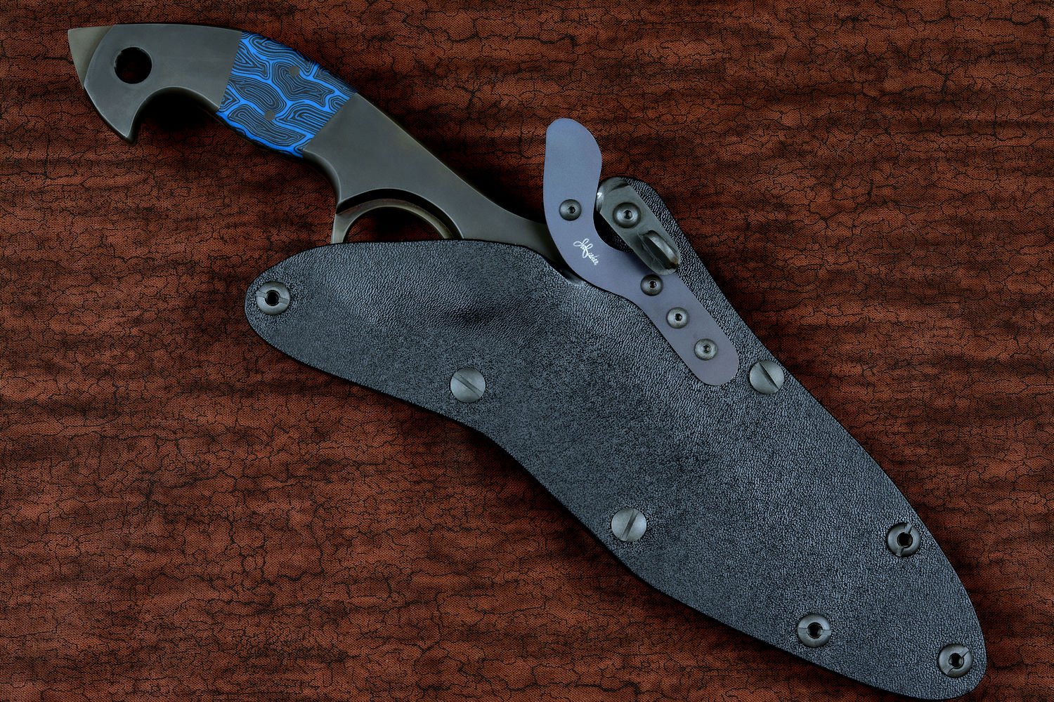 locking sheath upside down across sternum, handle down, in black polypropylene,