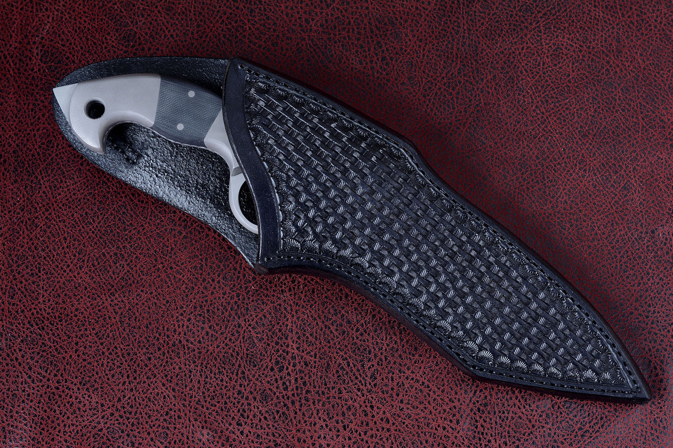basketweave pattern hand-stamped leather sheath, made of 9-10 oz.