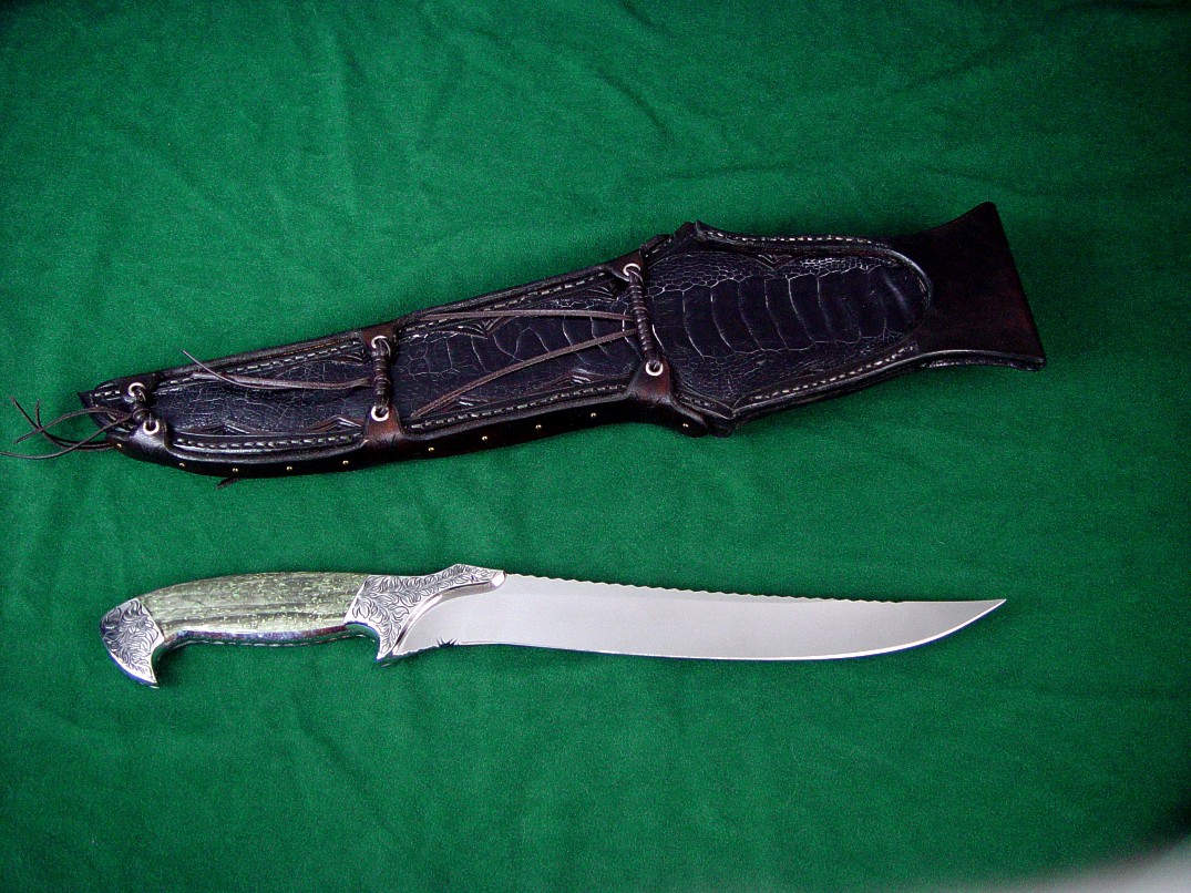 Sheath: Ostrich Leg Skin Inlaid in Hand-Tooled 9-10 oz. Leather Shoulder, Latigo Lace bindings