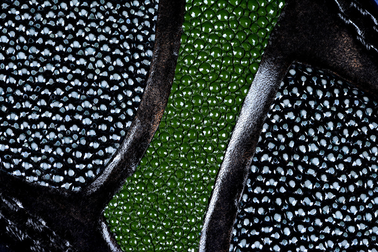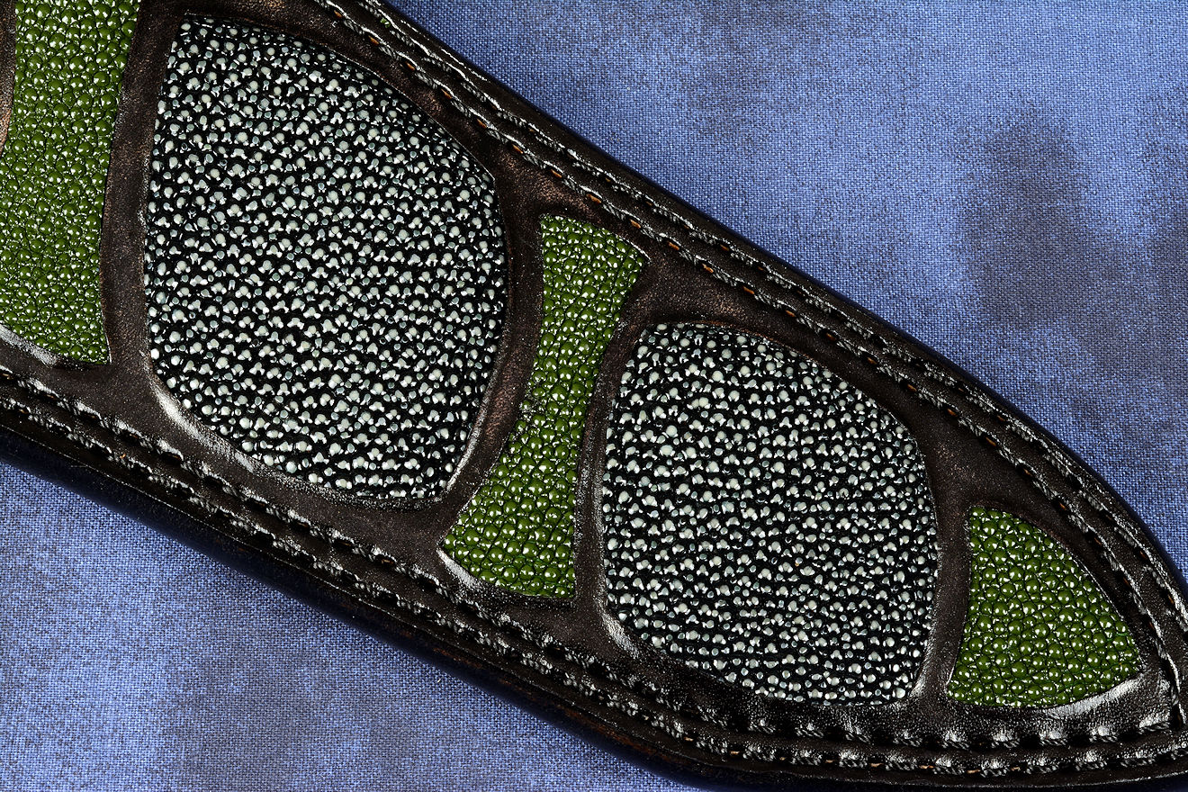 inlays of green and black ray skin in hardened and thick 10 oz.