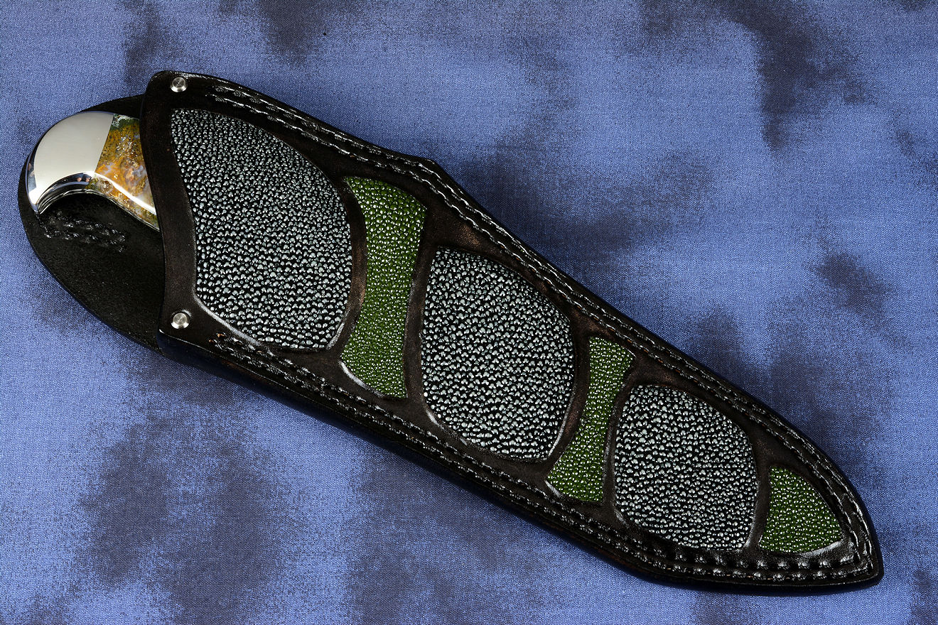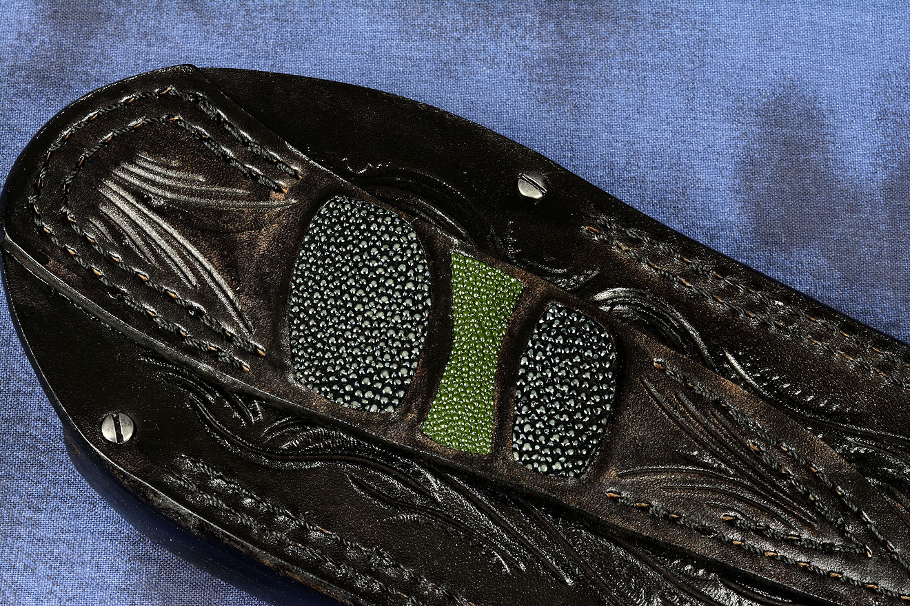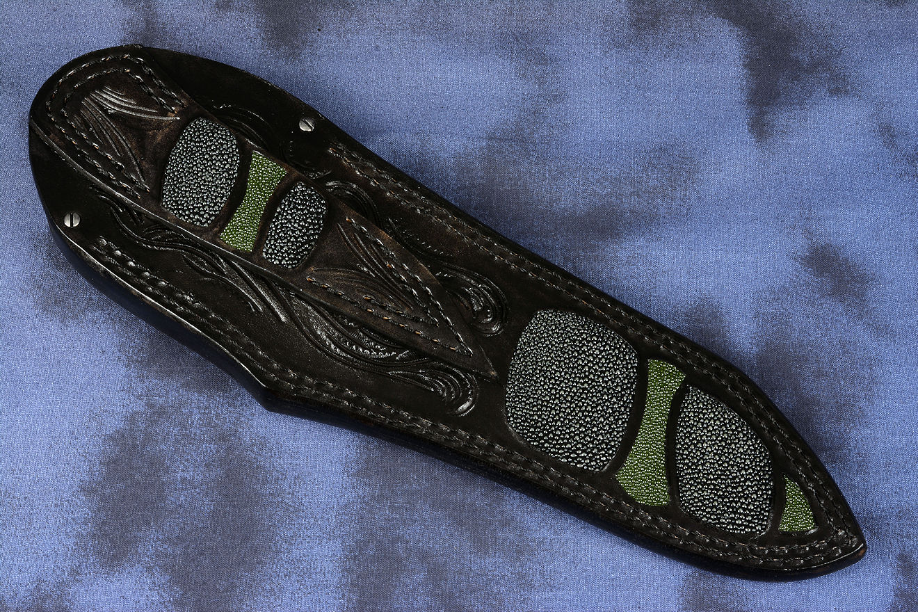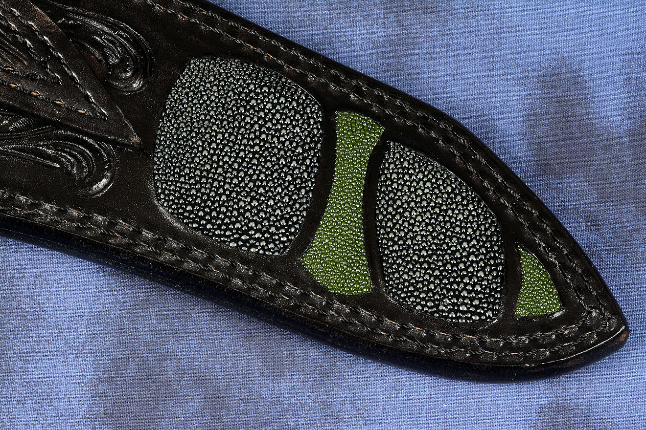 - Sheath: Hand-carved, hand-dyed Leather Shoulder inlaid with green, black ray skin, nylon stitching, stainless steel welt screws