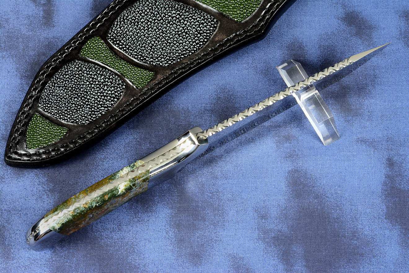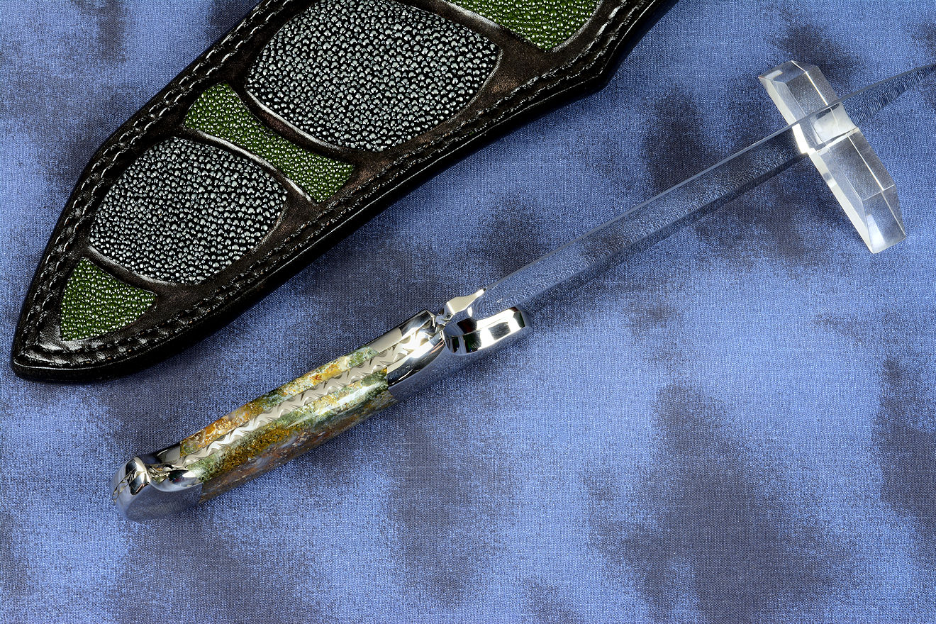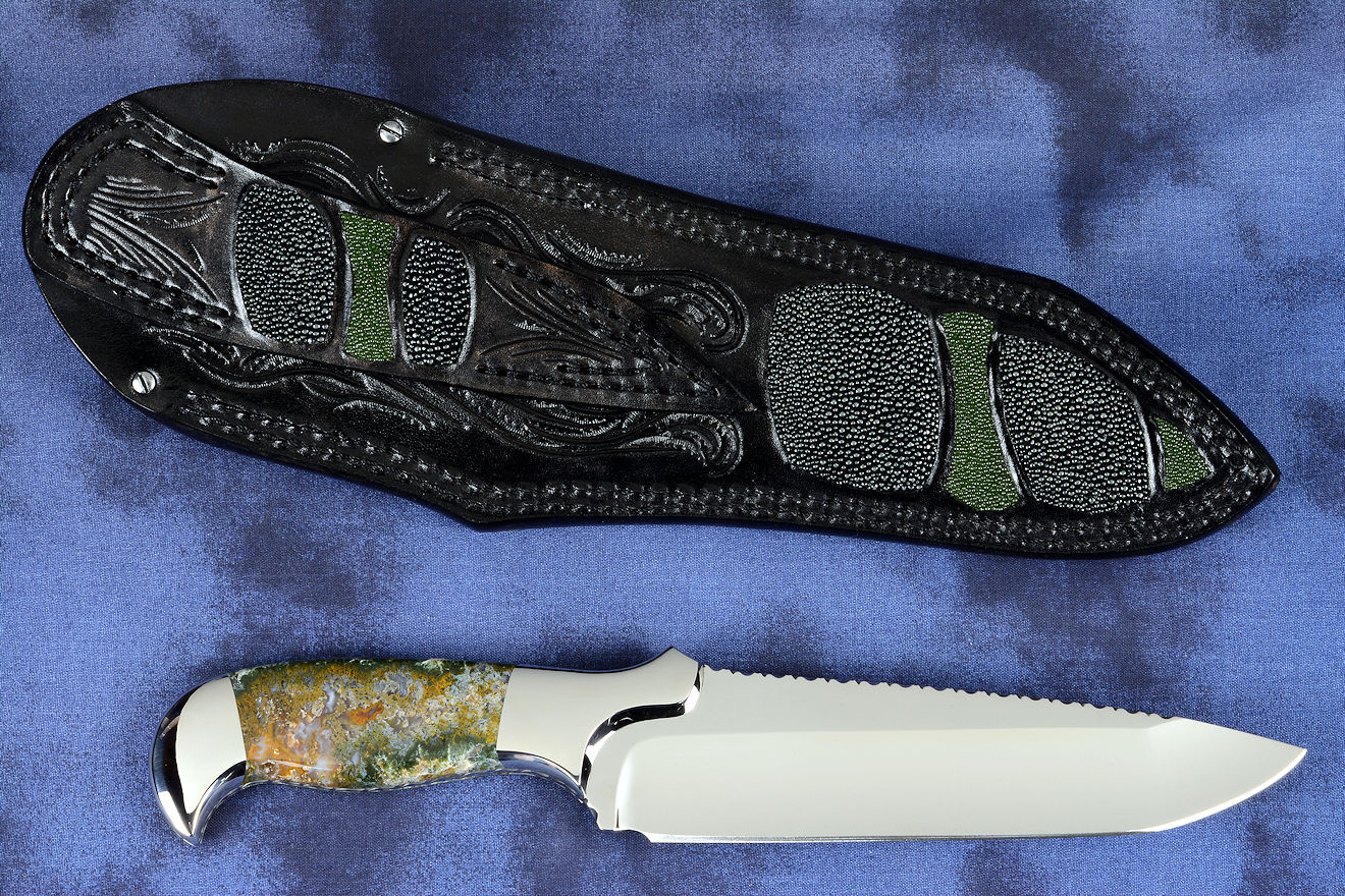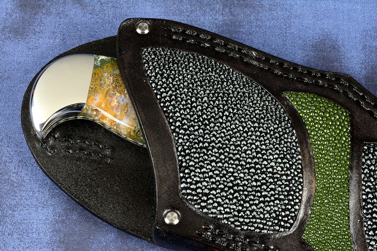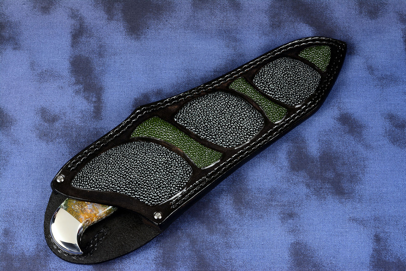 - Sheath: Hand-carved, hand-dyed Leather Shoulder inlaid with green, black ray skin, nylon stitching, stainless steel welt screws