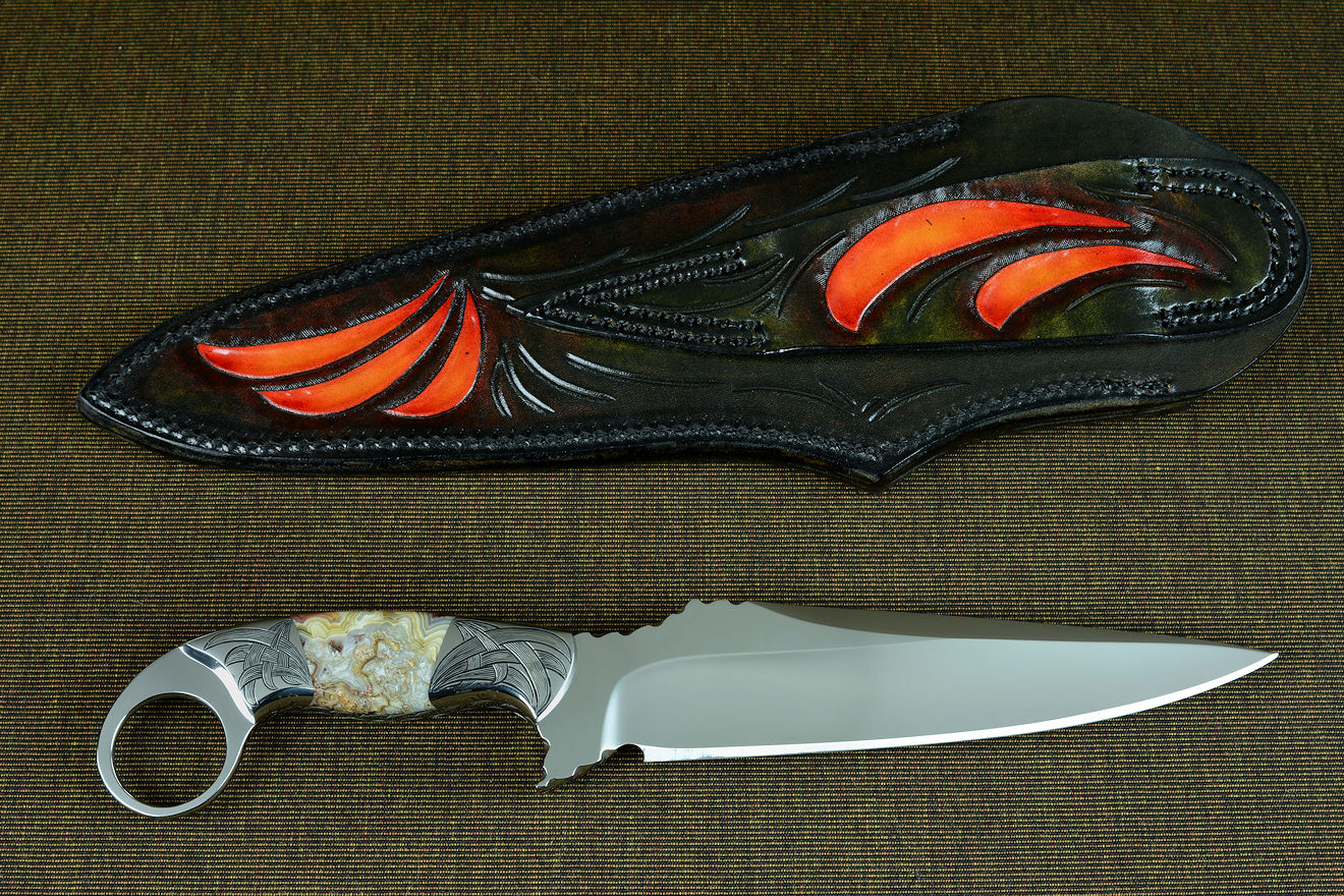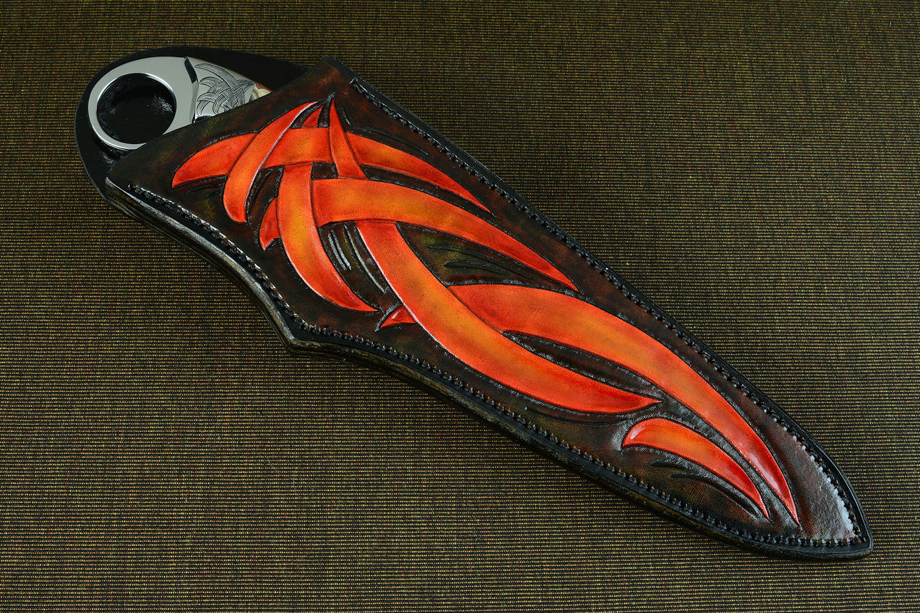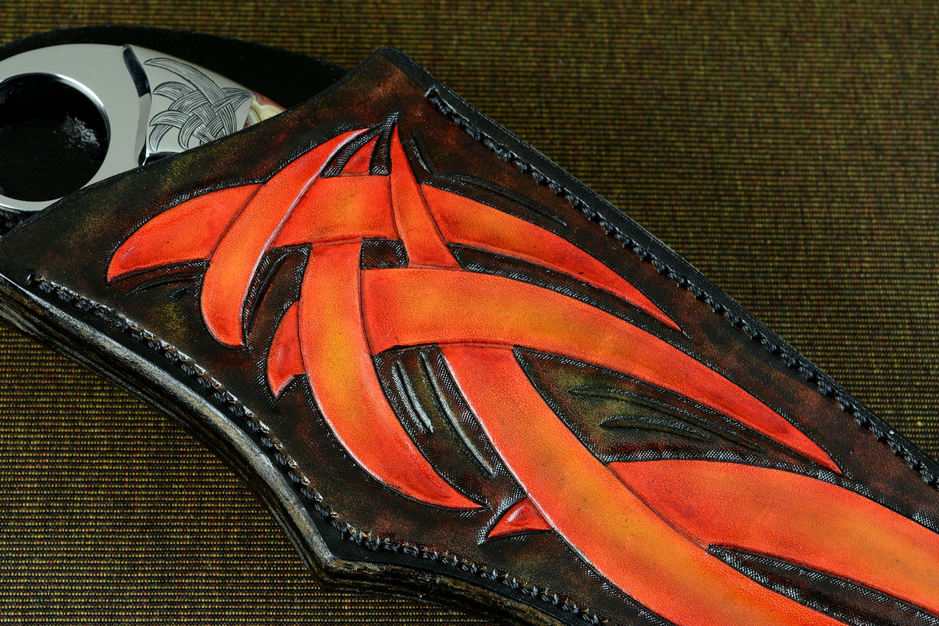 - Sheath: Hand-carved, Hand-dyed Leather Shoulder, stitched with polyester