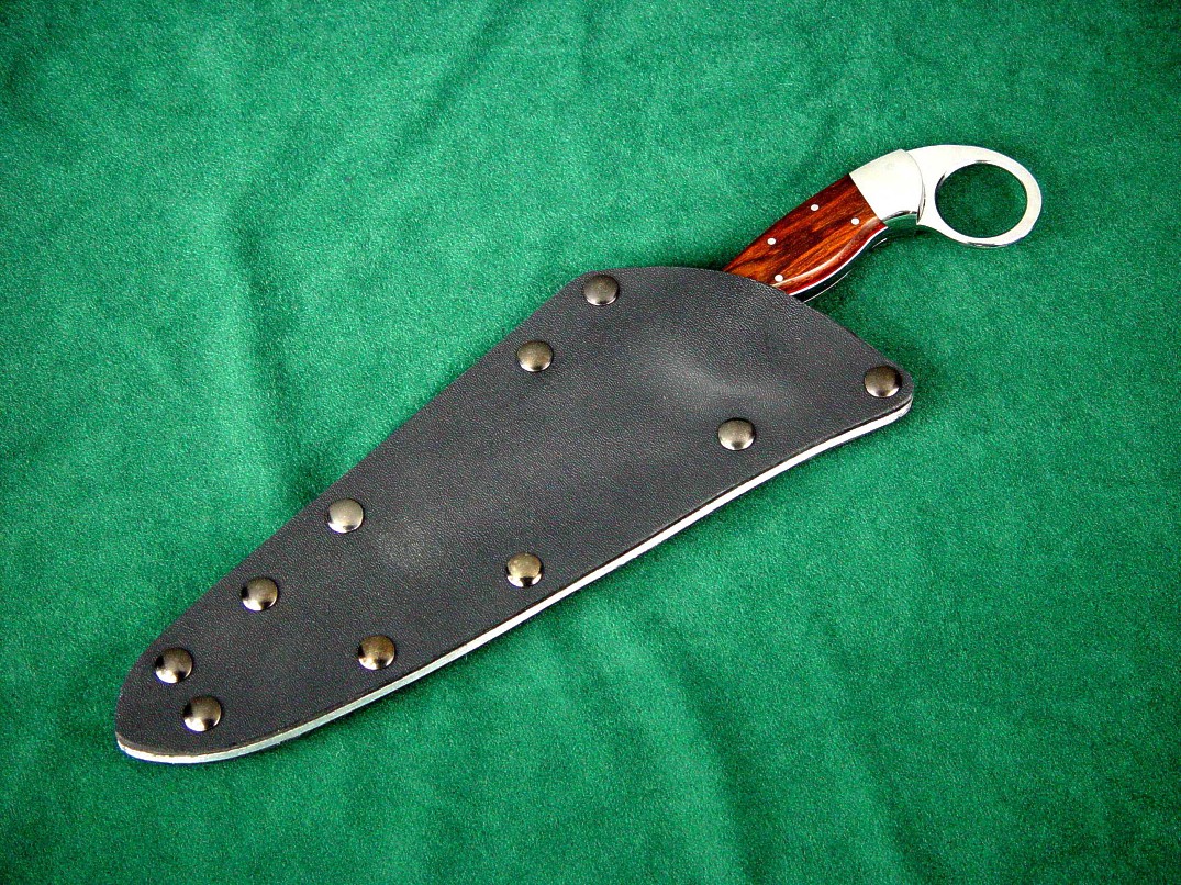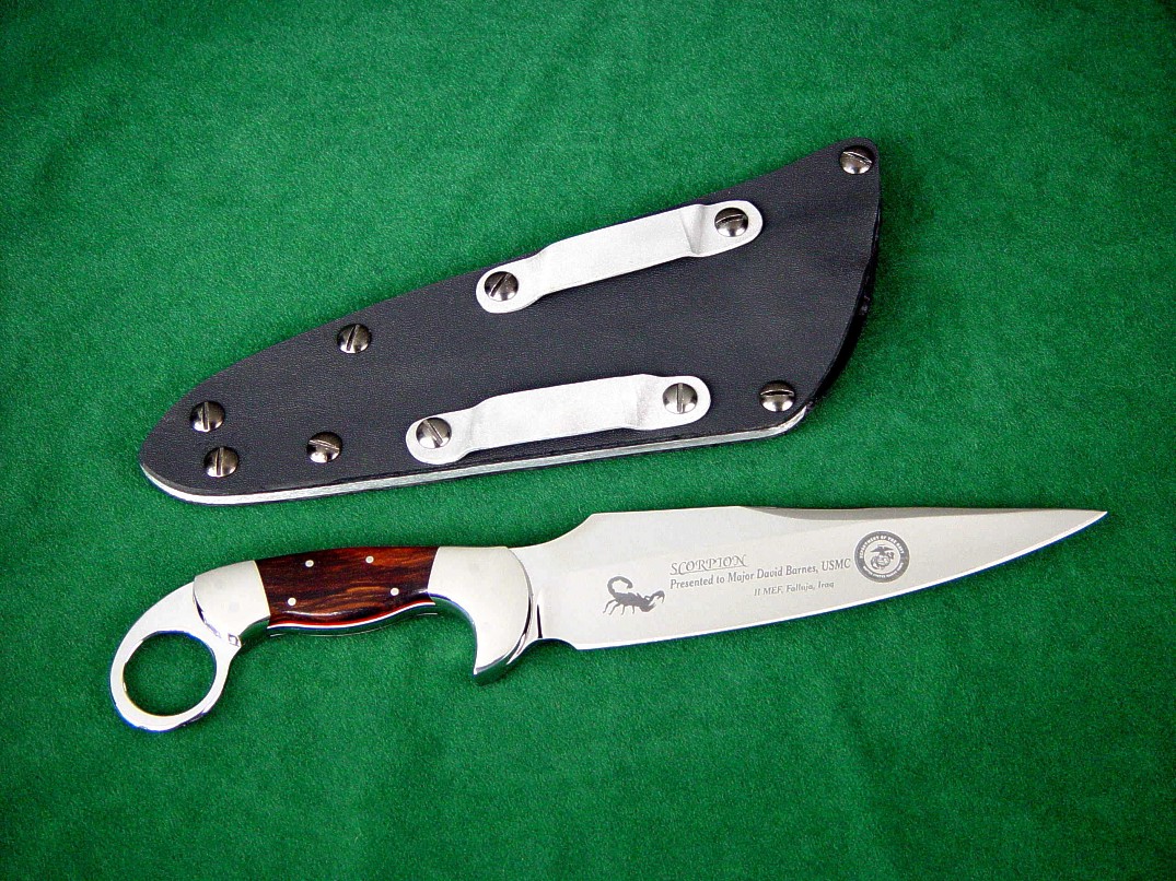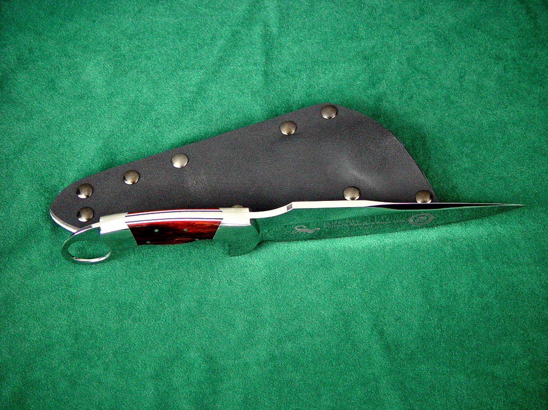 This Bulldog is custom made, with a mirror polished 440C high chromium martensitic stainless steel blade, custom etched, 304 high nickel, high chromium austenitic stainless steel bolsters, a Cocobolo hardwood handle with red, white, and blue spacers, and a kydex, aluminum, and blued steel combat sheath.