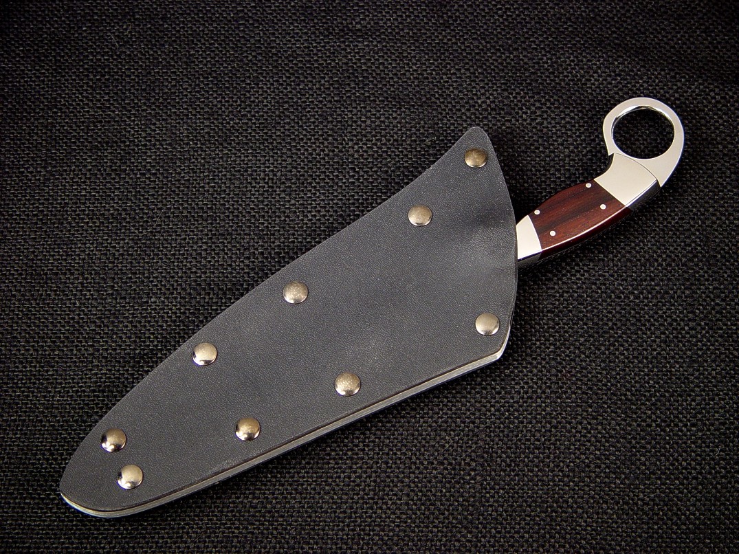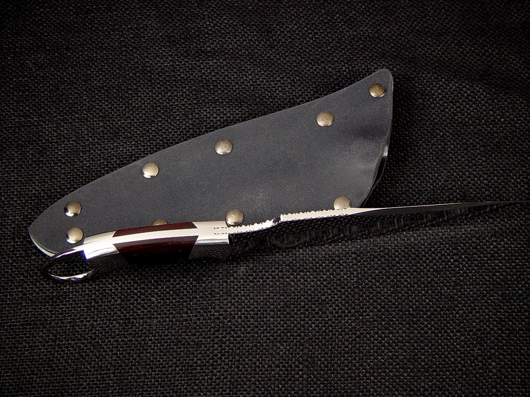 Another nice custom USMC Bulldog in mirror polished, hollow ground 440C high chromium martensitic stainless steel blade, 304 high chromium, high nickel austenitic stainless steel bolsters, Madagascar Rosewood hardwood handle, and black double thickness kydex over 5052H32 corrosion resistant, high strength aluminum welt frame secured with blued steel Chicago screws.