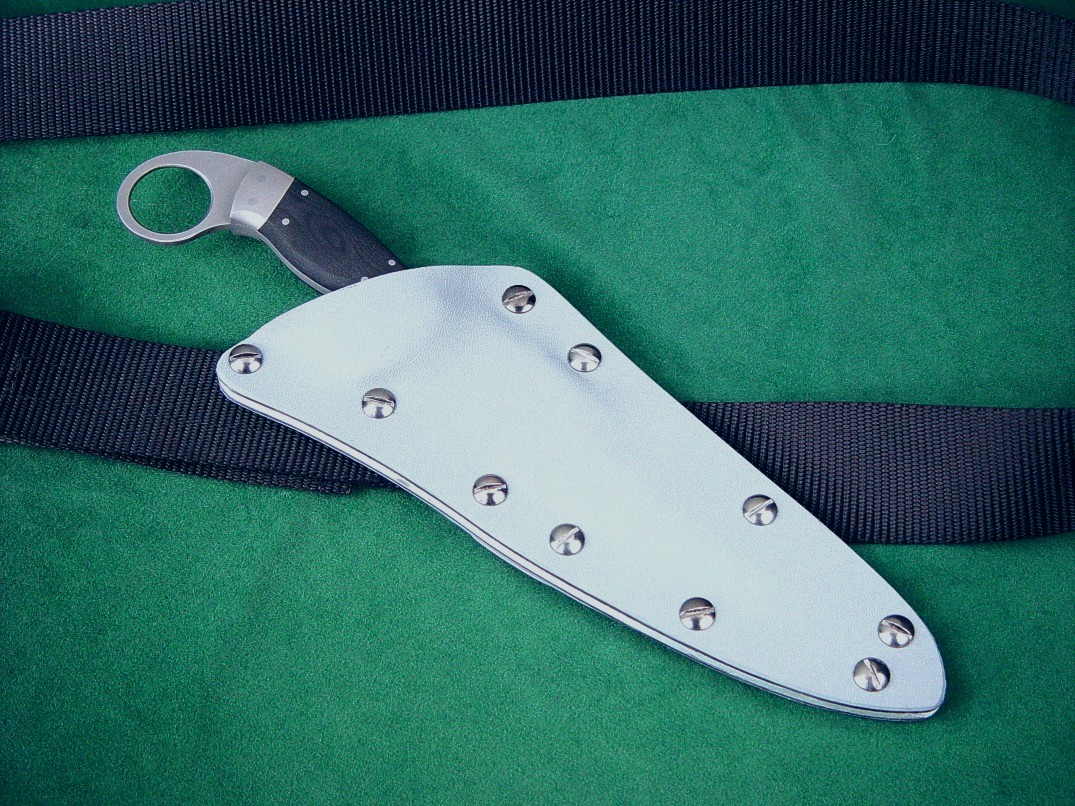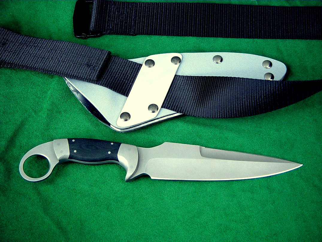 The original "Bulldog" tactical combat knife designed for an infantryman in the 101st Airborne for his use in combat in Iraq. This man happens to be my son, who served two combat tours of duty in Operation Iraqi Freedom, and of who I'm very proud. The blade is bead blasted D2 extremely high carbon die steel, for the ultimate in wear resistance, hollow ground and double edged with half length top edge. The spine is thick and substantial the bolsters are zero care 304 austenitic stainless steel for the greatest longevity and toughness with the highest corrosion resistance. The bolsters are dovetailed and bed a pair of linen reinforced Micarta phenolic handle scales, secured with 304 stainless steel pins. The finger ring is contoured and well shaped, the handle locks positively in the reverse grip position. The sheath is gray double thickness kydex over a 5052H32 corrosion resistant, high strength aluminum welt frame, with nickel plated steel Chicago screws for strength and corrosion resistance. This is one tough, strong, and durable tactical combat knife.