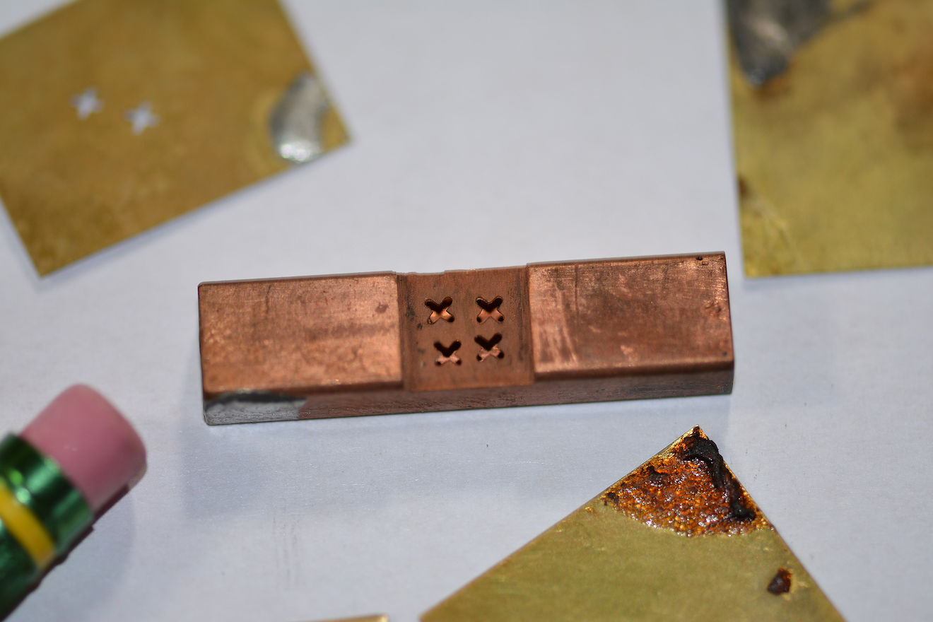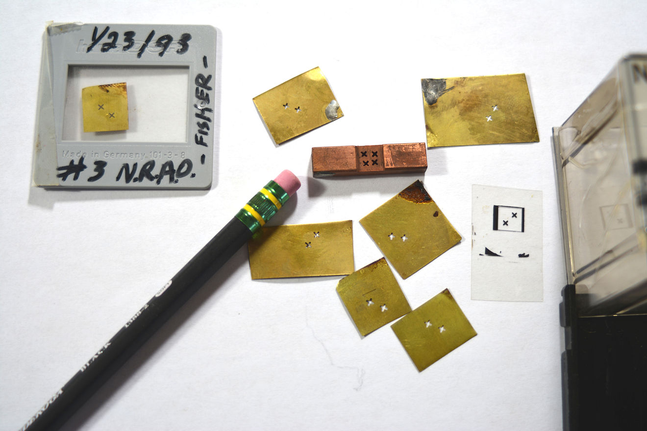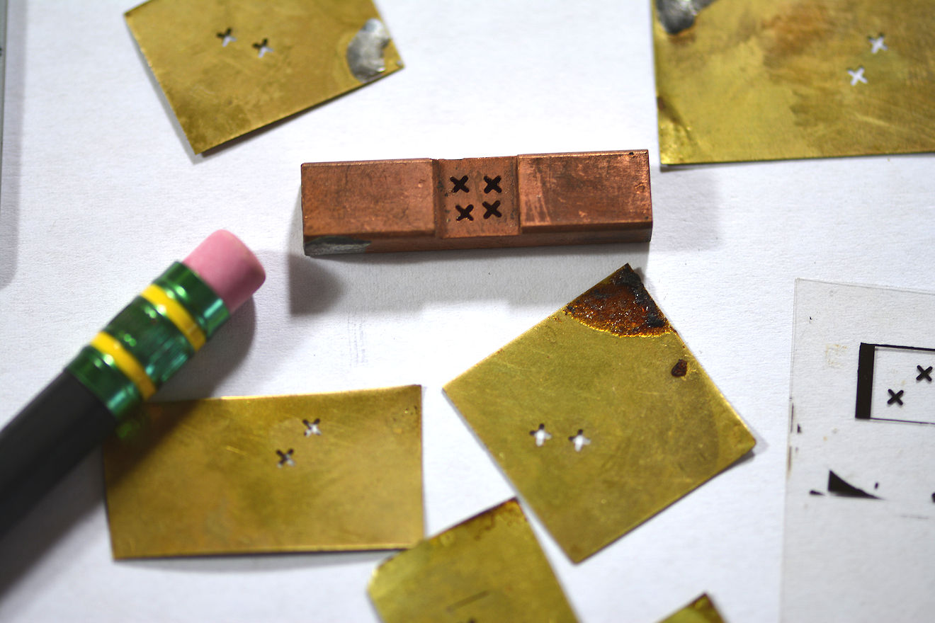 I thought I could help, and I worked for about a week to come up with a photochemical process of photochemical milling, based on the chemistry that I was using for etching my maker's mark on my knife blades. I used a transmissive blueprint that he supplied reduced it through enlarger process, and was able to etch the waveguide filters. When we presented these to the scientists and engineers, they claimed that they were a bit too small! Though they didn't use my work, they told us they would go with the idea of photochemically milling these in the future when they needed smaller filters.