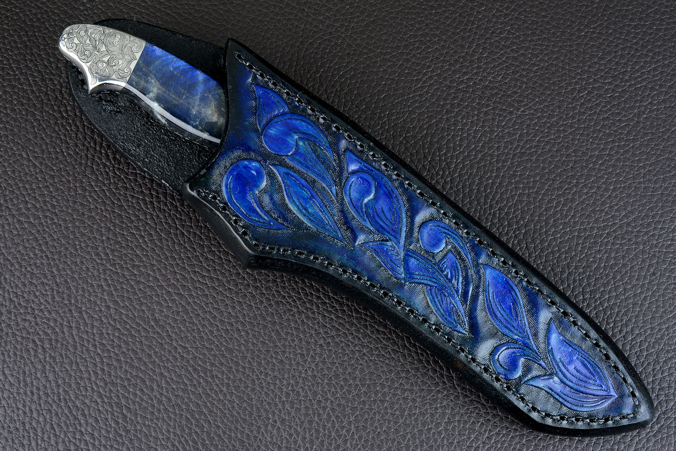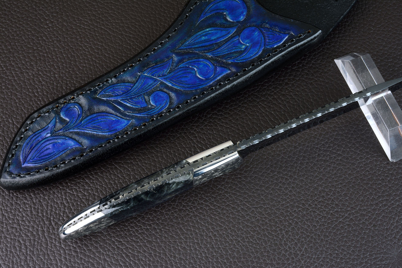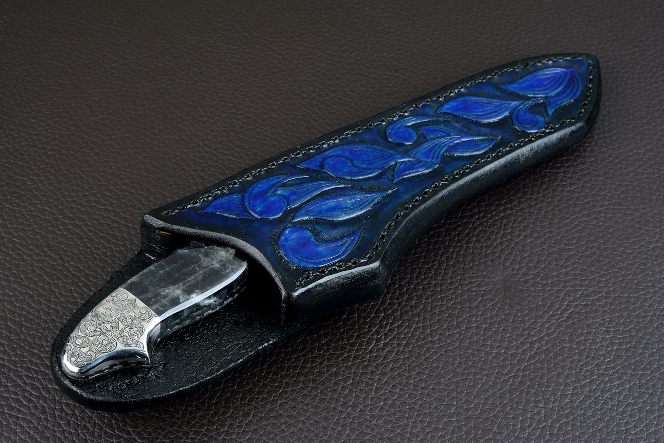 - Sheath: Hand-carved leather shoulder, hand-dyed