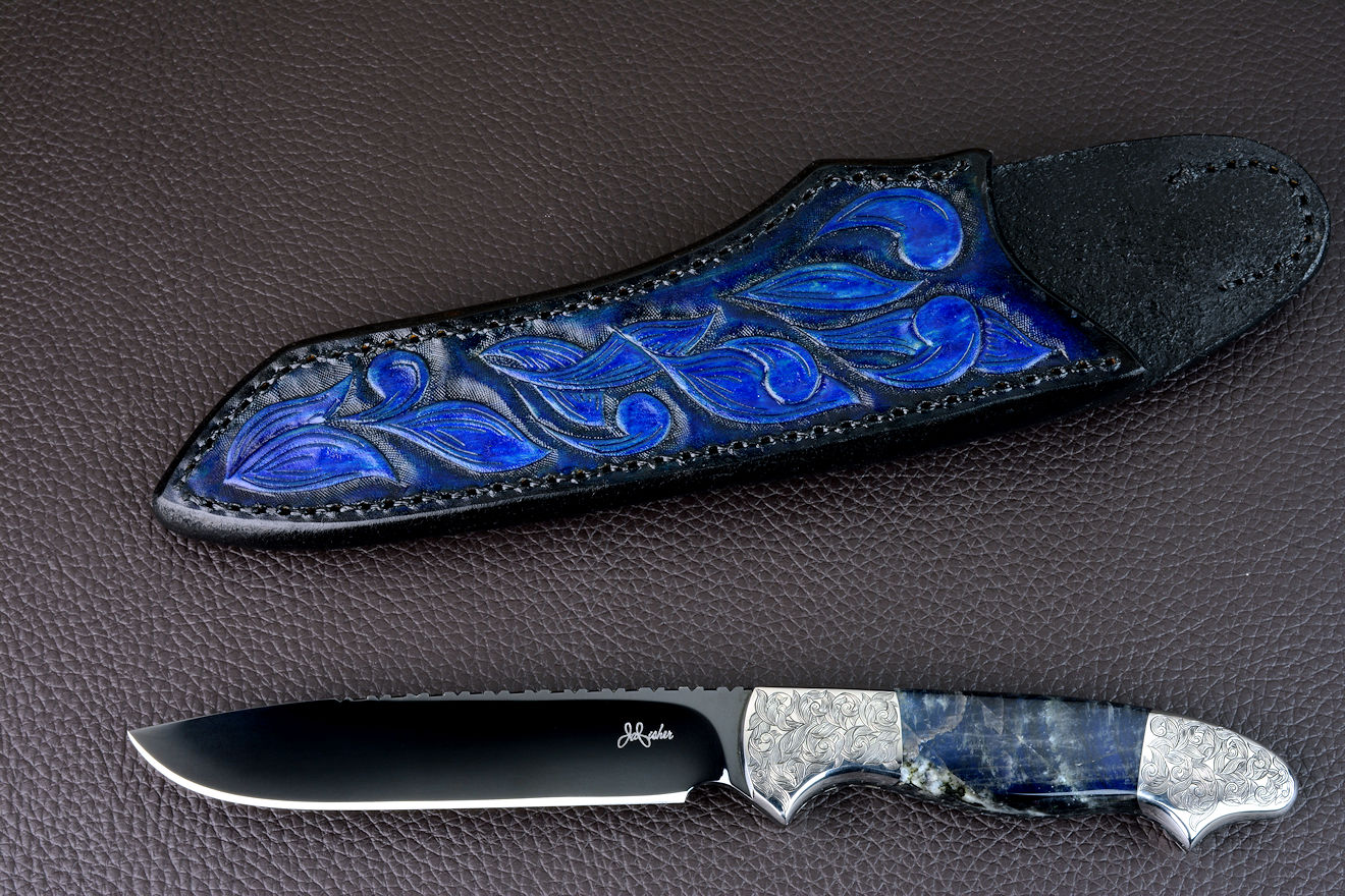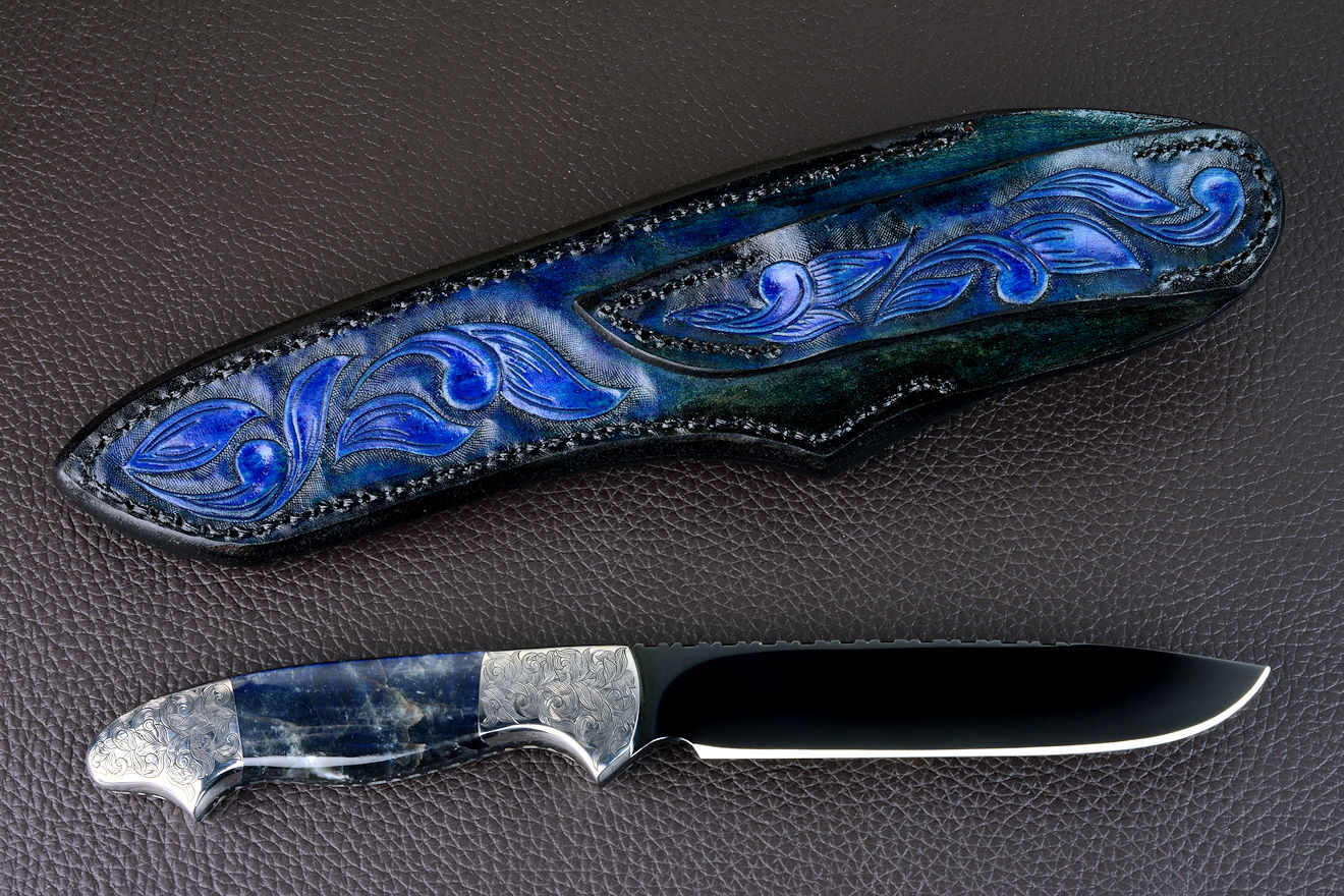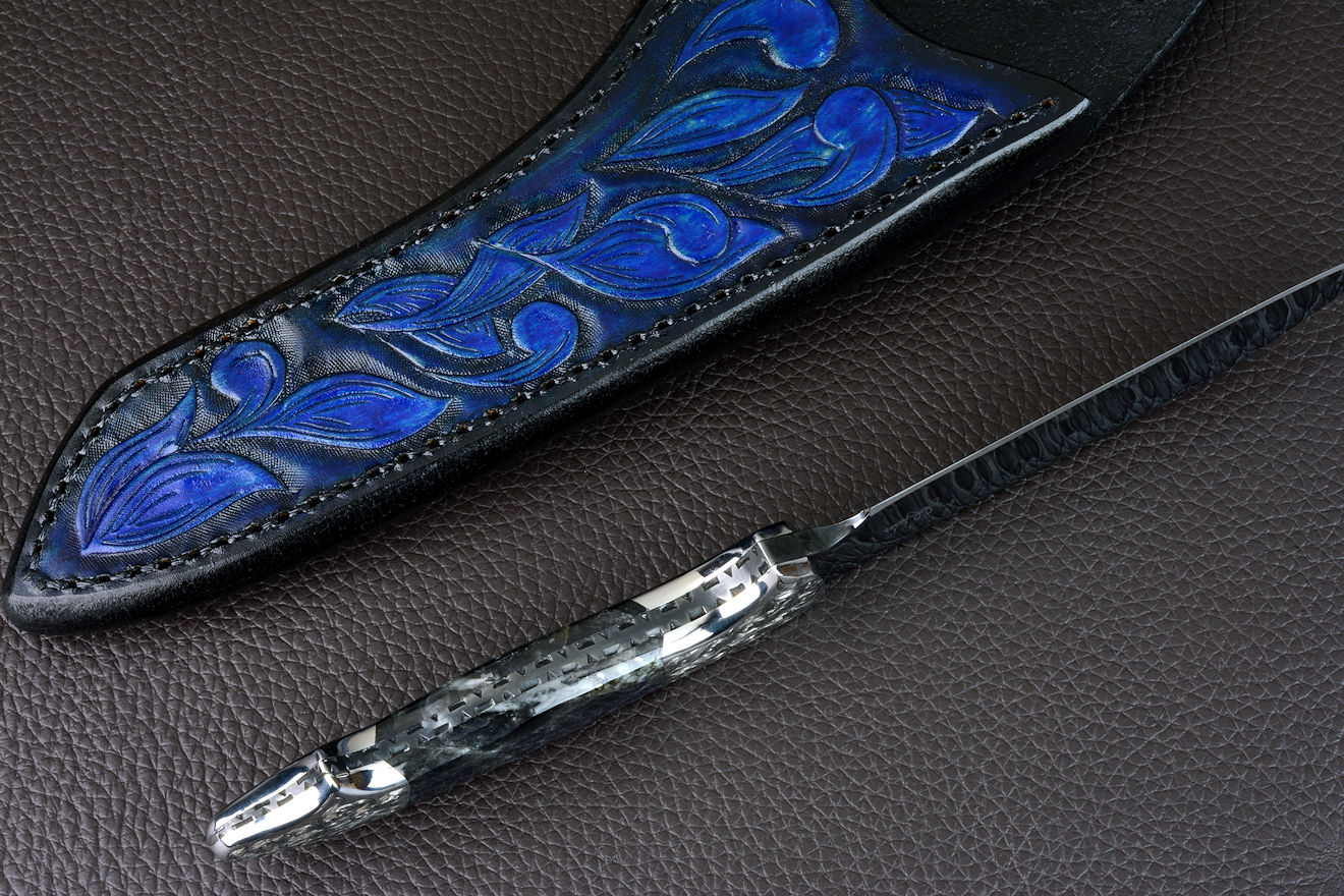 - Sheath: Hand-carved leather shoulder, hand-dyed