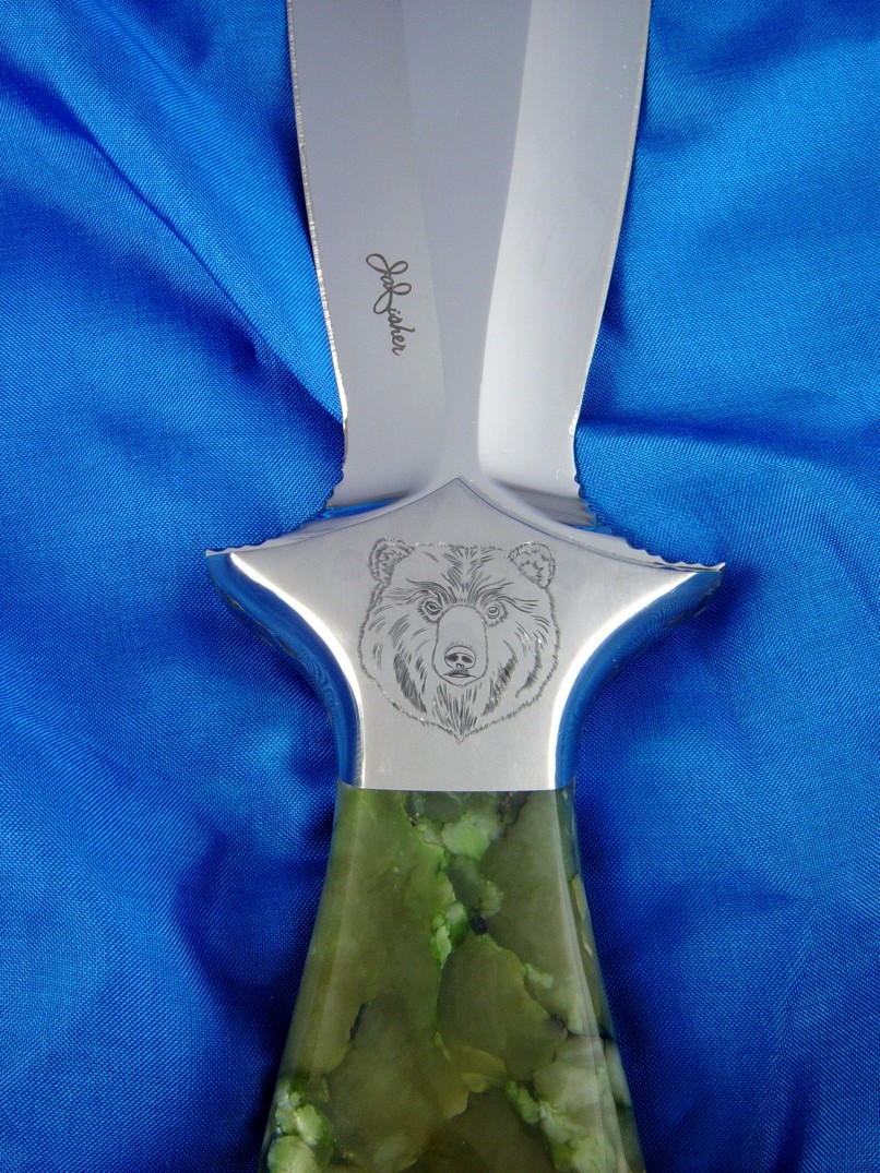 - Fittings/Bolsters: 304 Austenitic Stainless Steel, mirror polished, hand-engraved by Jay