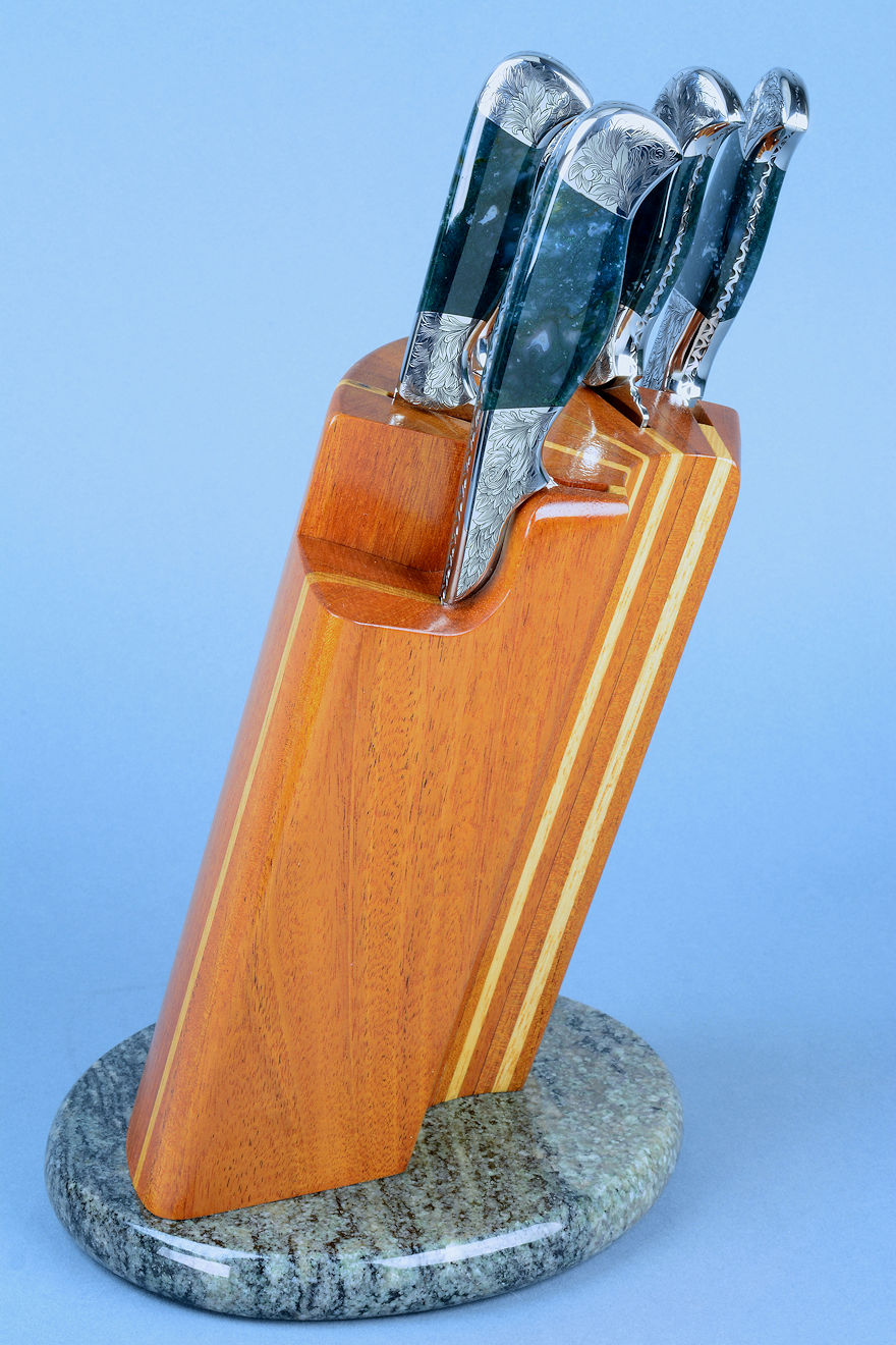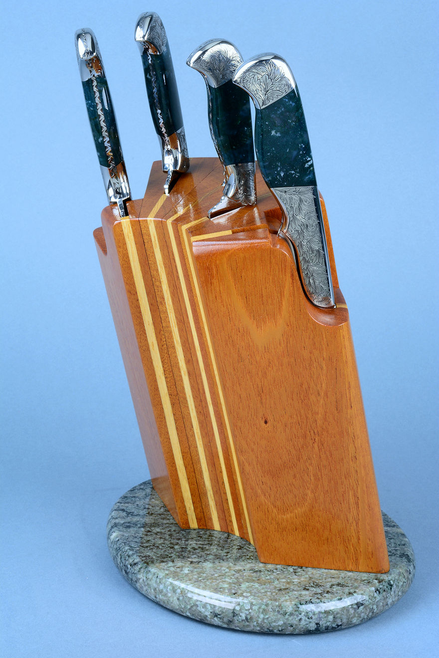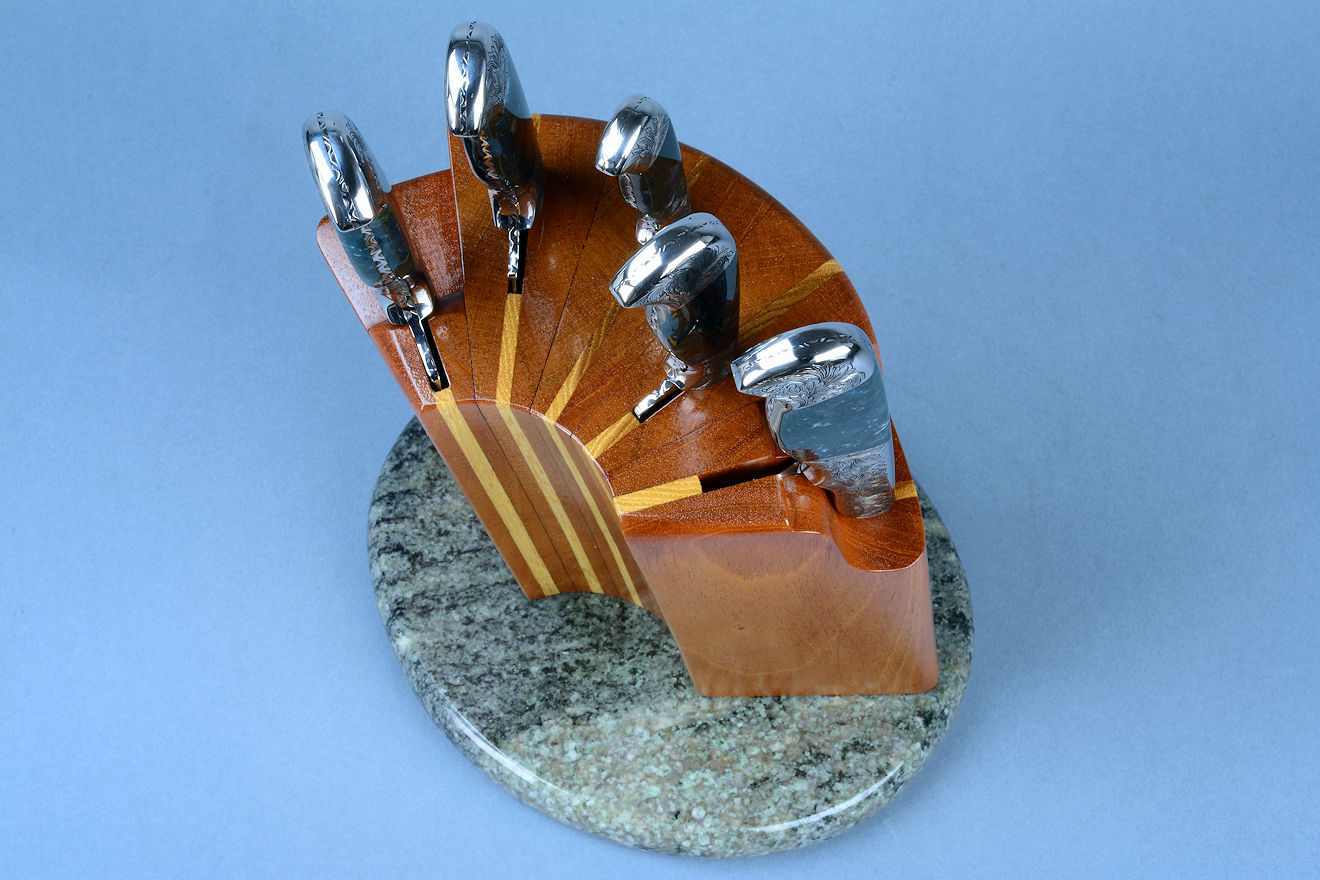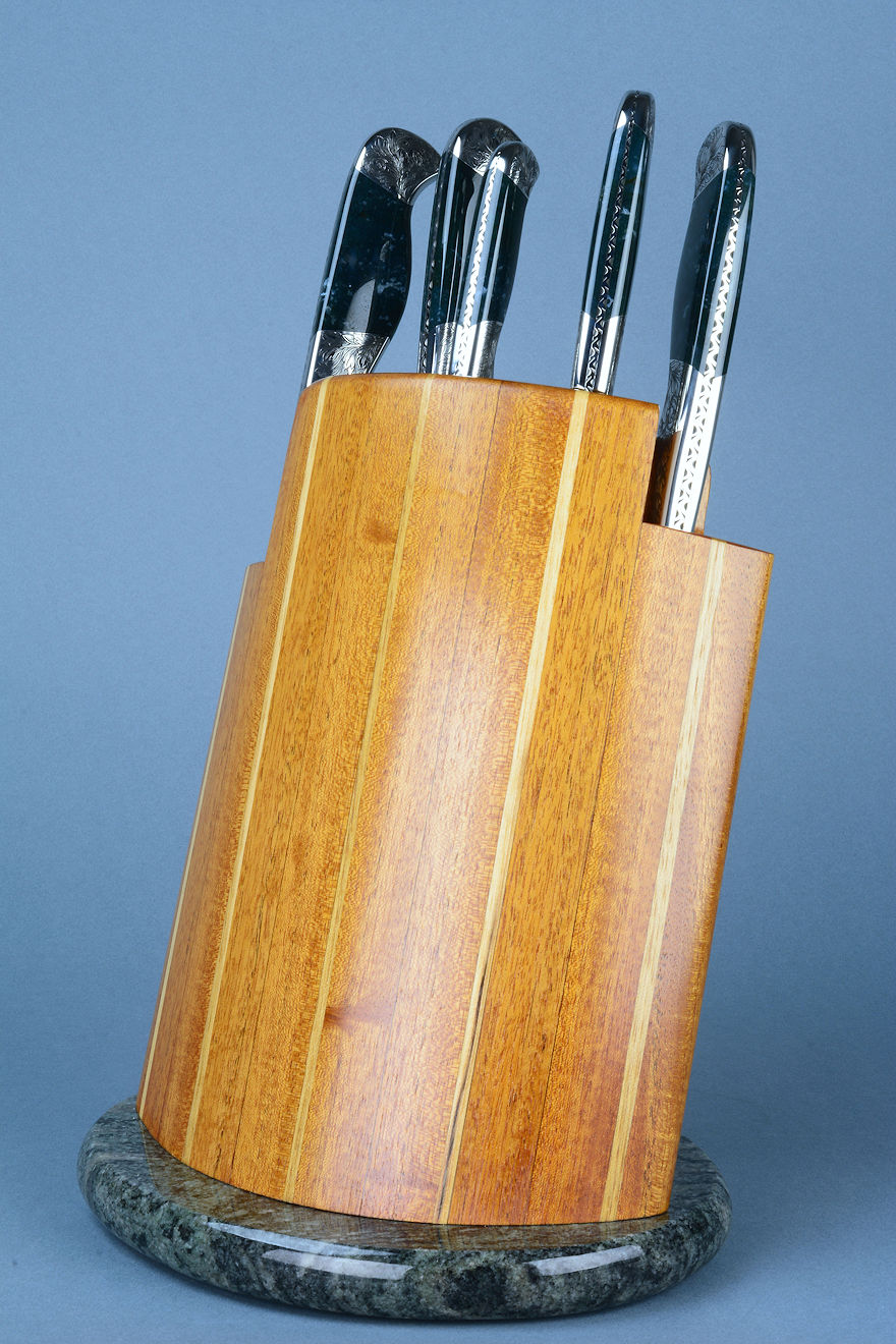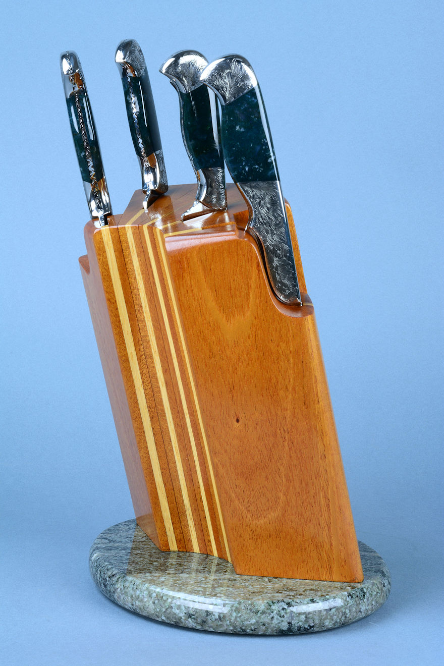 I created a radial design, so that the handles would be accessible and as close as possible, yet allowing the knives easy extraction from the block, with no cutting edges exposed. The size of the block was determined by the two largest blades in the set, and I placed them at the block ends. This required carved sockets to accommodate the extended front bolsters of the Shedar and Caph, while the smaller knives rest in the center. The hardwoods are sealed with Tung oil and resins, and coated with a clear lacquer for easy cleaning. The blades are not tight in the slips, they move in and out with ease.