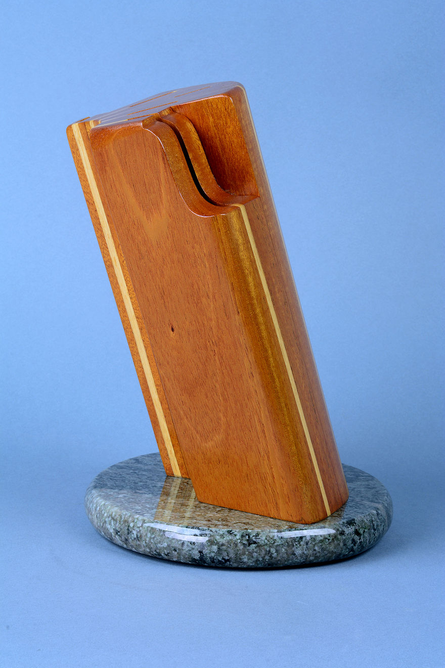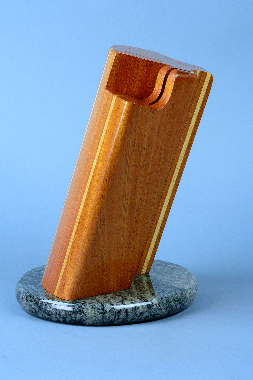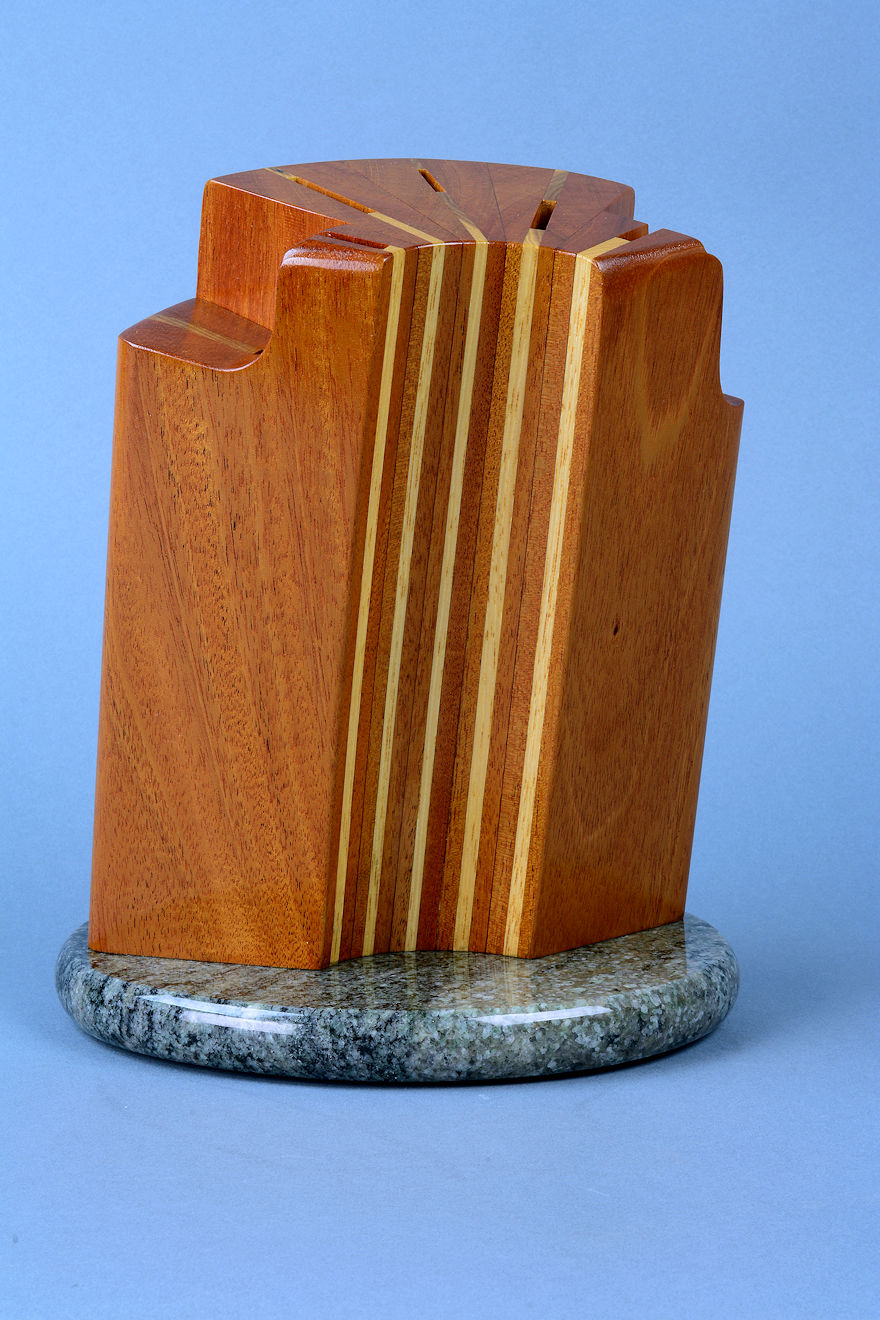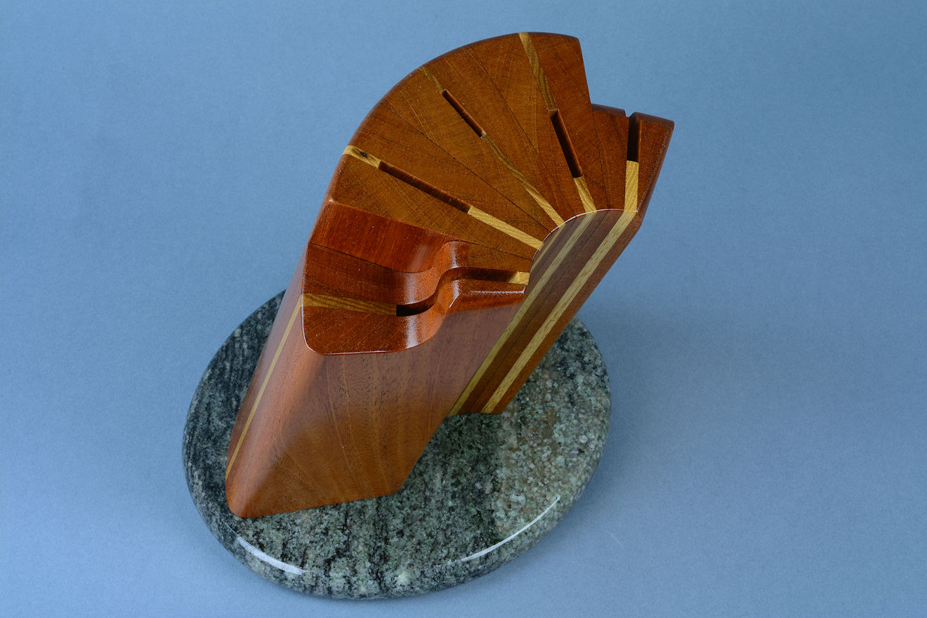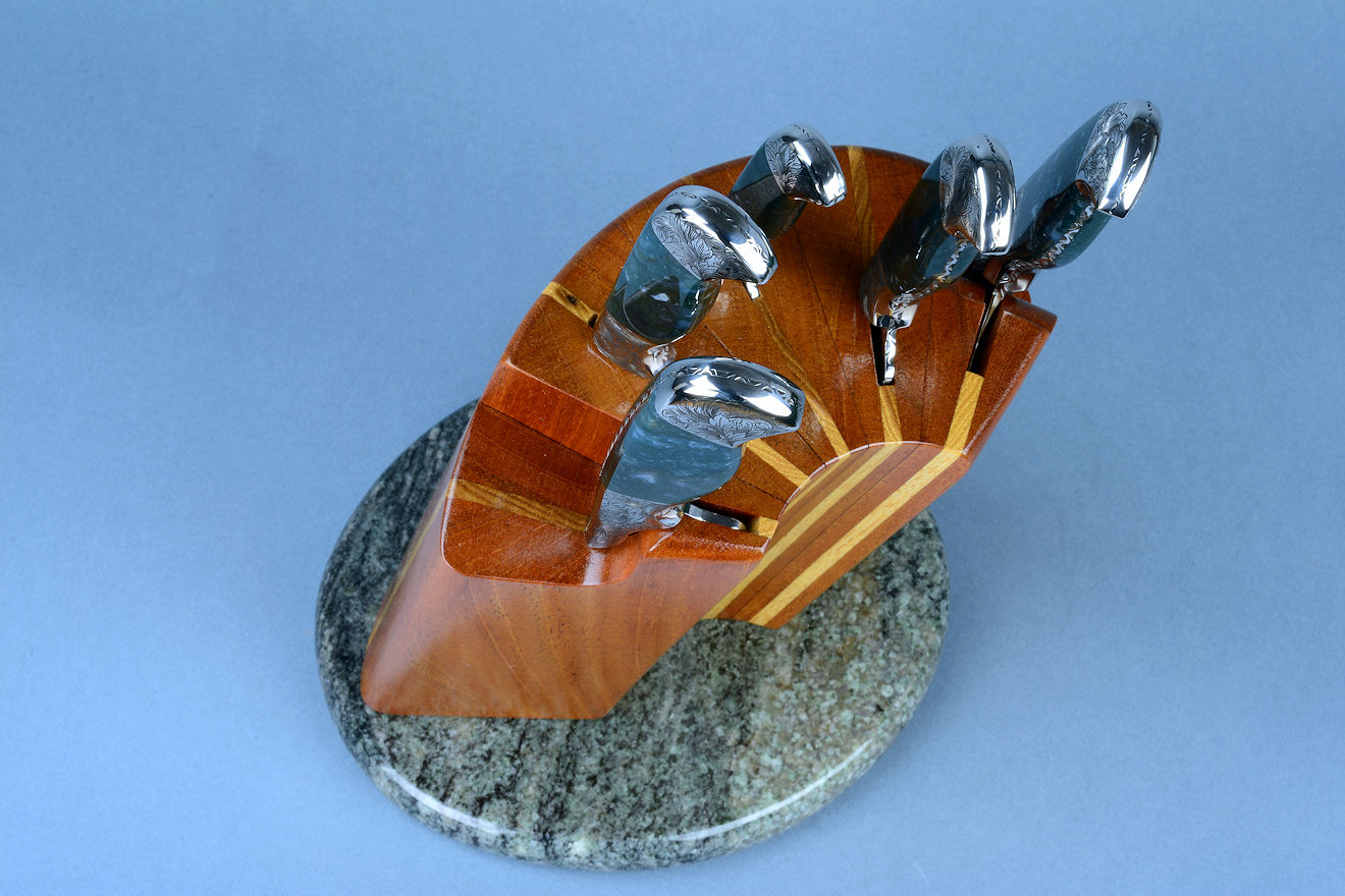 I created a radial design, so that the handles would be accessible and as close as possible, yet allowing the knives easy extraction from the block, with no cutting edges exposed. The size of the block was determined by the two largest blades in the set, and I placed them at the block ends. This required carved sockets to accommodate the extended front bolsters of the Shedar and Caph, while the smaller knives rest in the center. The hardwoods are sealed with Tung oil and resins, and coated with a clear lacquer for easy cleaning. The blades are not tight in the slips, they move in and out with ease.