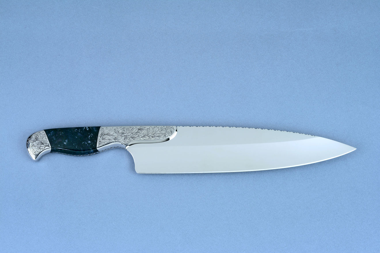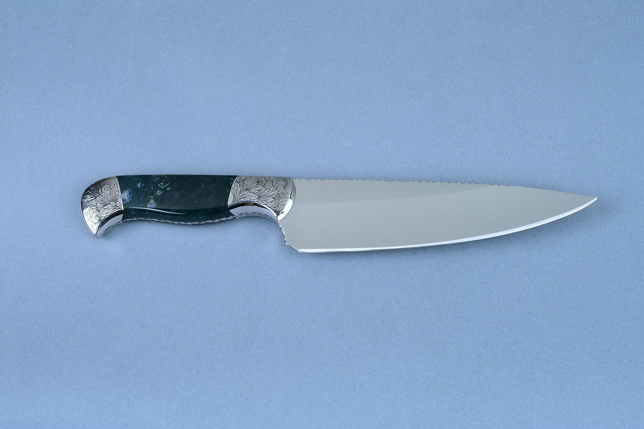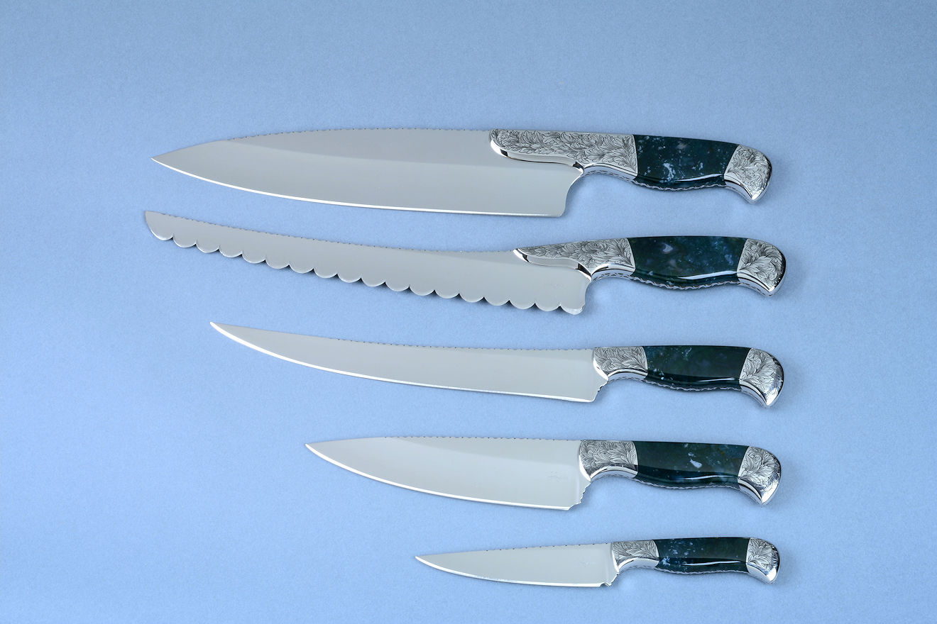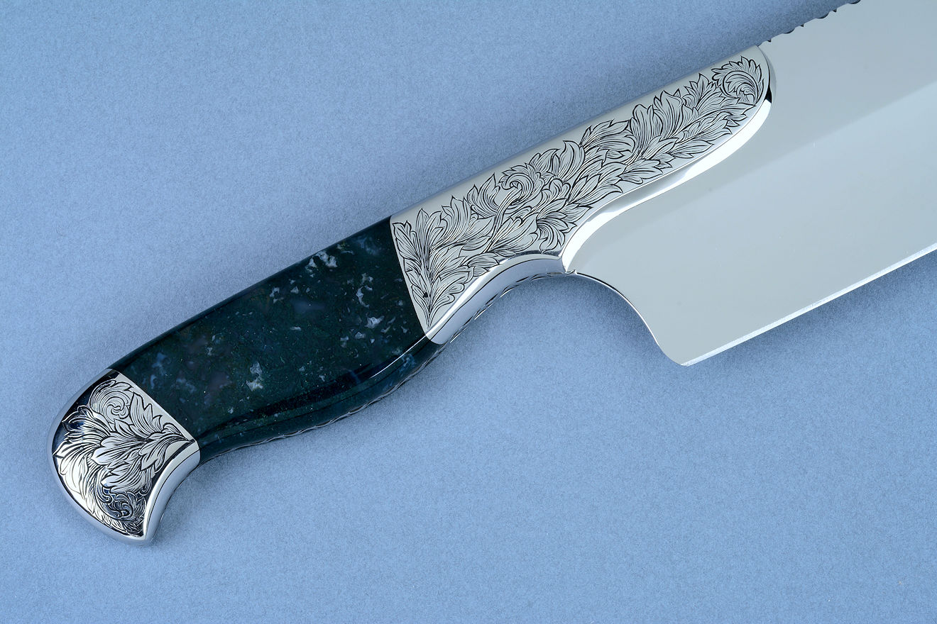 All of the knives are embellished with Acanthus leaves, as requested by my client. This was quite a bit of work, since all bolsters are 304 stainless steel. 304 is also known as 18-8 stainless, due to 18 percent chromium and 8 percent nickel in the alloy. It's an austenitic stainless steel that is used to make stainless nuts, bolts, and fasteners and is extremely tough. This is absolutely zero-care stainless steel, and, like the blade is completely Food Contact Safe. The bolsters are sealed in contact with the tang, and all surfaces are contoured, rounded, polished, and finished for a wonderful feel. They are attached with multiple zero-clearance peened pins for permanence; they will never, ever yield. They are dovetailed to bed the gemstone handle scales.