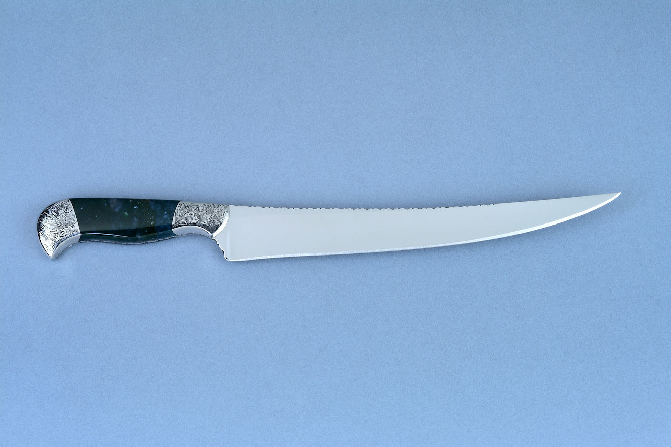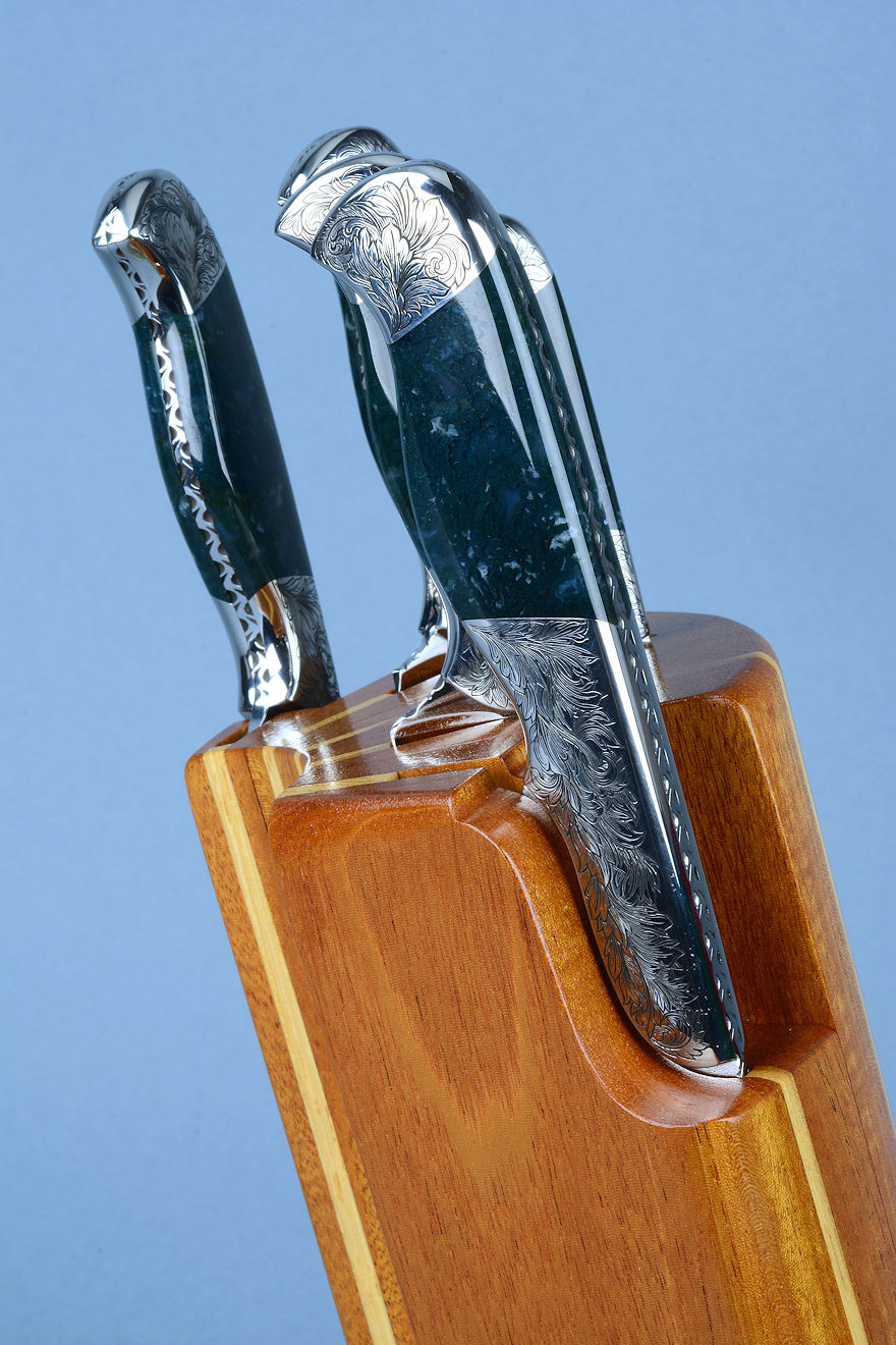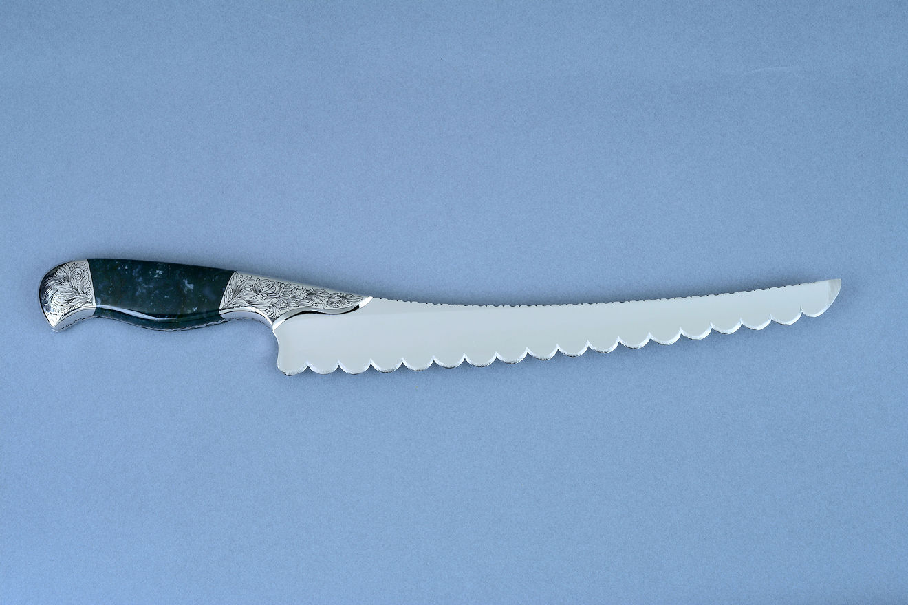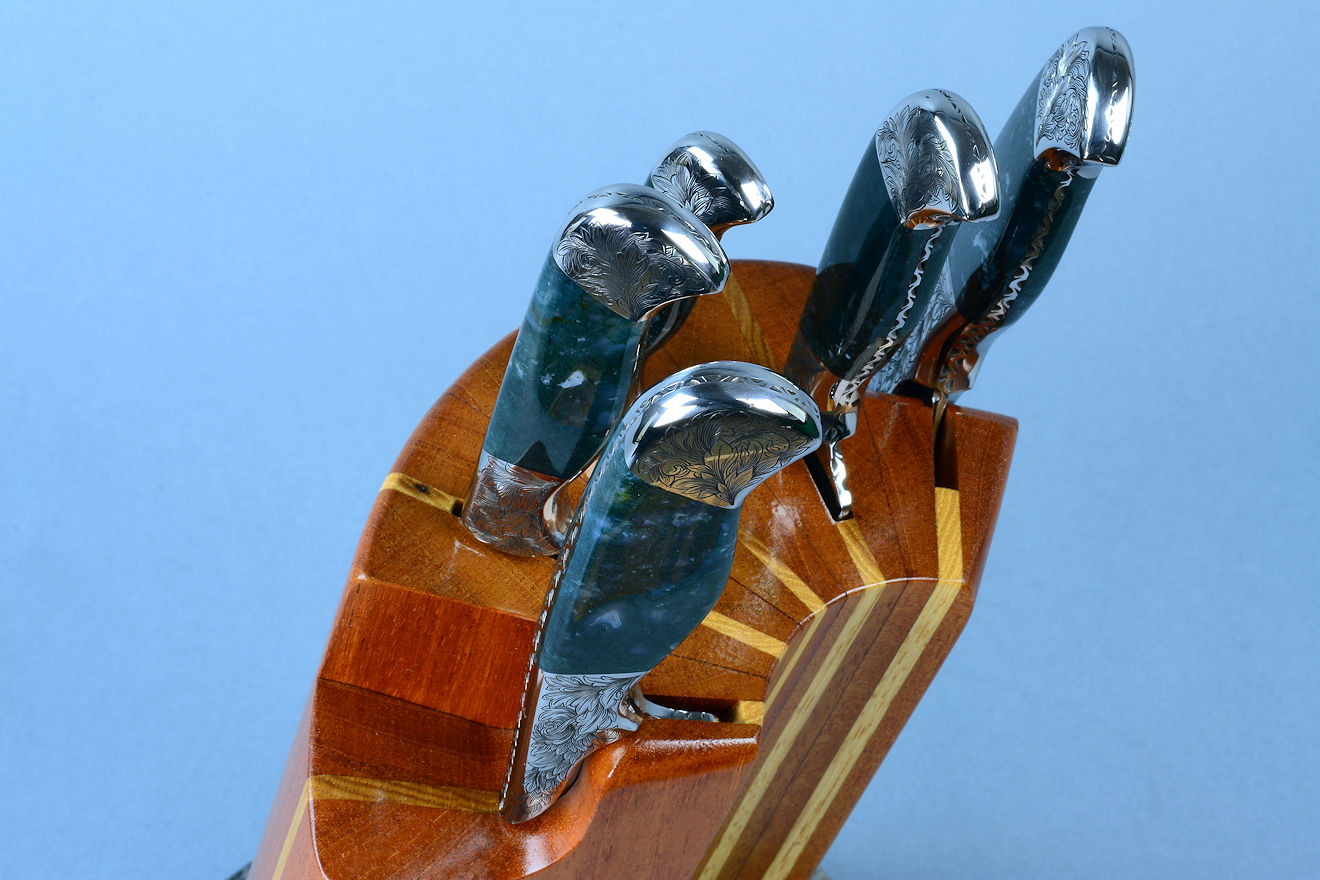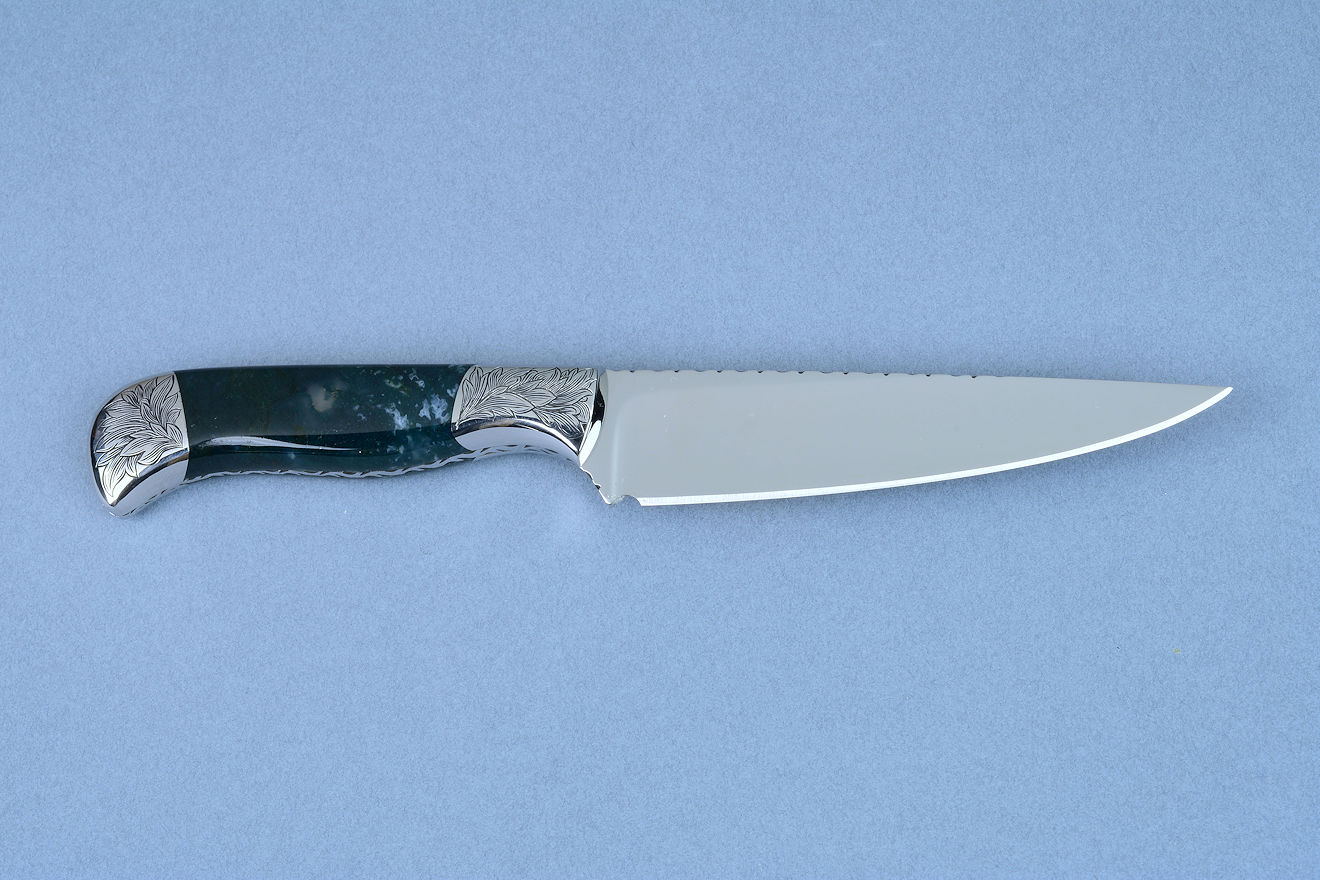 All of the knives are embellished with Acanthus leaves, as requested by my client. This was quite a bit of work, since all bolsters are 304 stainless steel. 304 is also known as 18-8 stainless, due to 18 percent chromium and 8 percent nickel in the alloy. It's an austenitic stainless steel that is used to make stainless nuts, bolts, and fasteners and is extremely tough. This is absolutely zero-care stainless steel, and, like the blade is completely Food Contact Safe. The bolsters are sealed in contact with the tang, and all surfaces are contoured, rounded, polished, and finished for a wonderful feel. They are attached with multiple zero-clearance peened pins for permanence; they will never, ever yield. They are dovetailed to bed the gemstone handle scales.