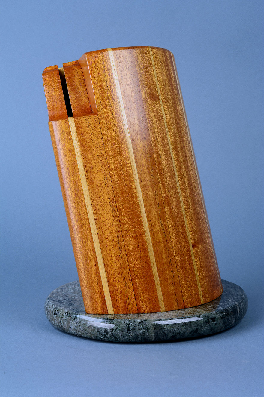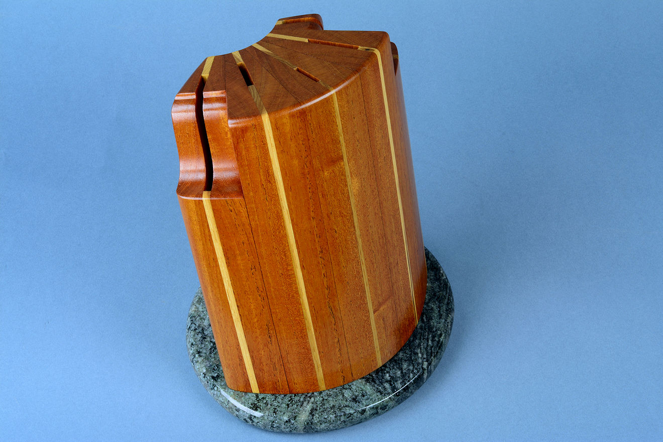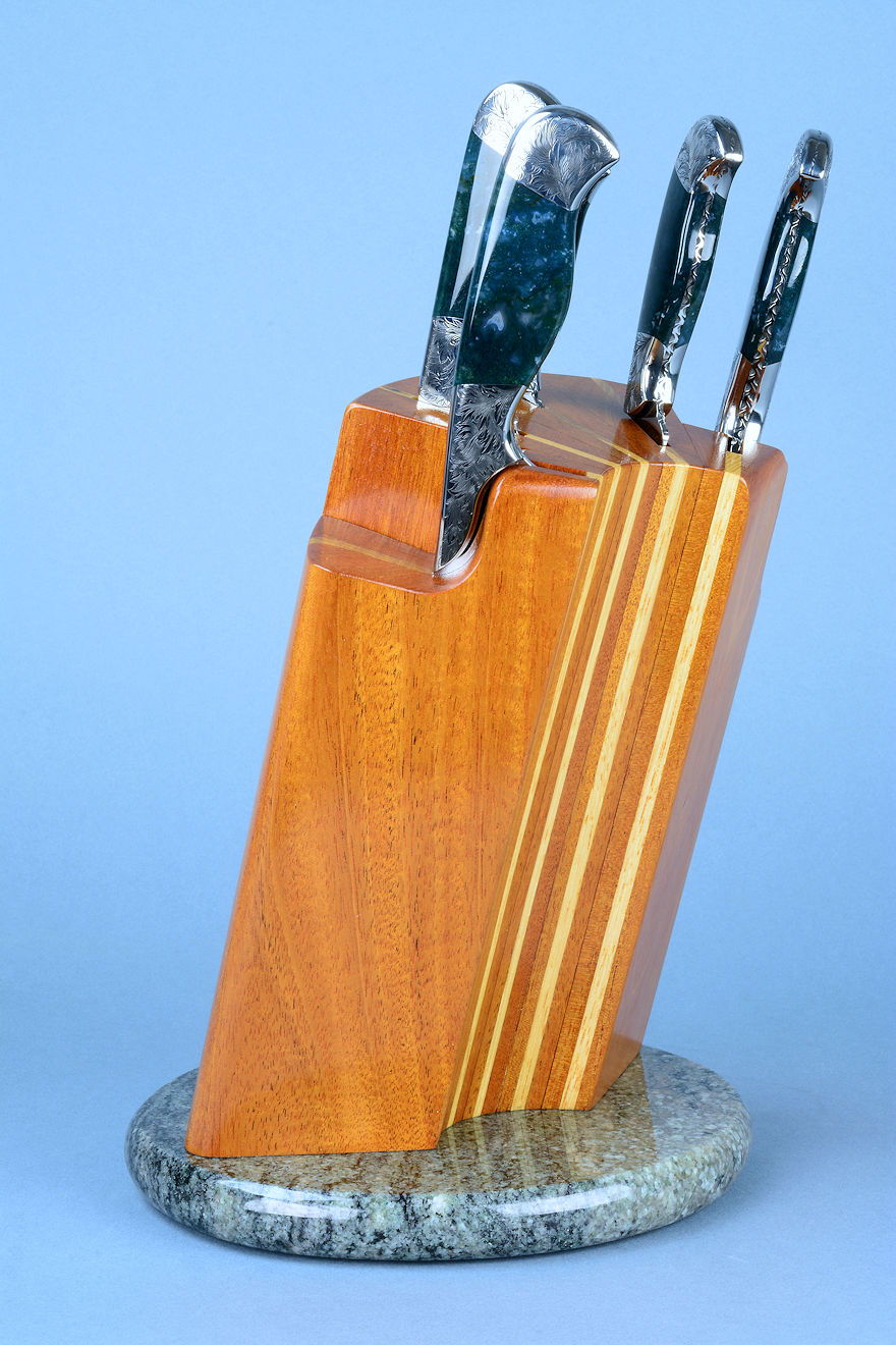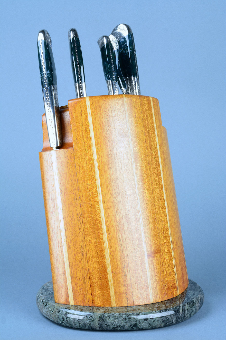The block is angled so that the knives have as little height as possible, yet are easily extracted without reaching high above the block. The block is screwed solidly with stainless steel screws to the granite base.