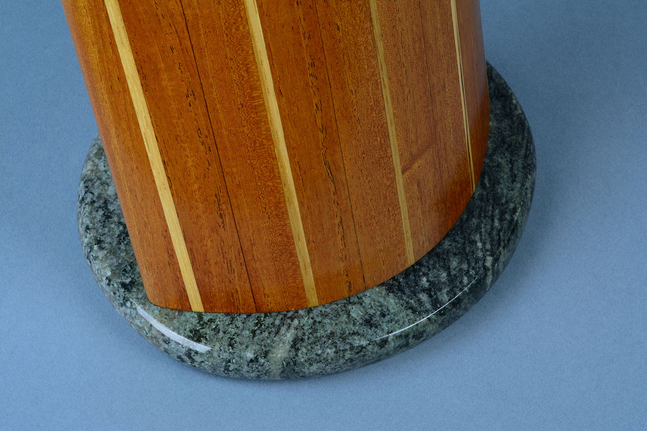 The base I chose for the Cassiopeia is Verde Maritaca Granite from Brazil. Verde Maritaca granite is actually a greenish-grey granite of the Precambrian period. It's a beautiful fit for the piece, echoing the multi-hued greens in the gemstone handles, and I created a tight oval shape, hand-finished the edges and top to a smooth, even polish that reflects the rounding of the handles. This is a zero-care granite, tough and durable, and as with all of the piece, the colors are completely natural and eternal.