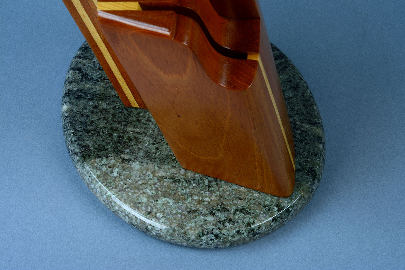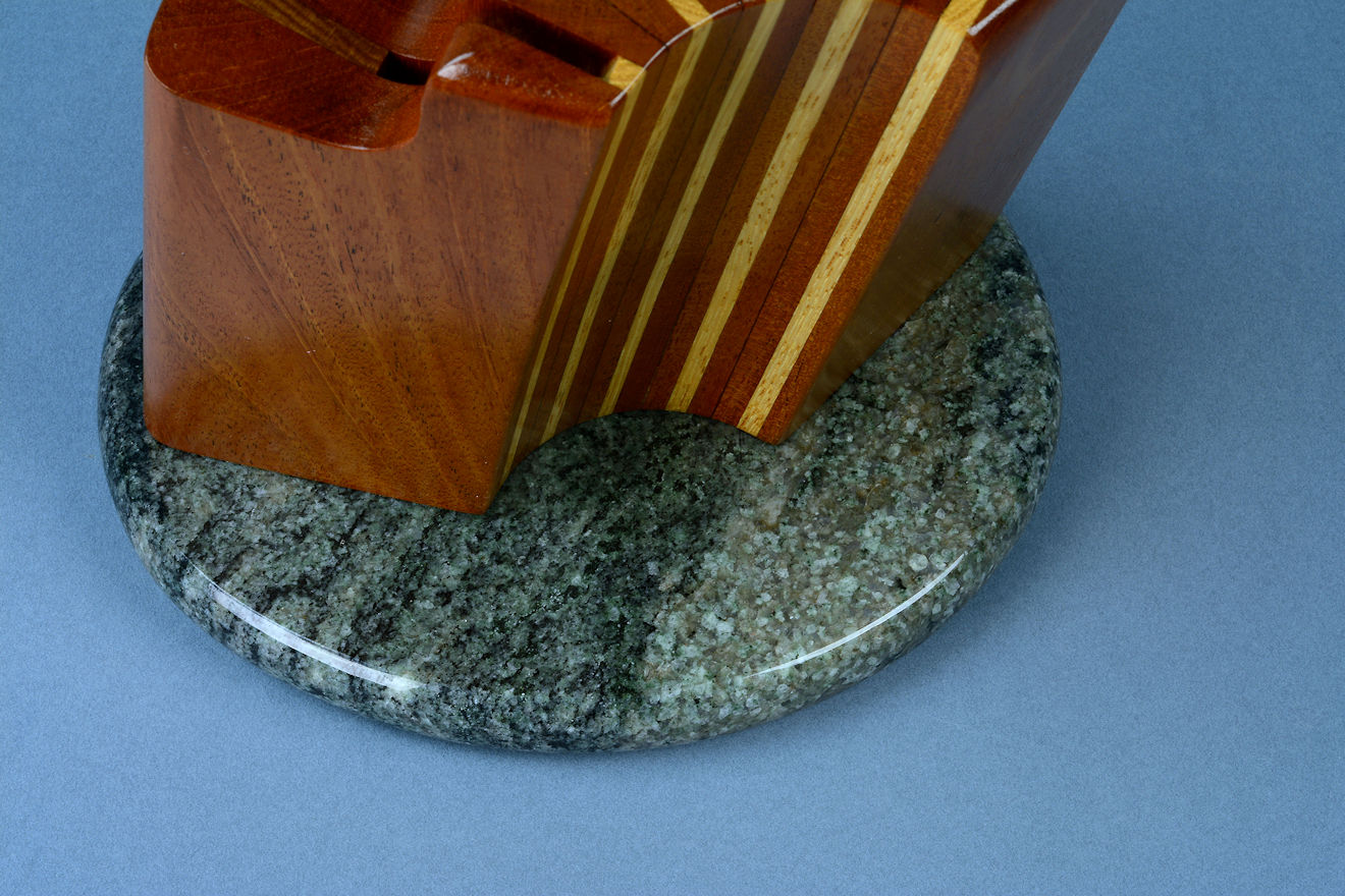 A piece is only as stable as its foundation. In the granite base, I inserted neoprene feet to protect any countertop from abrasion, and to allow air to circulate underneath for cleanliness. I used all 304 stainless steel screws to attach the block set in countersunk holes in the granite. Also I cut a milled-out pocket in the base, and inset a legend plate, in engraved black lacquered brass. The plate is protected by being inlayed, and is sealed with acrylic for longevity. The base is extremely stable and compact, finishing the piece as it deserves.
