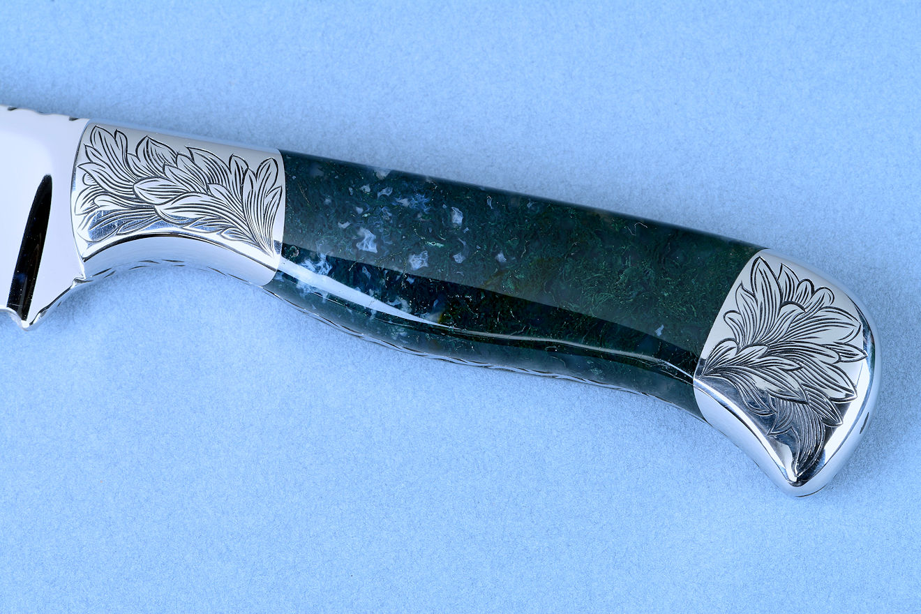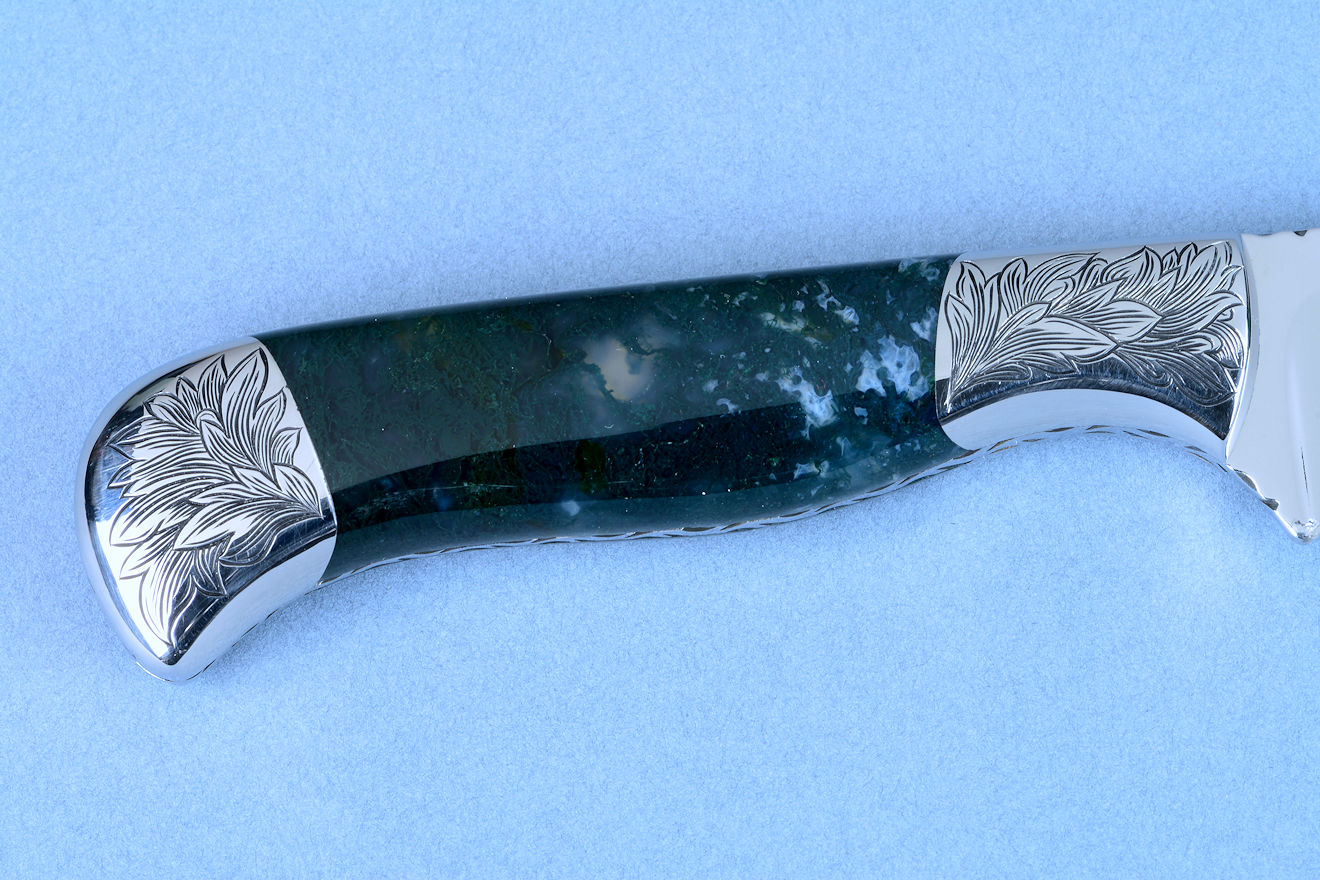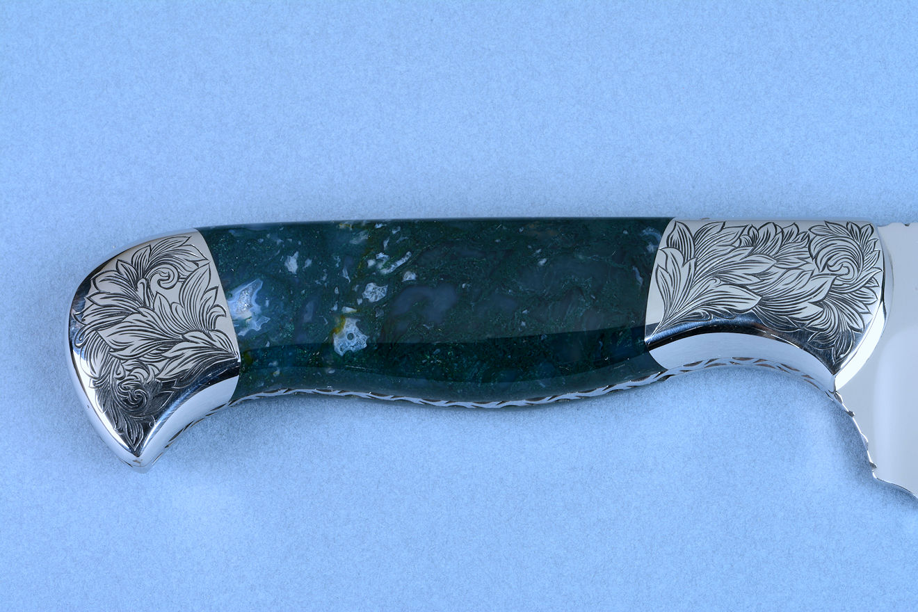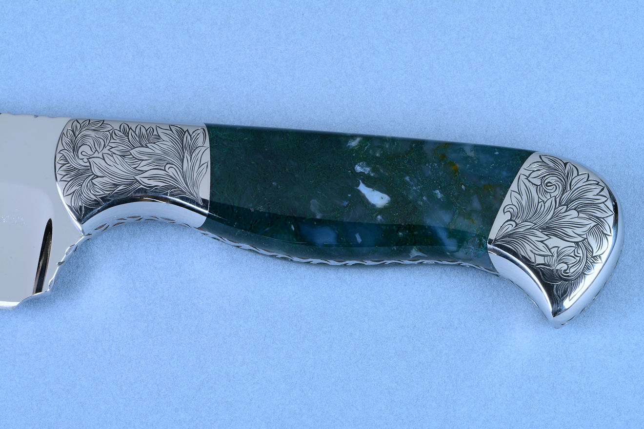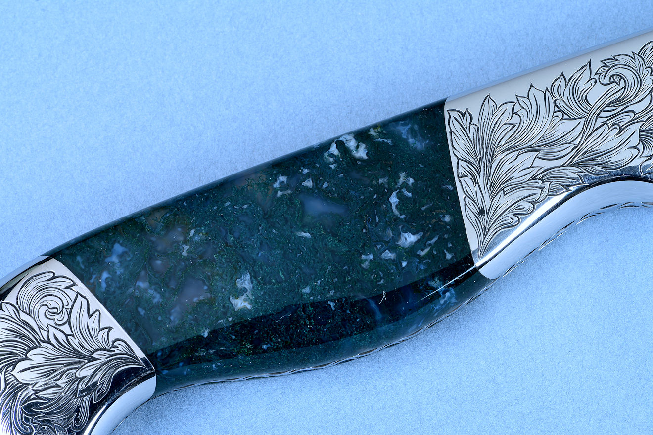 My client requested a bold, strong, green gemstone handle material. This is Green Moss Agate from India, one of the hardest, toughest, and most beautiful of all agates found. Every single piece is distinctive and unique, with rich, deep green mossy forms floating in clear, translucent, and white agate areas throughout. This is a stone that cannot be adequately described; the more you examine it, the more astounding it is. The photo above is a four power enlargement, and the detail just keeps coming!