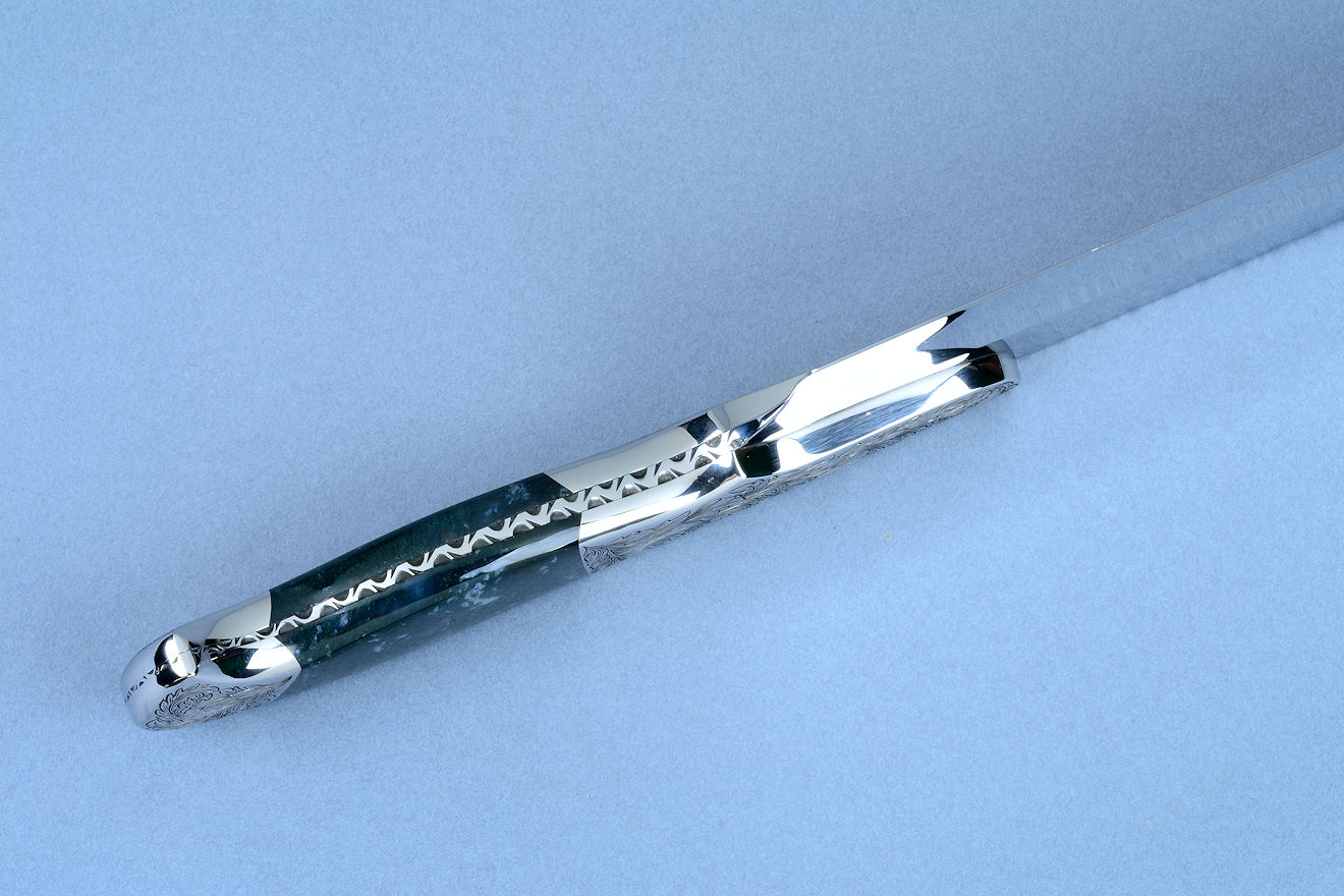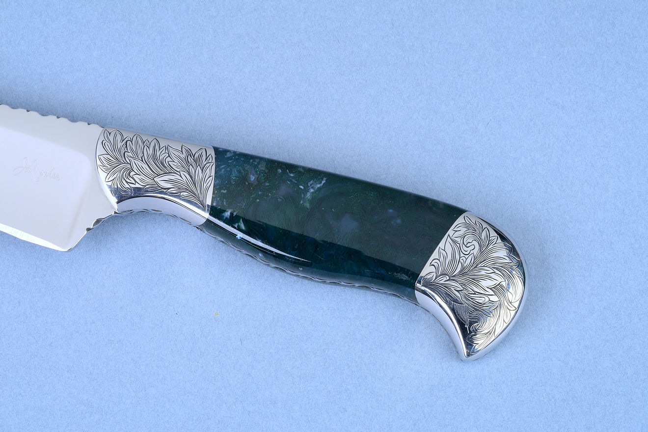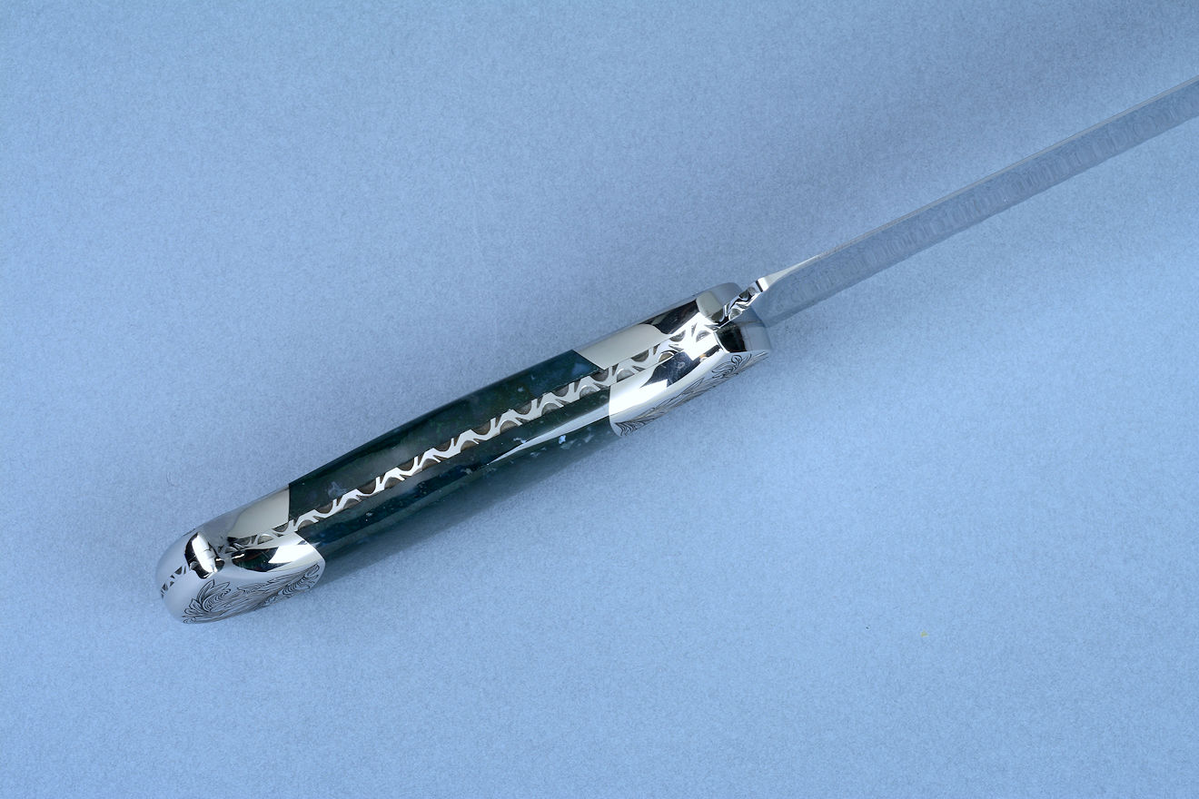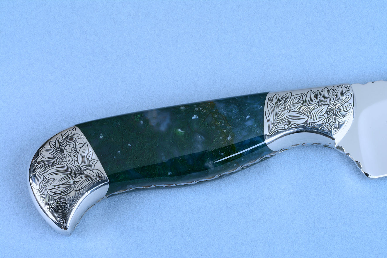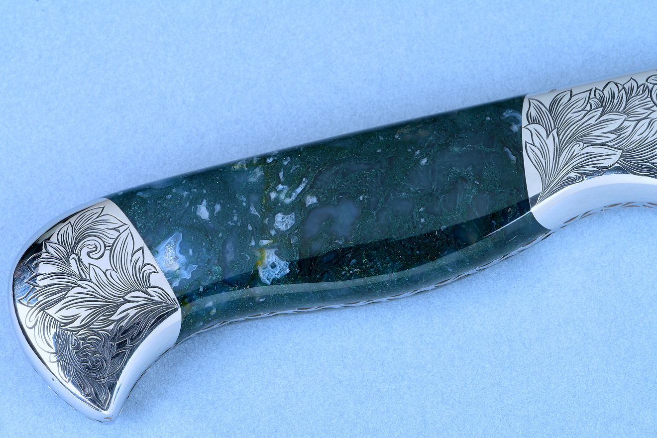 My client requested a bold, strong, green gemstone handle material. This is Green Moss Agate from India, one of the hardest, toughest, and most beautiful of all agates found. Every single piece is distinctive and unique, with rich, deep green mossy forms floating in clear, translucent, and white agate areas throughout. This is a stone that cannot be adequately described; the more you examine it, the more astounding it is. The photo above is a four power enlargement, and the detail just keeps coming!