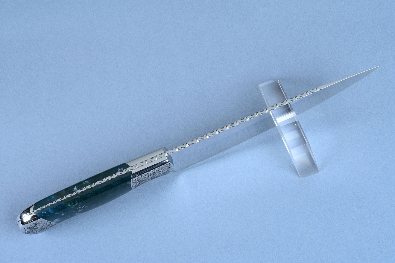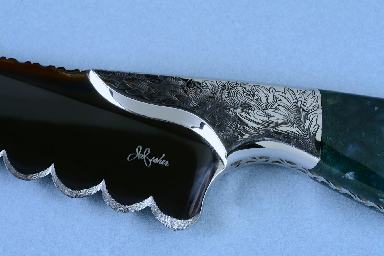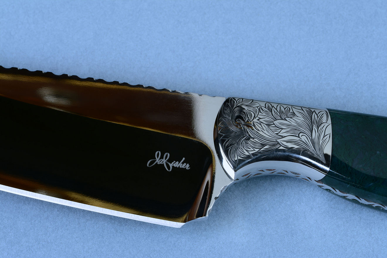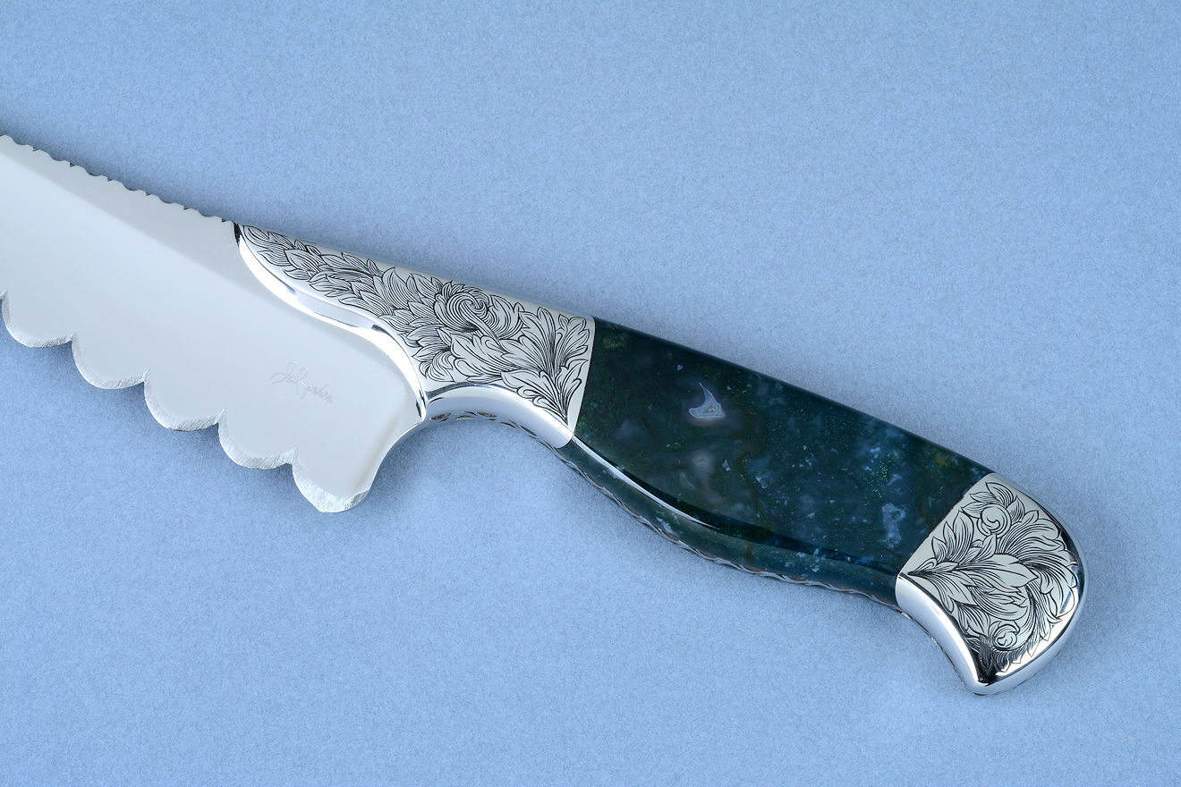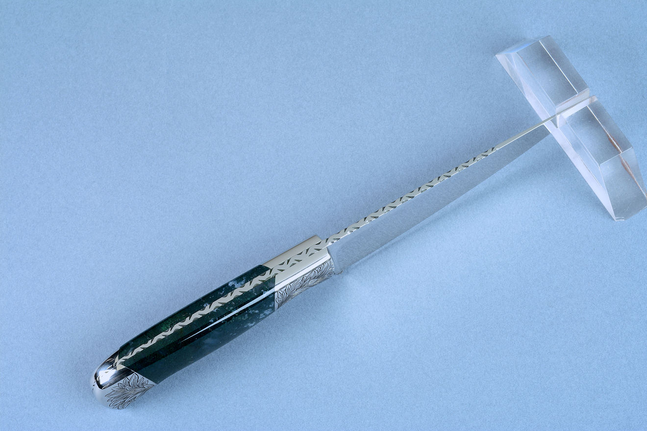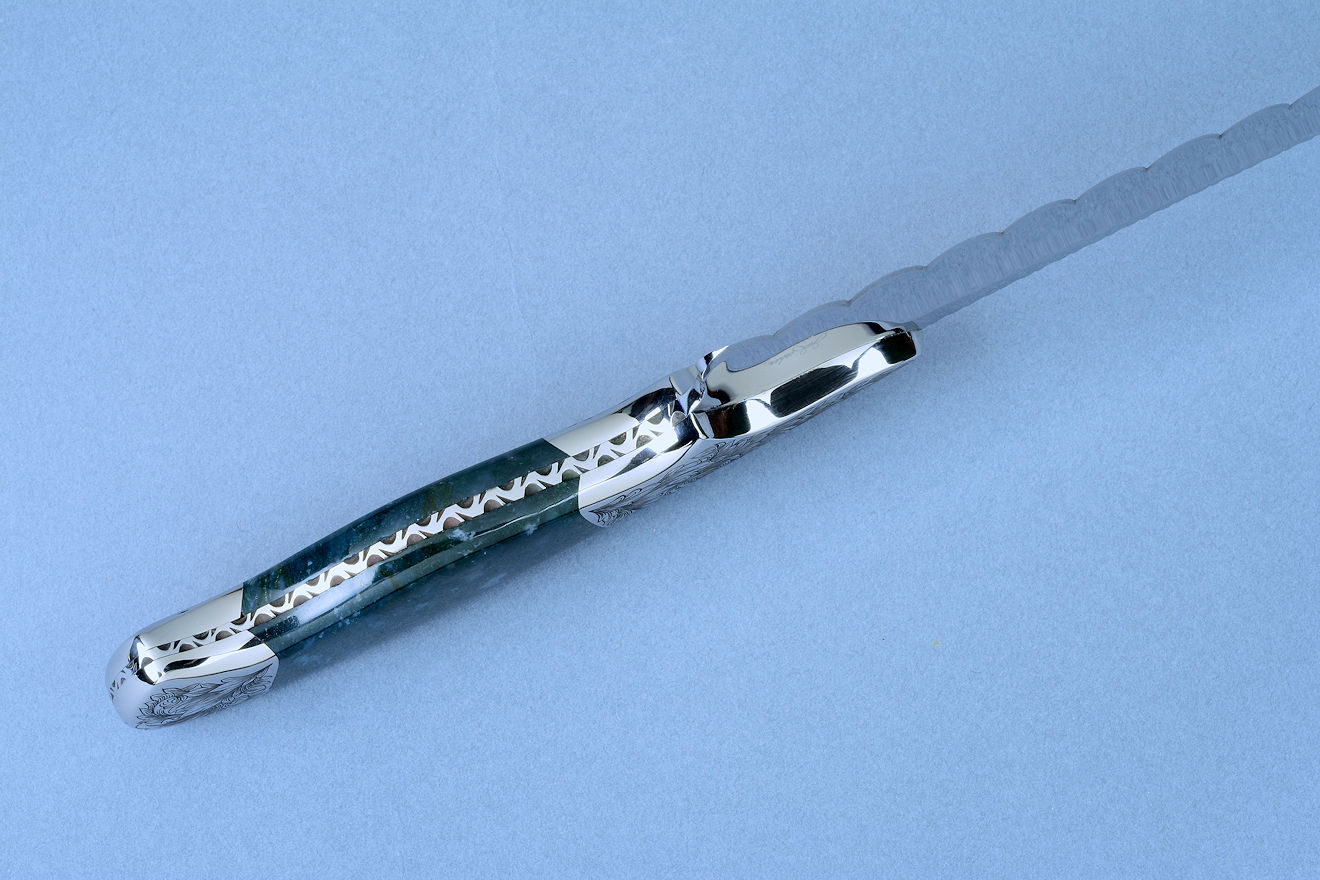 My client requested a bold, strong, green gemstone handle material. This is Green Moss Agate from India, one of the hardest, toughest, and most beautiful of all agates found. Every single piece is distinctive and unique, with rich, deep green mossy forms floating in clear, translucent, and white agate areas throughout. This is a stone that cannot be adequately described; the more you examine it, the more astounding it is. The photo above is a four power enlargement, and the detail just keeps coming!