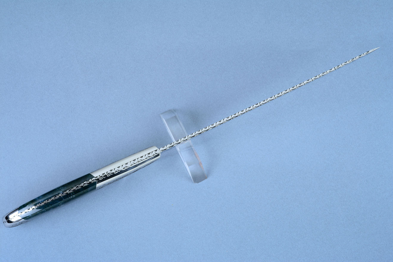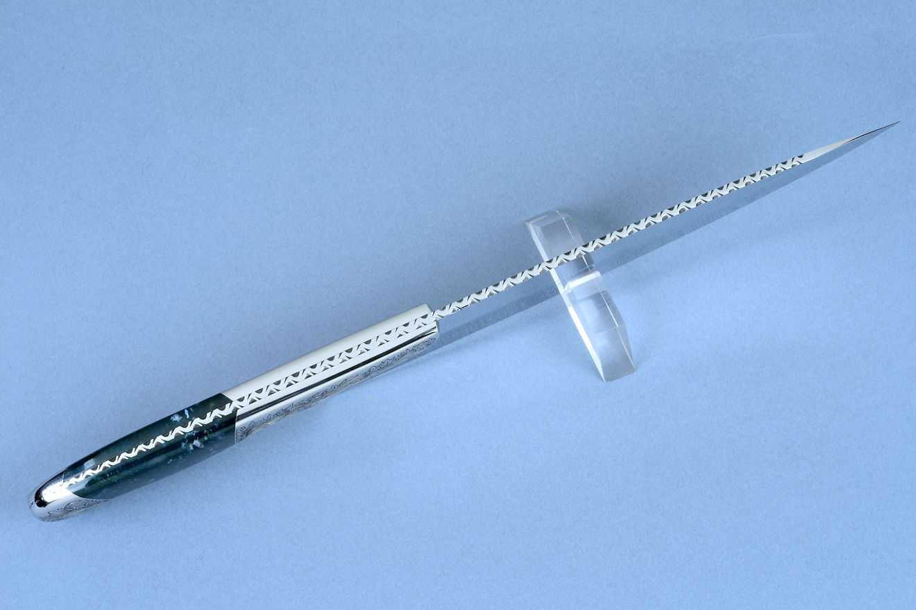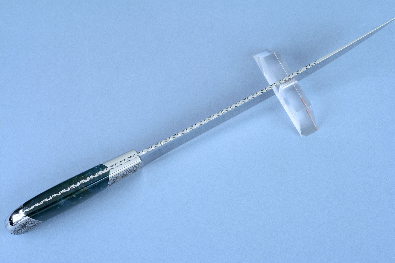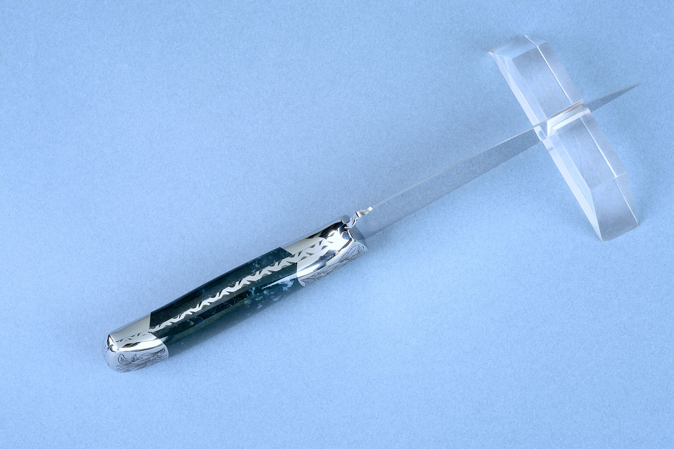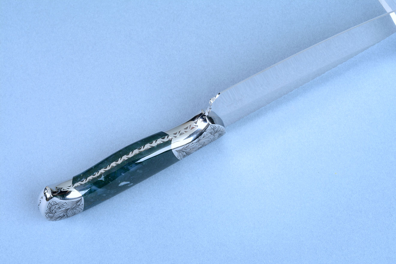 My client requested a bold, strong, green gemstone handle material. This is Green Moss Agate from India, one of the hardest, toughest, and most beautiful of all agates found. Every single piece is distinctive and unique, with rich, deep green mossy forms floating in clear, translucent, and white agate areas throughout. This is a stone that cannot be adequately described; the more you examine it, the more astounding it is. The photo above is a four power enlargement, and the detail just keeps coming!