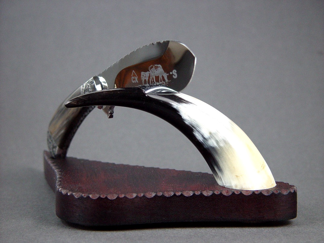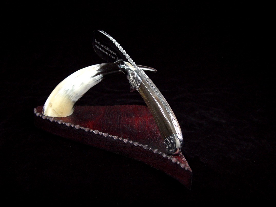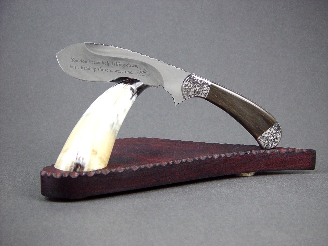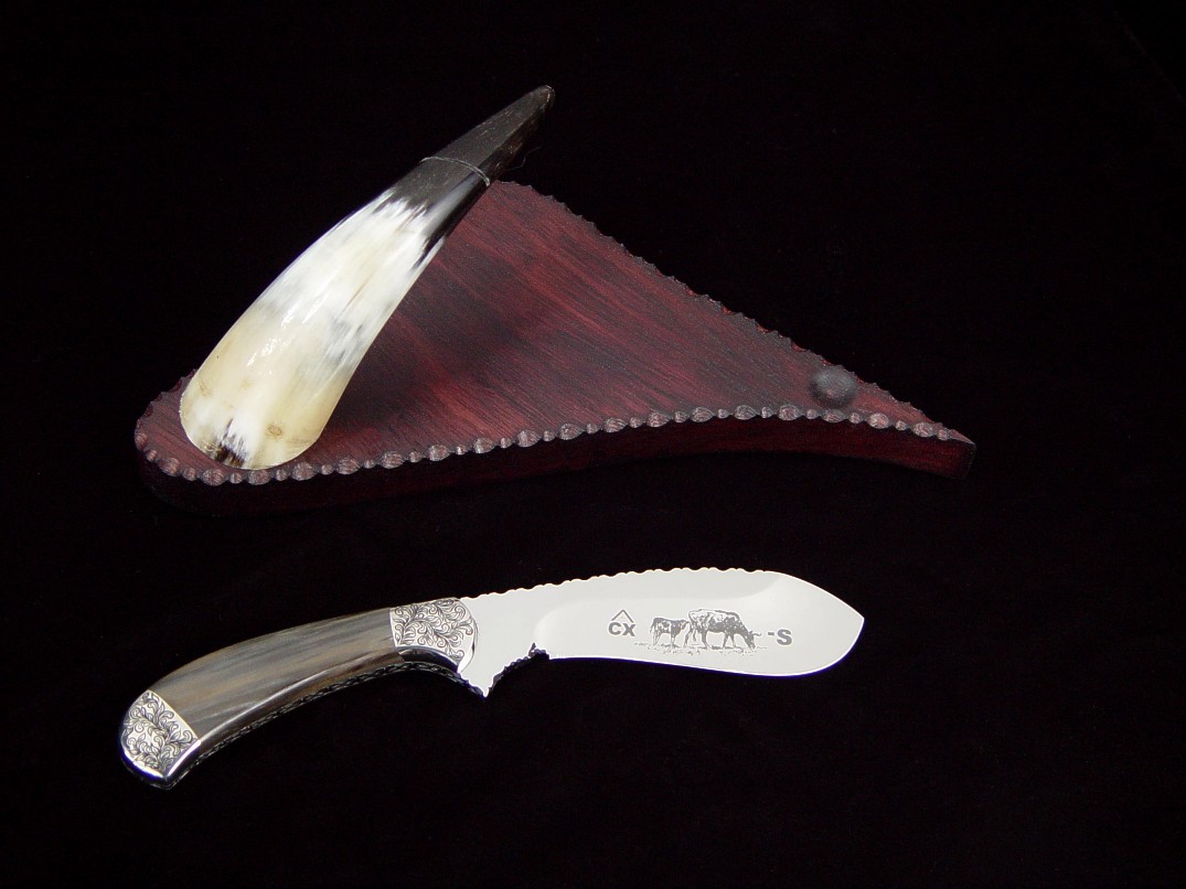 This Cattleman is deeply and thinly hollow ground in 440C high chromium martensitic stainless steel blade, with full filework, and custom etching on both sides of the blade. The handle has a fully tapered tang, with full filework that is hand-engraved. The knife has bolsters of hand-engraved 304 austenitic high nickel, high chromium stainless steel which are dovetailed and bed a pair of handsome Petrified Wood Agate gemstone handle scales. This is an extremely hard and tough gem, and will well outlast the knife, the owners, and probably our entire civilization. This material is, in fact, some of the hardest I've ever worked, taking a bright glassy polish, smooth and solid. The knife is displayed on an appropriate stand of polished cow's horn mounted to a hand-carved Amaranth (Purpleheart) hardwood base.