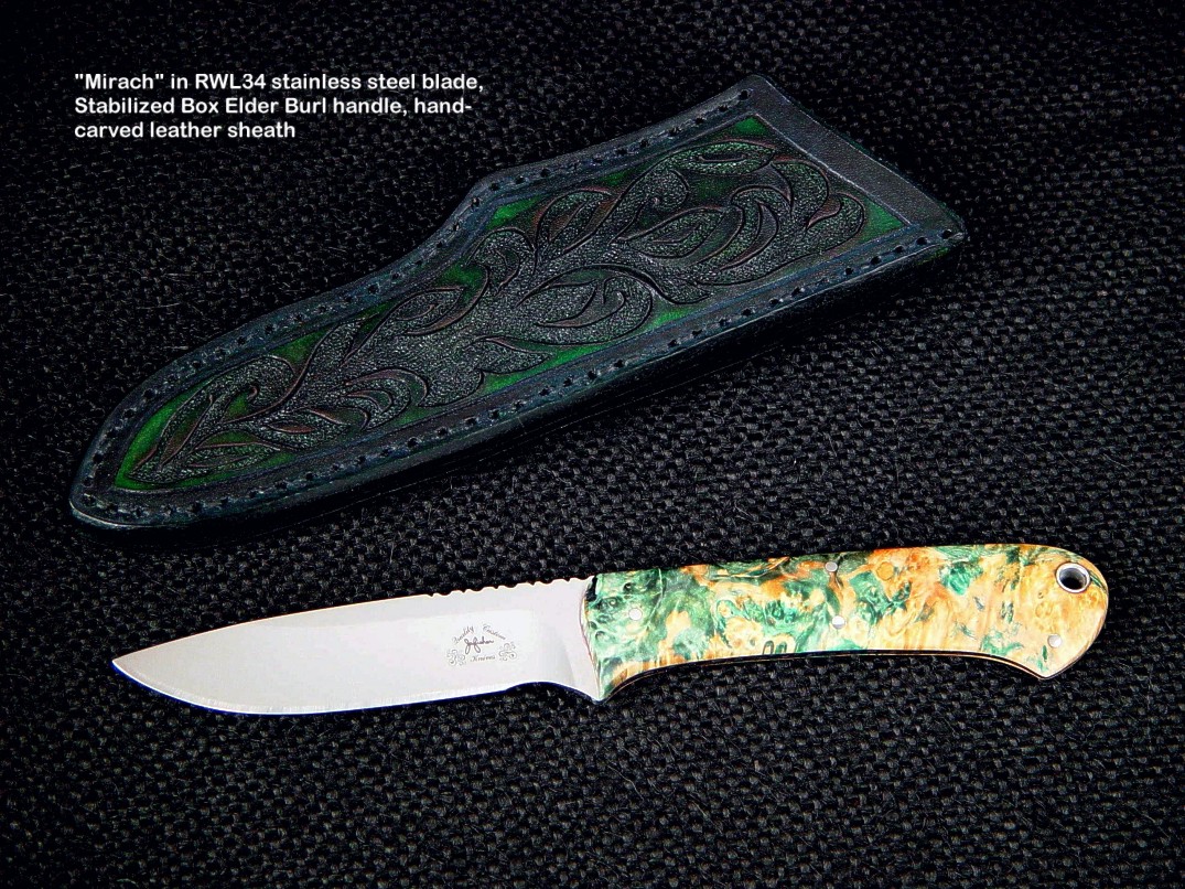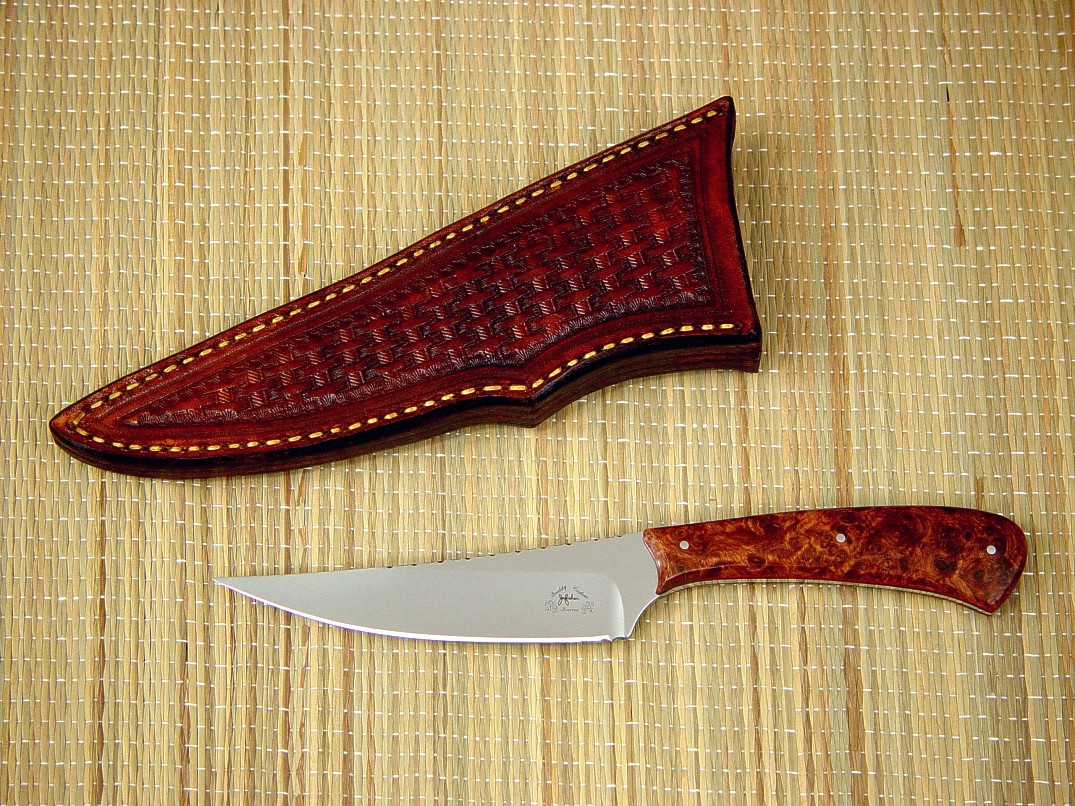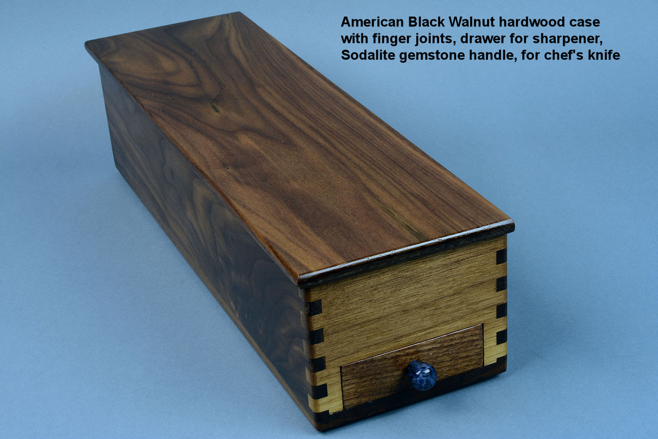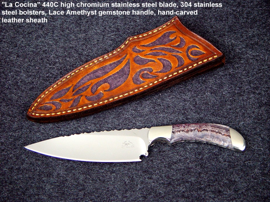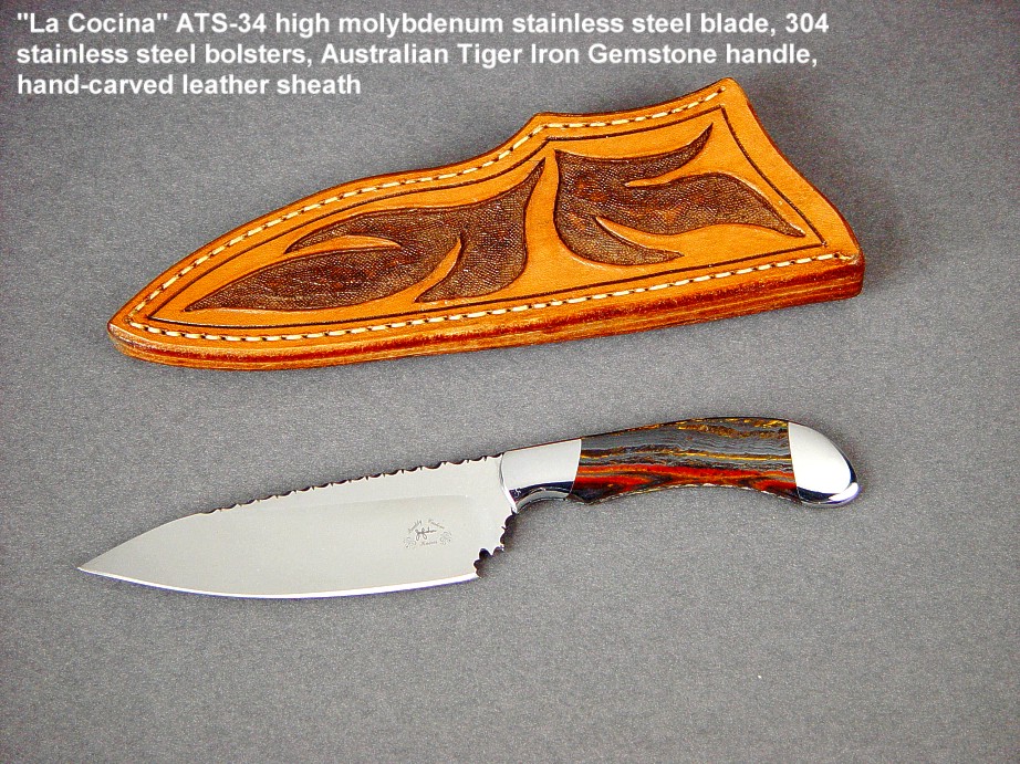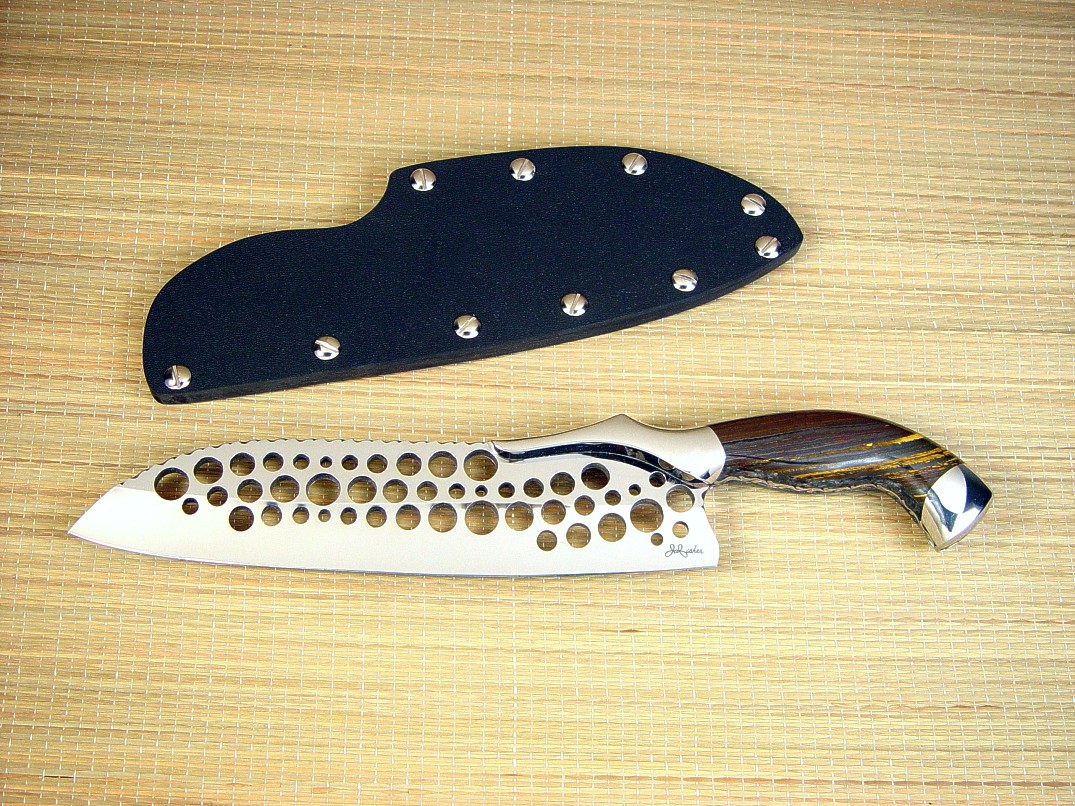 You will notice a lot of sheaths with the knives on this page. Conventional wisdom is that a sheath knife is for the "field." The truth is, a sheath protects the knife and the owner. If you're going to store your knife in a drawer banging into other knives and kitchen tools, your expensive custom knife is going to get dinged, have the edge dulled, and get torn up. The sheath will offer protection. The worst enemy of a knife is another knife and other metal kitchen tools.