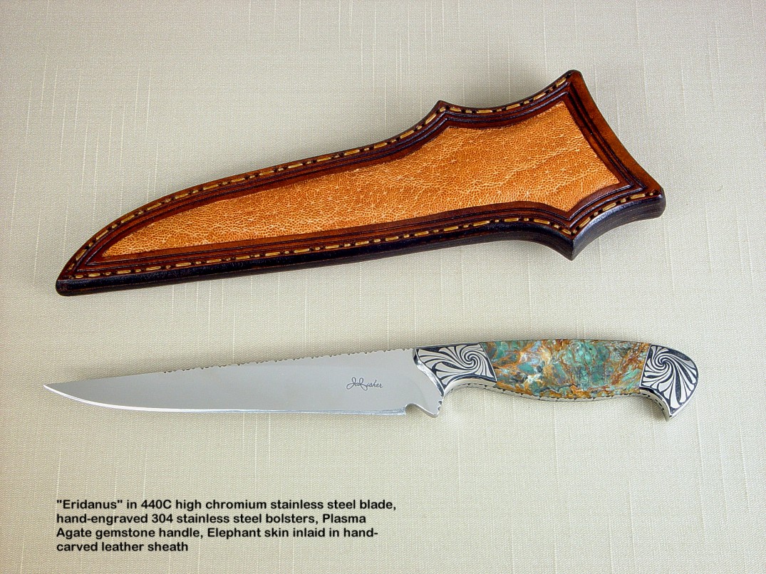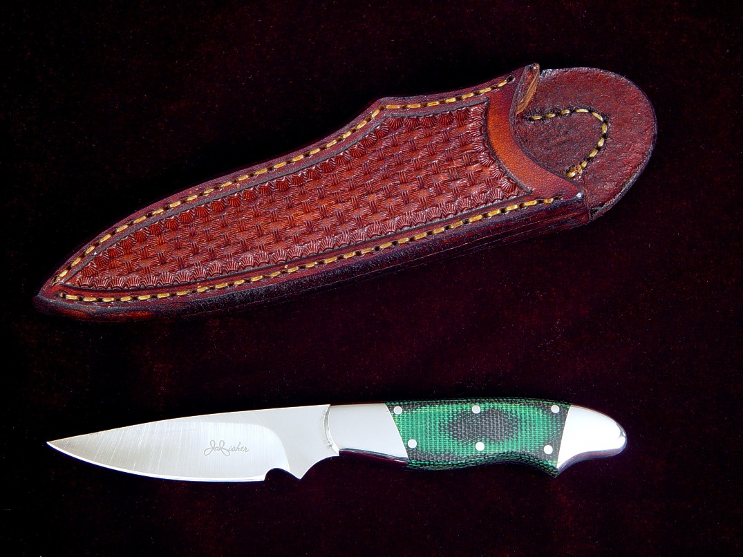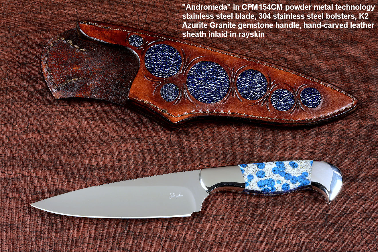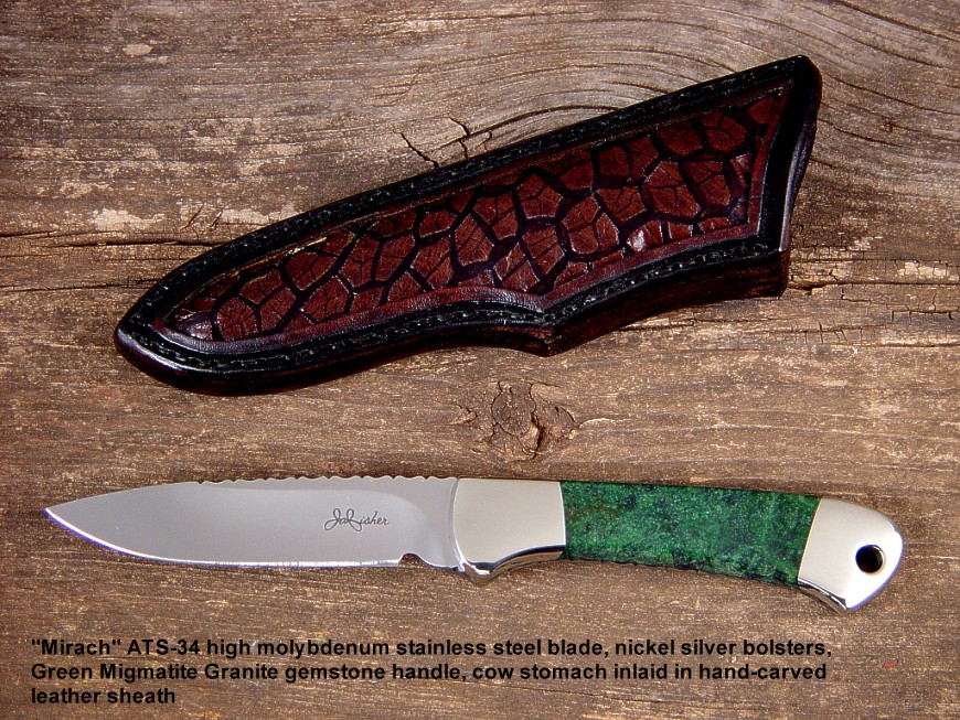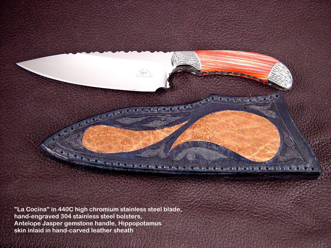 You will notice a lot of sheaths with the knives on this page. Conventional wisdom is that a sheath knife is for the "field." The truth is, a sheath protects the knife and the owner. If you're going to store your knife in a drawer banging into other knives and kitchen tools, your expensive custom knife is going to get dinged, have the edge dulled, and get torn up. The sheath will offer protection. The worst enemy of a knife is another knife and other metal kitchen tools.