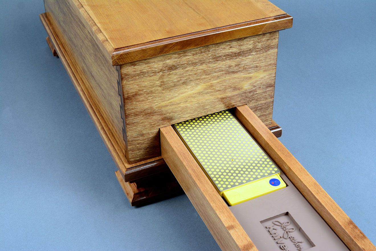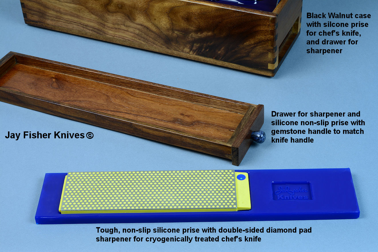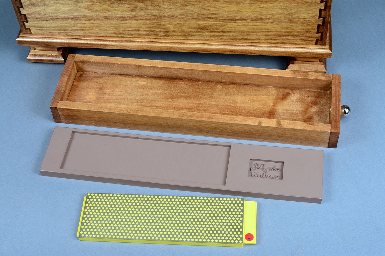 This is why I started building the silicone prise for the stone. It's a thick (about 1/2") piece of hand-dyed, hand-cast molded food contact-safe silicone rubber, and it has a dedicated, perfectly-sized pocket to nest and embrace the sharpening stone. The silicone pad is laid on the surface, protecting it from the abrasive diamond particles. The stone is placed inside the pocket, pressed in, and then sharpening begins. The silicon flexes a tiny bit, but holds the diamond stone securely, and the stone can be flipped over for the final stages of sharpening. The silicone (and the diamond stone) can be washed with soap and water; they both quickly dry, and can be stored. In the photos below, I've made a special drawer to store the sharpening kit. Genius!