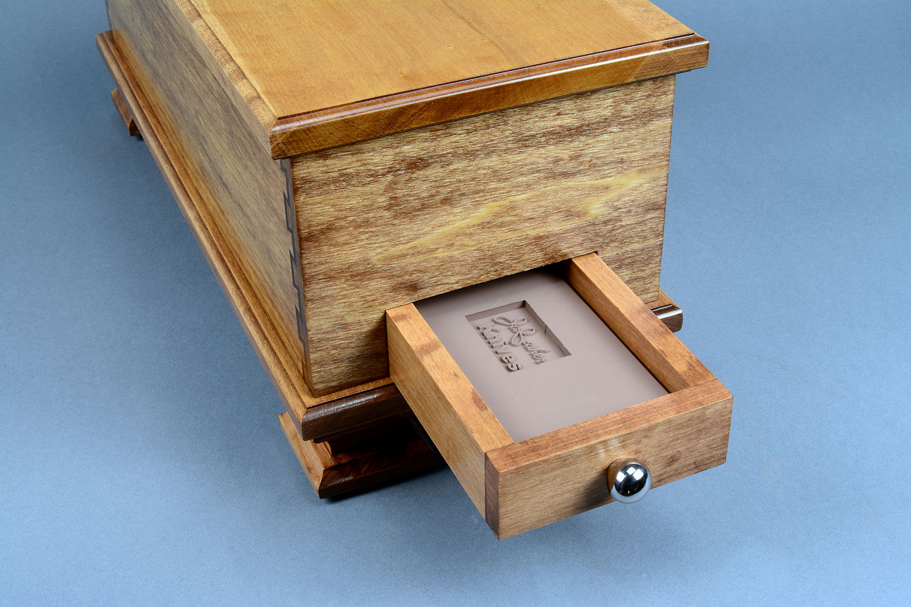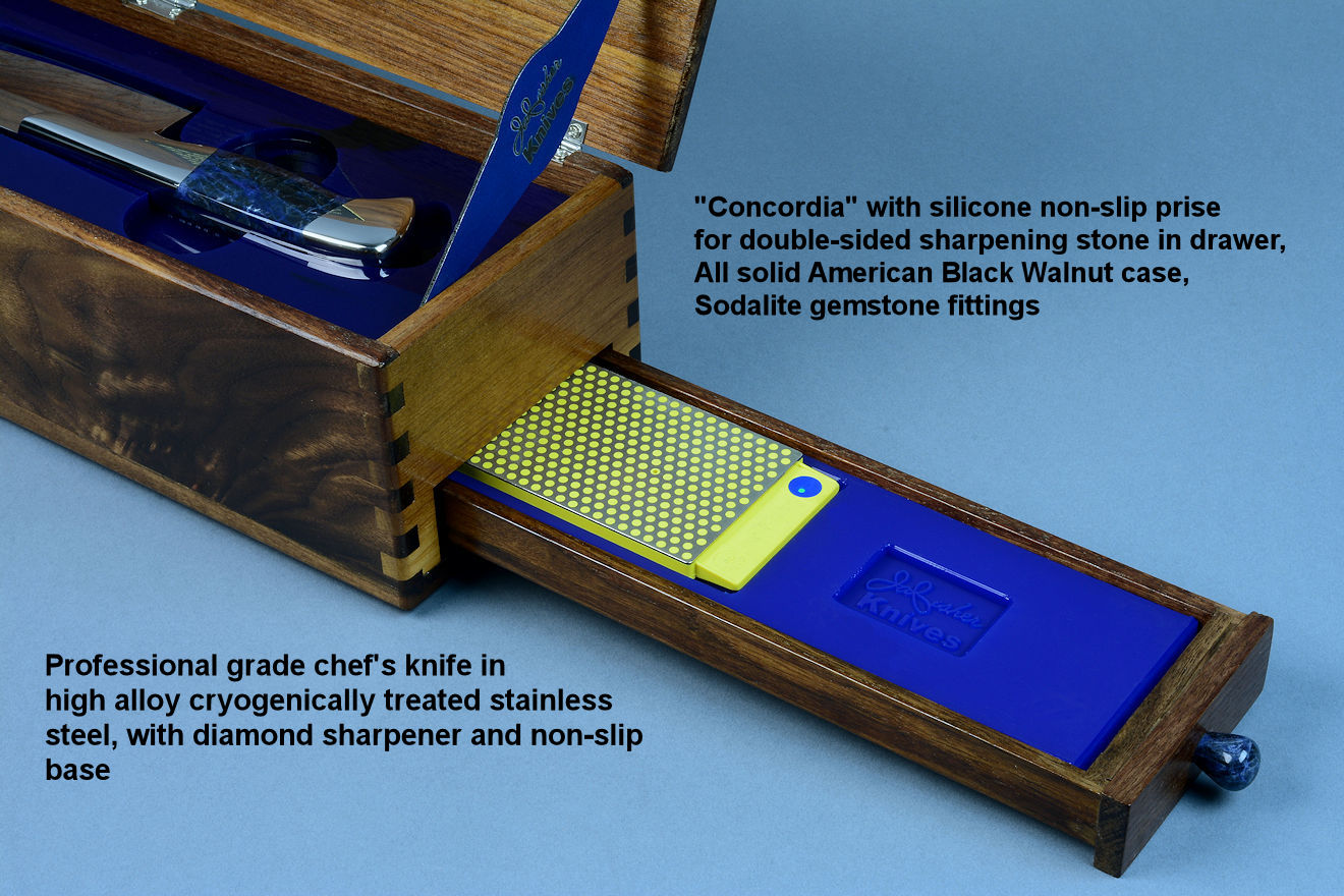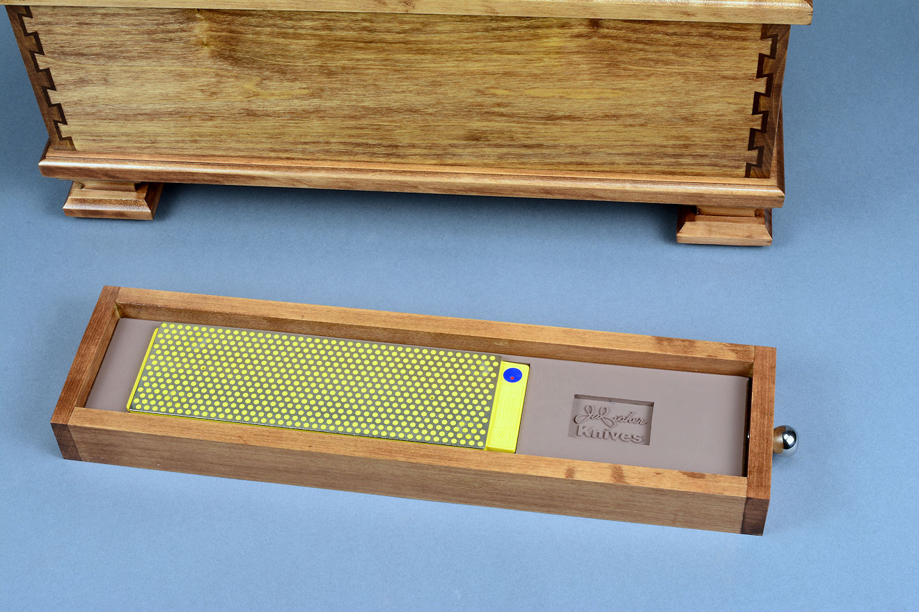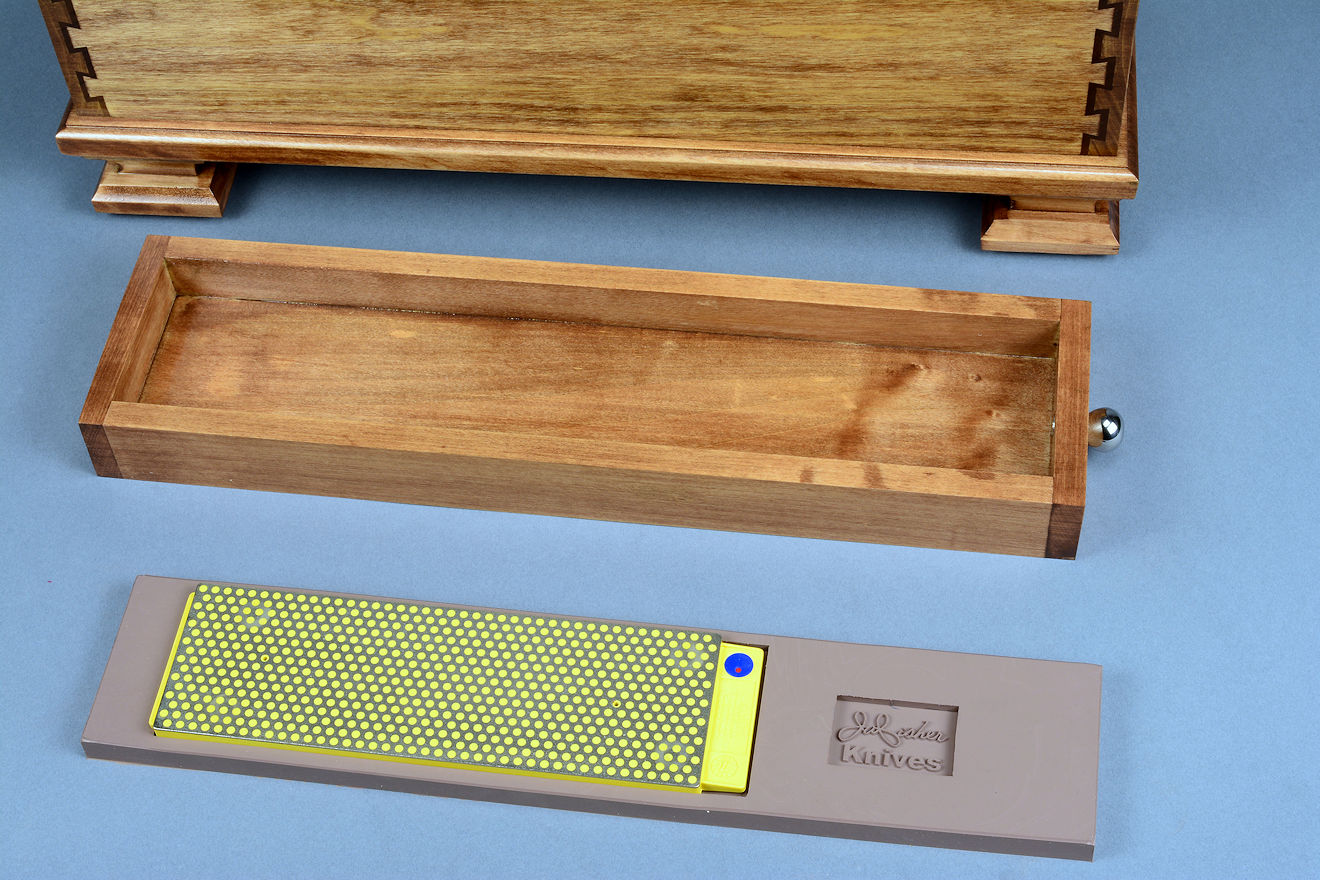 This is why I started building the silicone prise for the stone. It's a thick (about 1/2") piece of hand-dyed, hand-cast molded food contact-safe silicone rubber, and it has a dedicated, perfectly-sized pocket to nest and embrace the sharpening stone. The silicone pad is laid on the surface, protecting it from the abrasive diamond particles. The stone is placed inside the pocket, pressed in, and then sharpening begins. The silicon flexes a tiny bit, but holds the diamond stone securely, and the stone can be flipped over for the final stages of sharpening. The silicone (and the diamond stone) can be washed with soap and water; they both quickly dry, and can be stored. In the photos below, I've made a special drawer to store the sharpening kit. Genius!