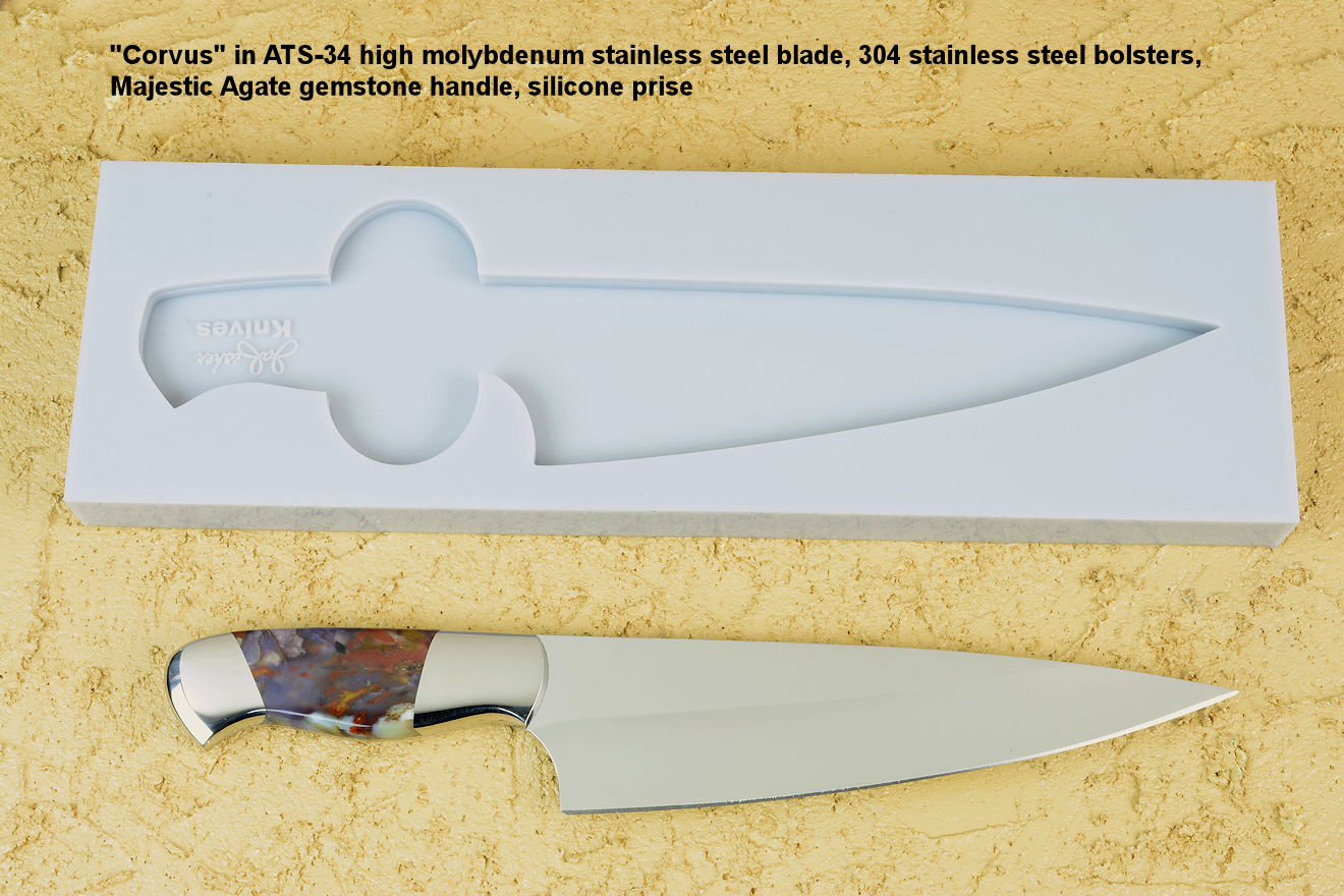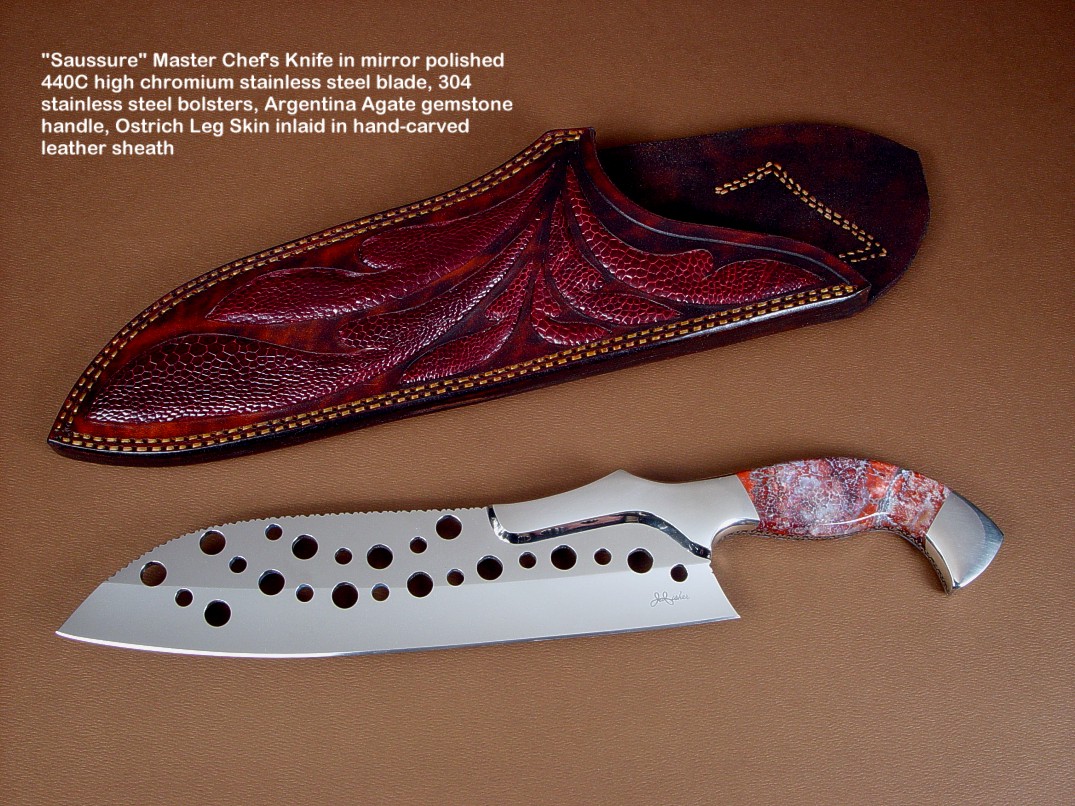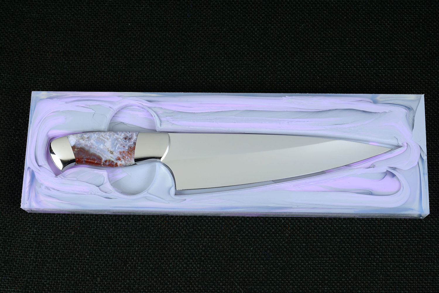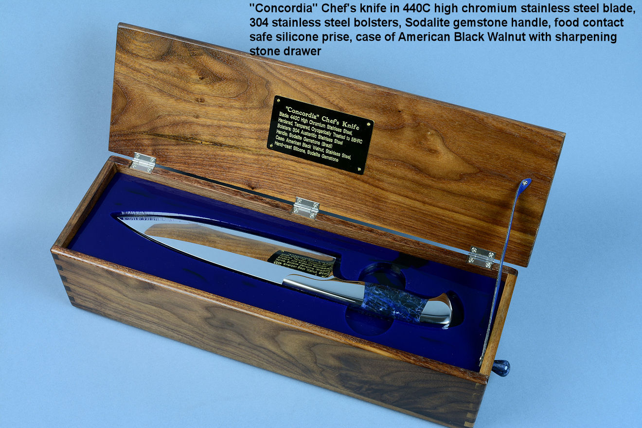 I consider it my duty as a maker of extremely fine chef's knives to help the chef out, but I can not help him if he has a low grade, inferior, and weak knife blade. The reason for every knife is the blade, and the blade is made of fine, modern tool steel (or should be). The fine knife blade should not be a low alloy, old-world style carbon steel, but the finest engineered, most modern, highest quality, refined, clean, and scientifically made and treated, machined, ground, and finished stainless tool steel we have available. In addition, the knife should always be made entirely of Food Contact Safe materials and construction. A good piece of professional chef's cutlery starts with the foundation of an exceptional blade. This doesn't only mean an ornamental blade, although style, appearance, and artistic value can be well-applied here.
