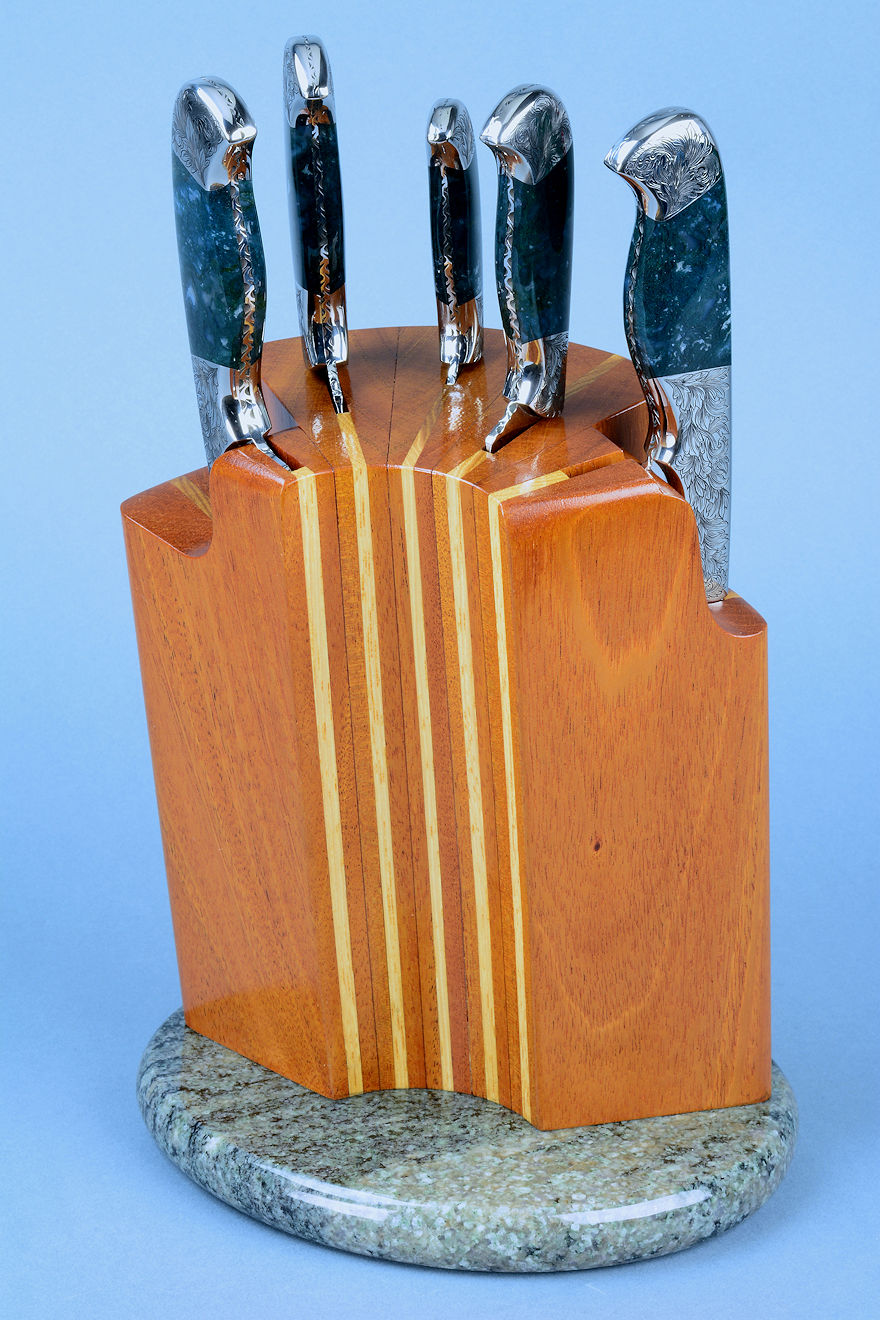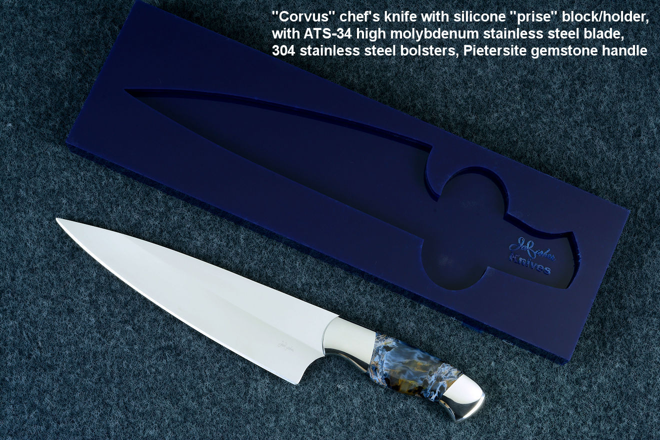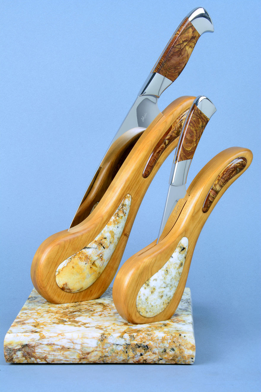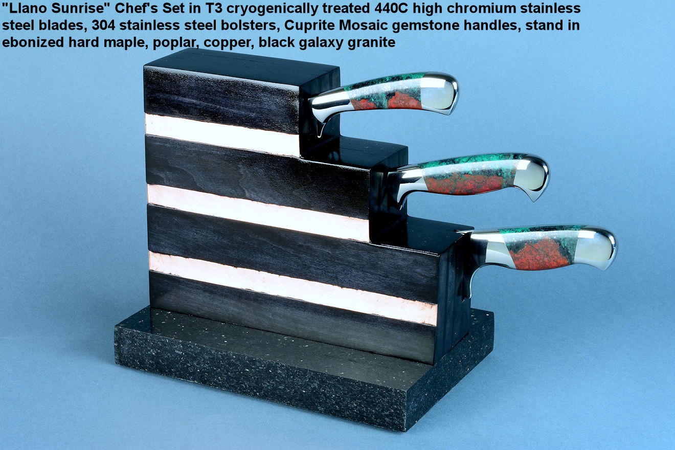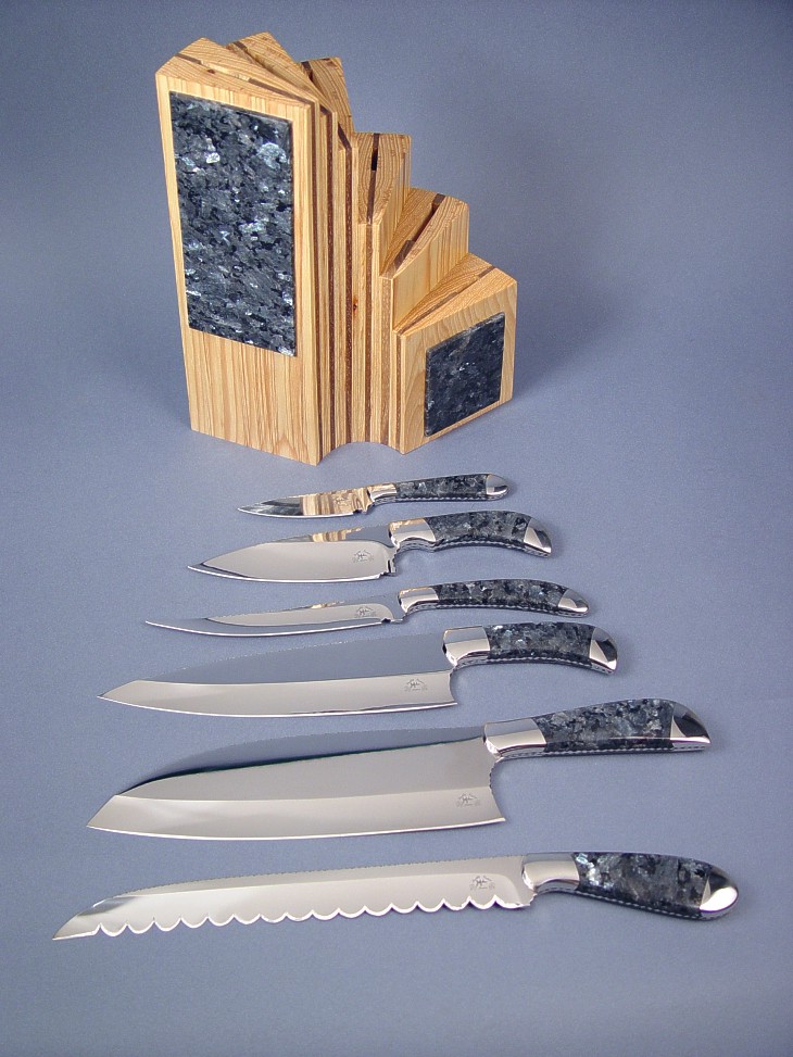 There is much more to these comparisons, mainly how my work, inspiration, art, and professional creations differ from other knifemakers who make kitchen knives by hand. There is a lot to learn here, and my clients deserve to know the difference between my works and the works of others. They have a right to know about the best steels and designs, the best fittings and handles, the best stands, blocks and accessories. They should understand technically, artistically, and aesthetically why this is so. This is the purpose of this page as part of my Service Commitment to my professional trade.