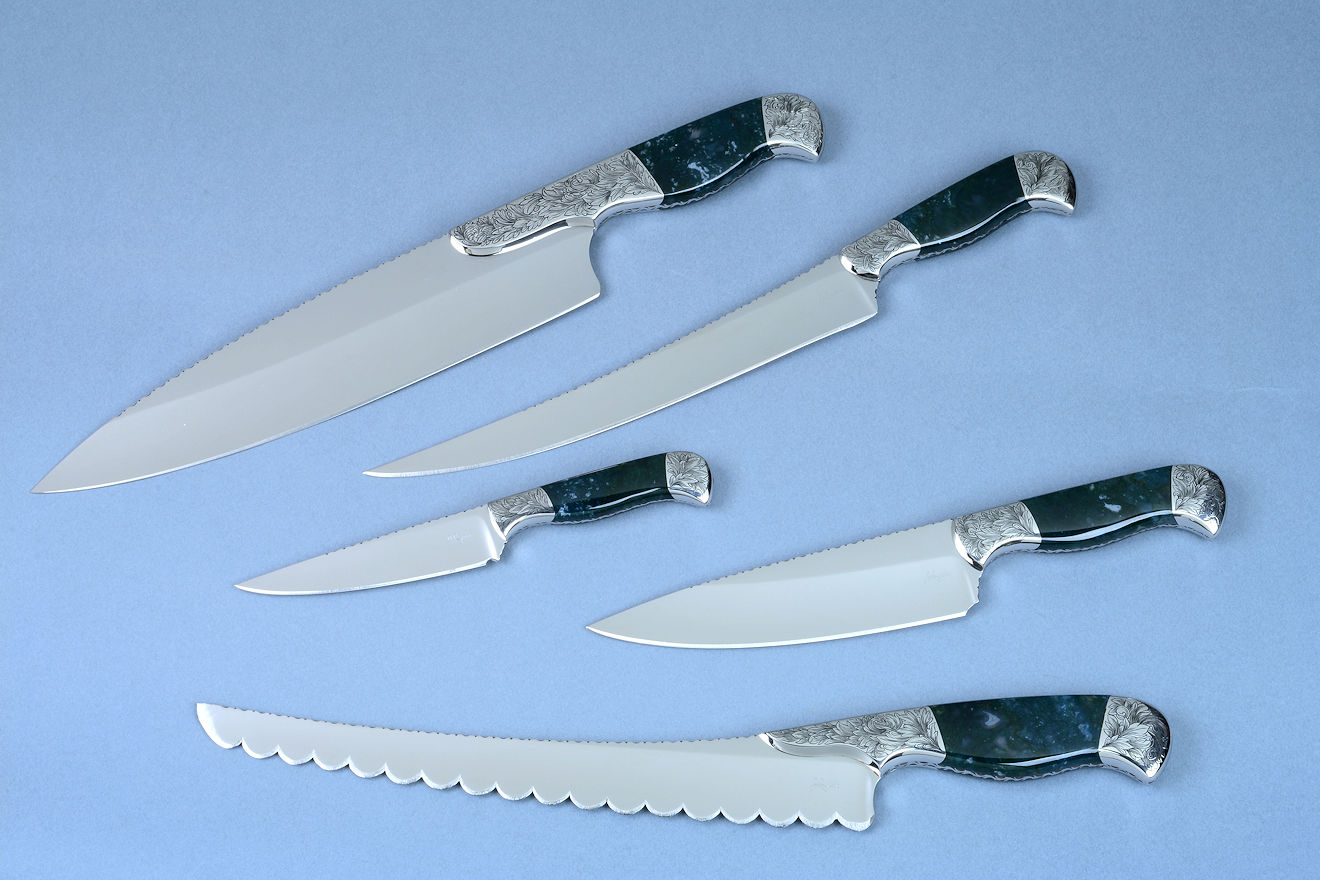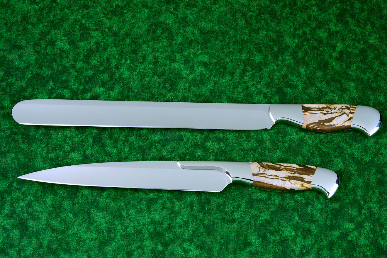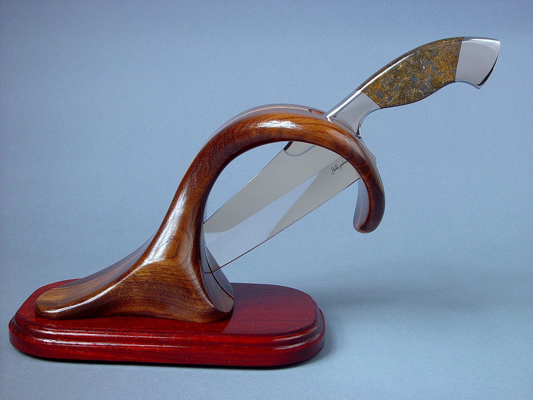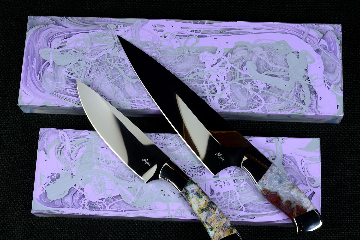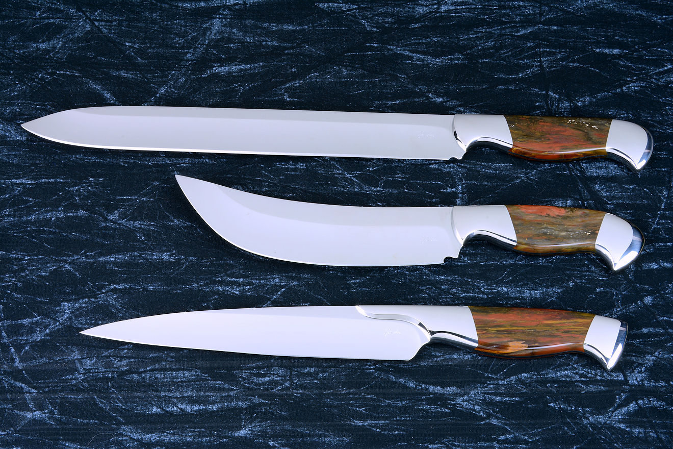 My personal and professional drive is to make and offer these knives through my own creative works as well as through custom works individually suited to each client. The knives you see on this page (and on all the other pages of the site apart from my "Knives for Sale" pages) are sitting in someone's favorite spot in their kitchen, on their counter, on their dining table, or in their restaurant, at the ready, in a place of respect that is important to them. I consider this the greatest honor I can have: that someone has a fine work of art and precision made completely by my hands in their life, that they adopt it to become part of their family of possessions, that the knife or knives are to be handed down to generations to come. This is why I do what I do.