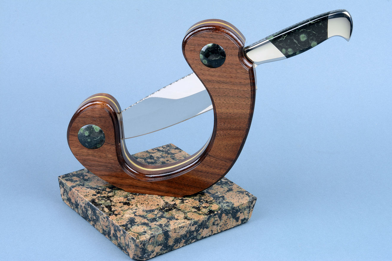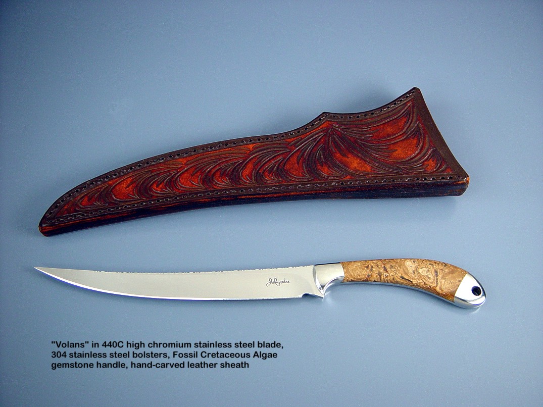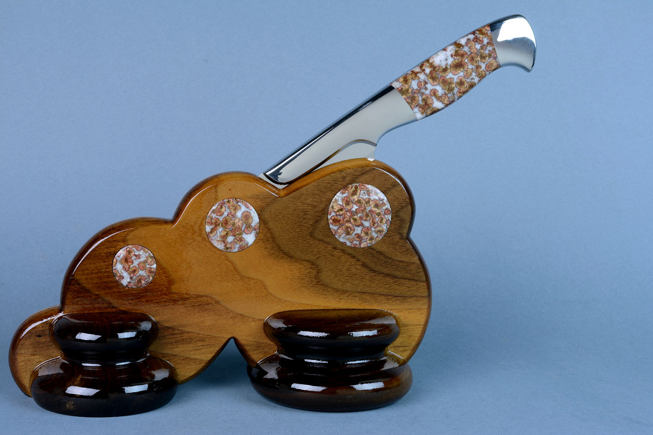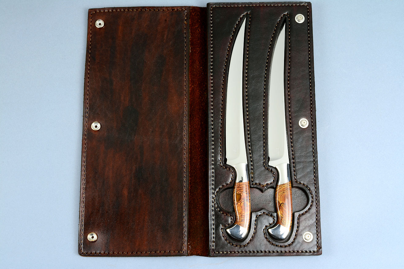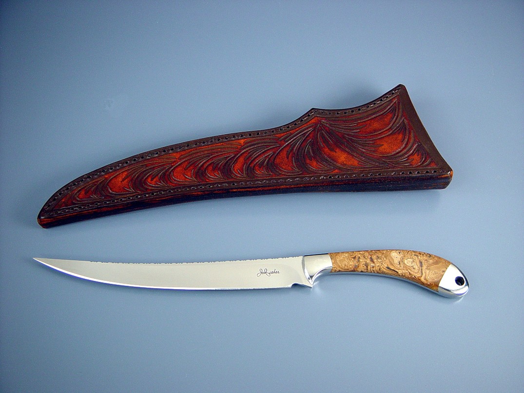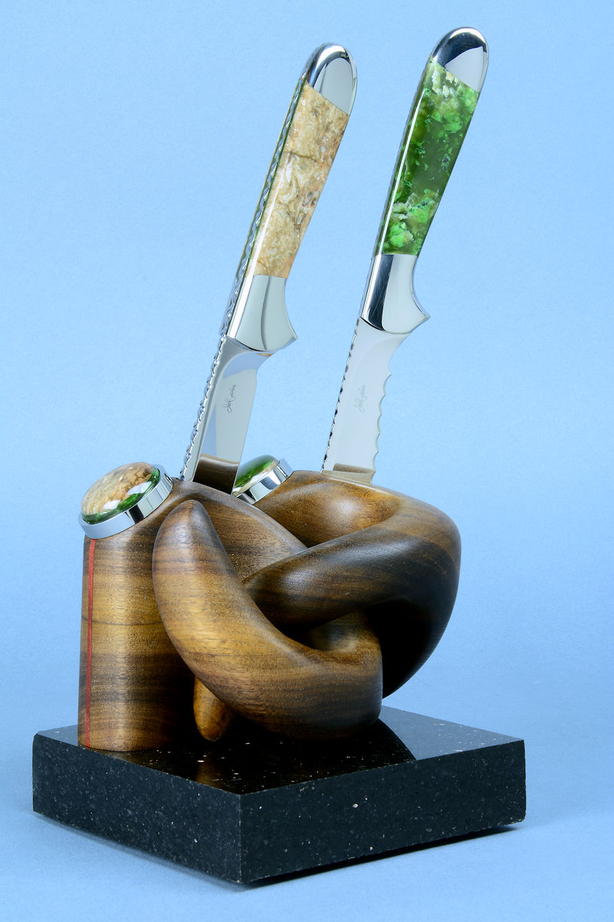 My personal and professional drive is to make and offer these knives through my own creative works as well as through custom works individually suited to each client. The knives you see on this page (and on all the other pages of the site apart from my "Knives for Sale" pages) are sitting in someone's favorite spot in their kitchen, on their counter, on their dining table, or in their restaurant, at the ready, in a place of respect that is important to them. I consider this the greatest honor I can have: that someone has a fine work of art and precision made completely by my hands in their life, that they adopt it to become part of their family of possessions, that the knife or knives are to be handed down to generations to come. This is why I do what I do.