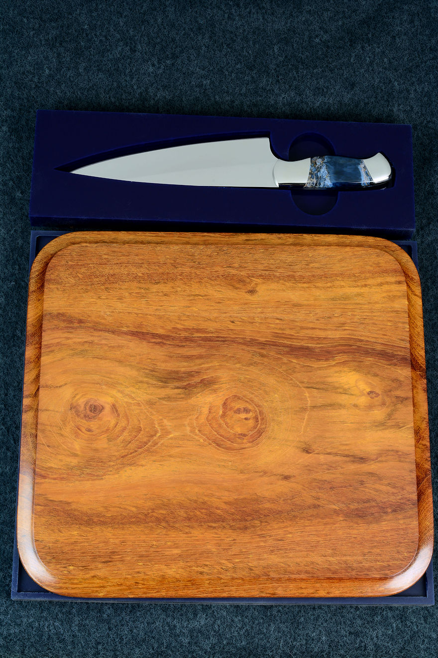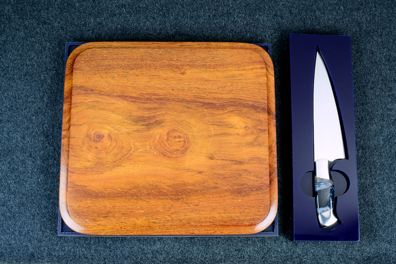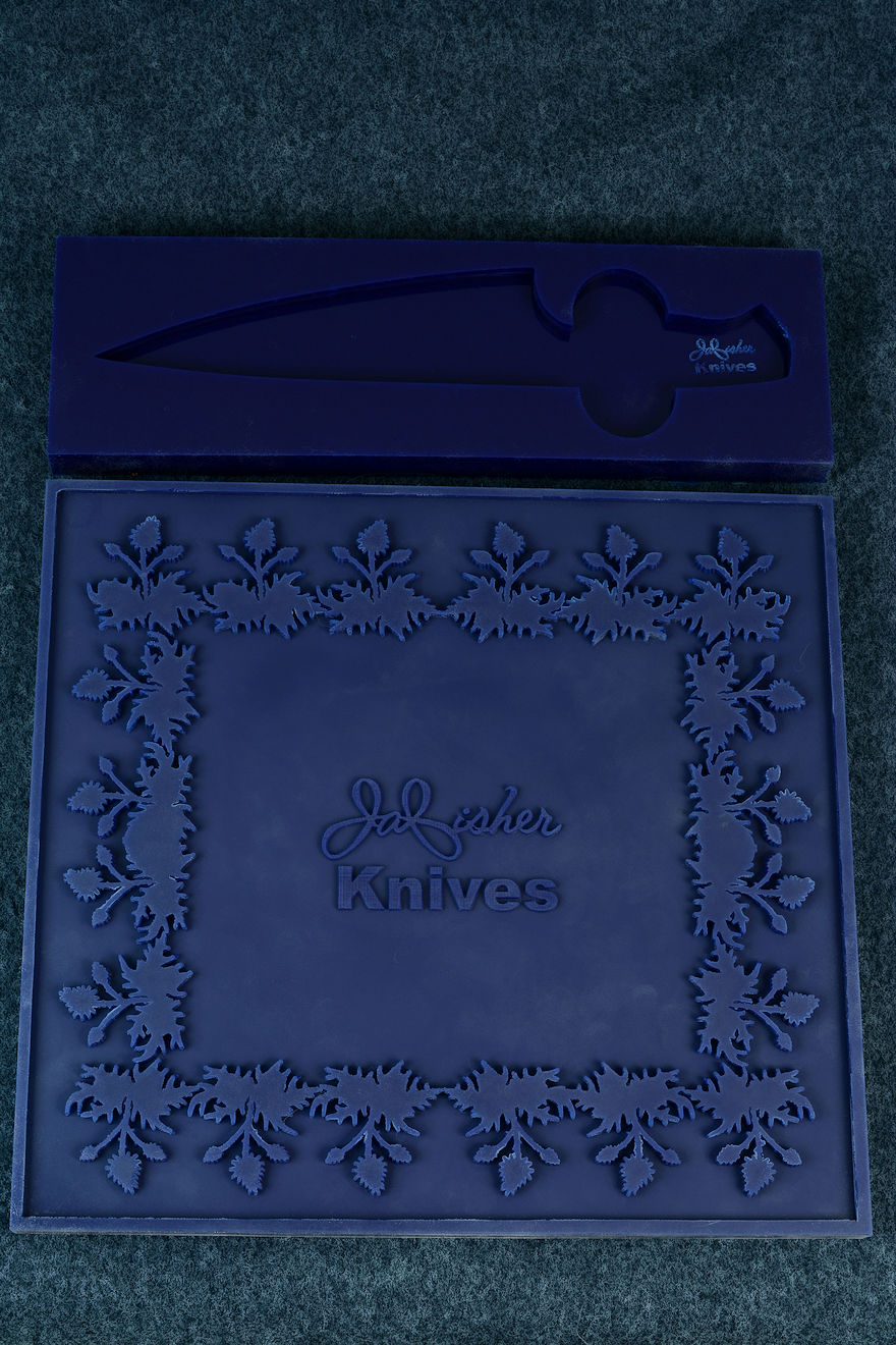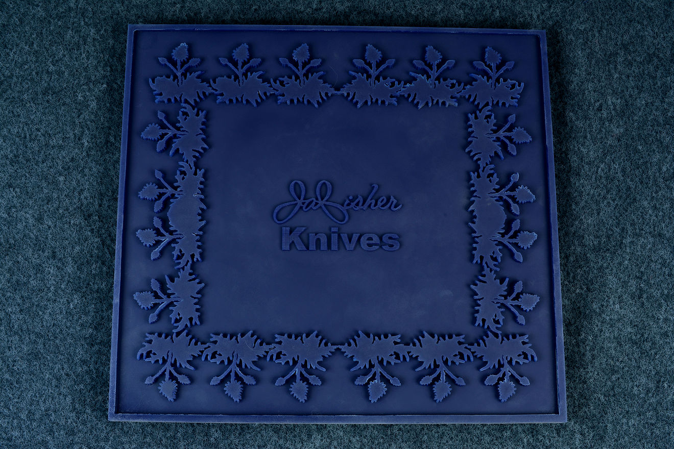 Like the knife prise, it's Food Contact Safe, and it's washable and withstands 450°F. It's a tough silicone (this one has a 800 lb. tensile strength), and incredibly long-lasting. It would be an easy think to replace the board or change the board out with another type or material while using the board prise over and over. The board is elevated by the design work inside and I customize it with my maker's mark, since I make them here in the studio, custom fit and dyed to the project.