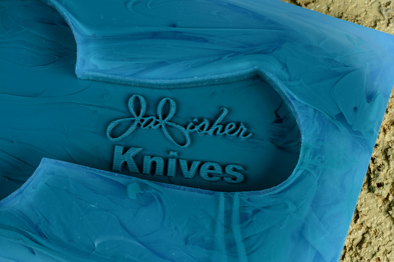 As I continued to make silicone prises, I improved the bottom. Because the prise is hand-cast, the bottom of the prise (as well as the top, sides, and middle) create a canvas for artwork. I know, you may seldom see the bottom of the prise, but it's very cool anyway; just take a look at this matched pair of custom knife prises created for a great client!