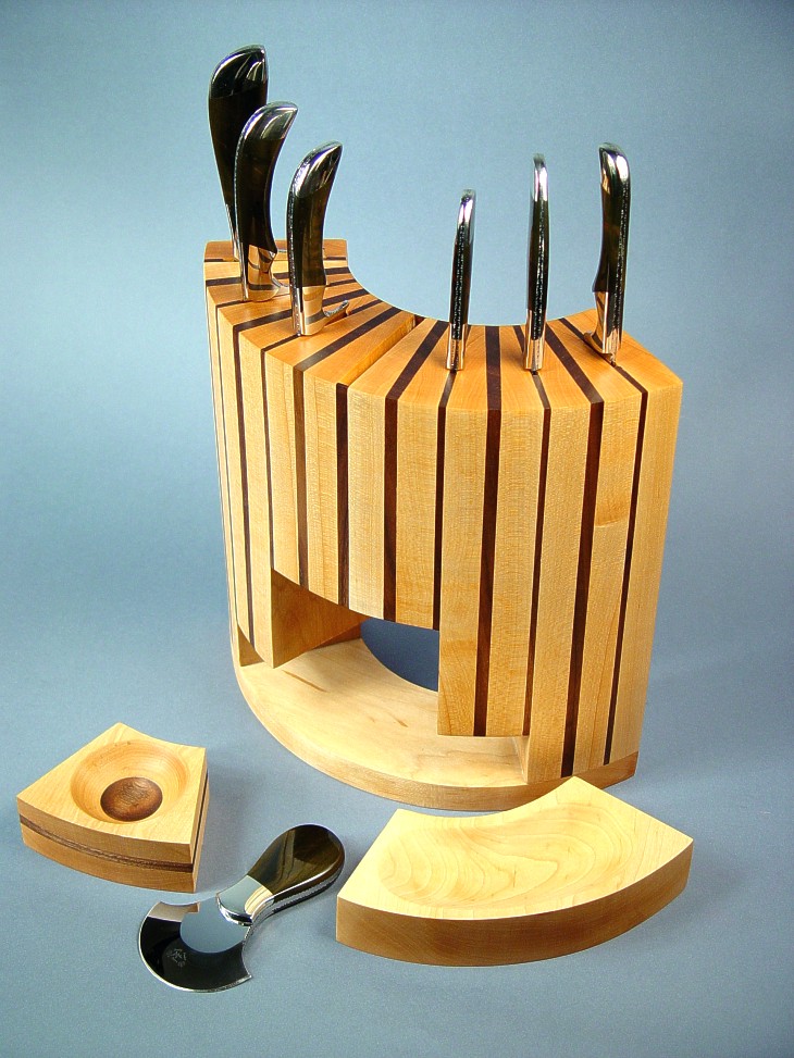 The block for this ensemble is hefty and durable. I made it from Rock Maple, one of the hardest woods known, and American Black Walnut. The block has dedicated spaces for all seven knives, and is fashioned in a radial shape, with special cutouts at the base for two bowls, also made of Rock Maple and Black Walnut. The nested bowls are contoured on the inside to match the hemispherical shape of the Spice Chopper; one is circular for nuts and hard spices, one is kidney- shaped for leafy spices.