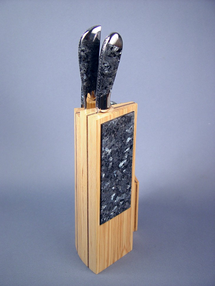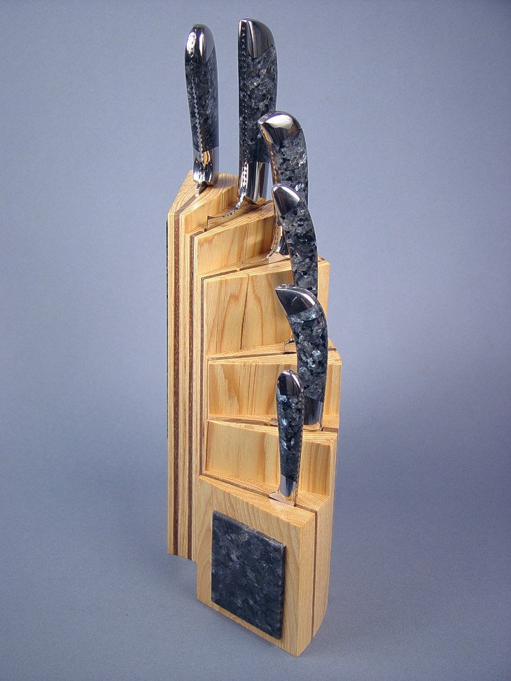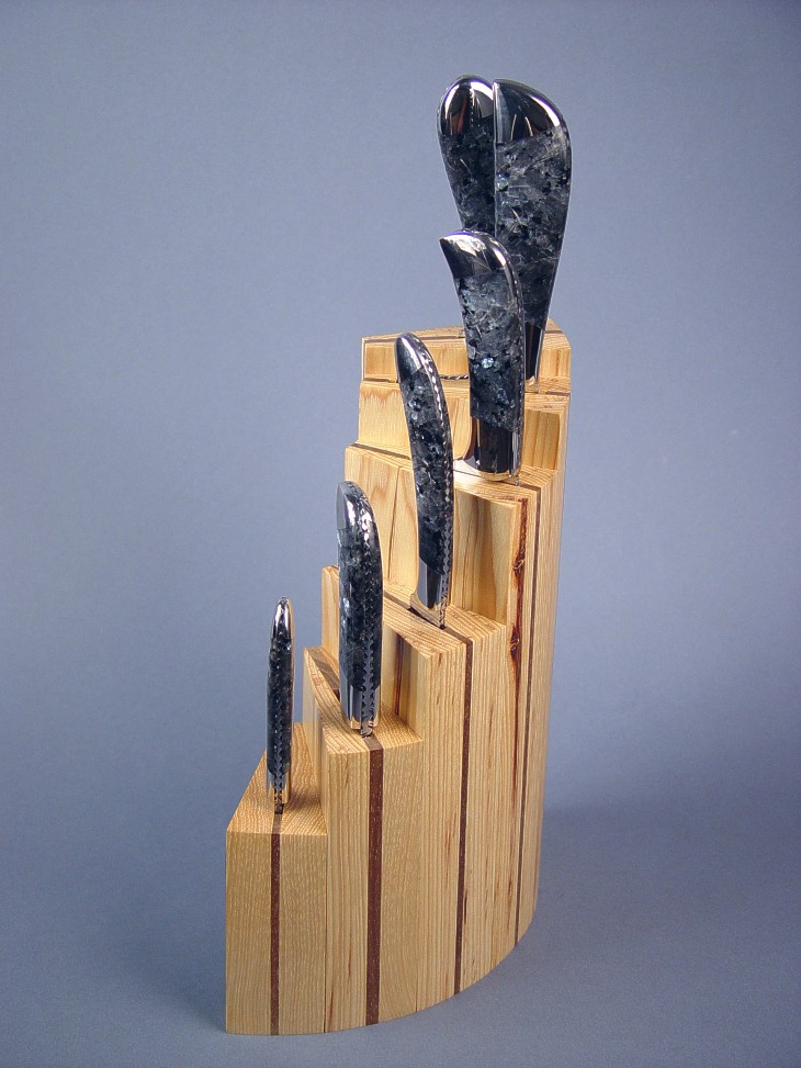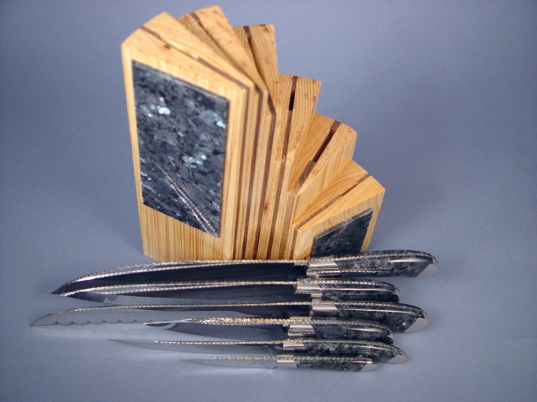 The block for this ensemble is extremely strong and durable. I made it from Pecan hardwood, one of the hardest and toughest woods known, a close relative of Hickory, with American Black Walnut spacers. The block has dedicated spaces for all six knives, and is fashioned in a stair-step radial shape for a tasteful display. The woods are oiled and waxed for longevity, and the flat faces of the block are capped with ground, lapped, and polished panels of Larvikite to match the handles.