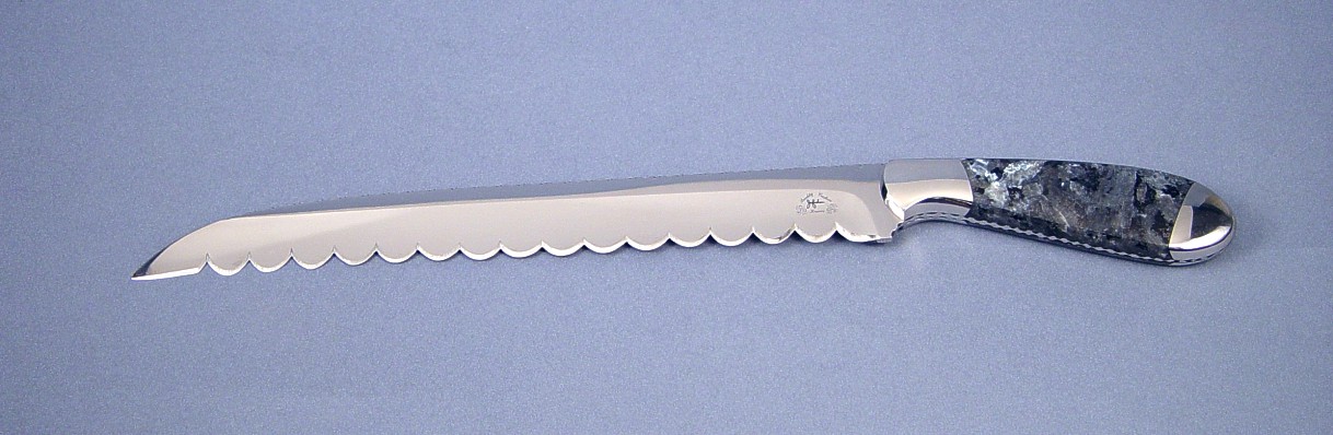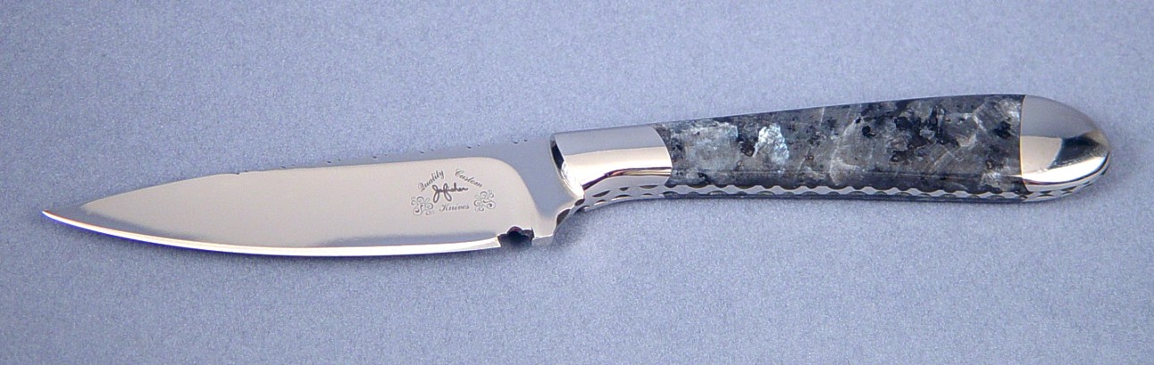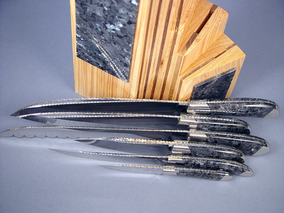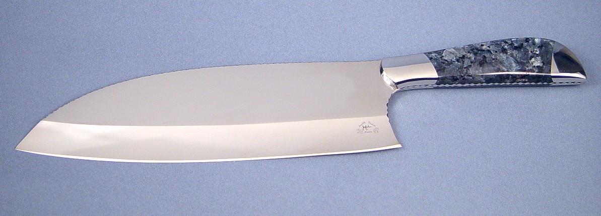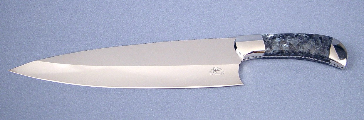 An elegant and tasteful set, this Chef's set is custom made for the kitchen. The blades are all 440C high chromium martensitic stainless steel, chosen for high wear resistance and a great reputation. The blades are all hollow ground and mirror polished for high corrosion resistance and easy cleaning. The blade tempers vary to their use; the thin and springy boning knife is less hard and more tough, the thicker La Cocina is harder and less tough. All of the blades have matching full filework and fully tapered tangs. The bolsters are all 304 austenitic high nickel, high chromium stainless steel for the ultimate in toughness and corrosion resistance. They are all dovetailed and bed scales of rich Larvikite with is a syenite containing large crystals of anthorclase which display a beautiful blue-gray schiller and iridescence. Thus the alternate name: Blue Pearl Granite. This rock was intruded during the Carboniferous period, so is about 300 million years old. It is very tough and durable, taking and keeping a great polish. The knives are my Vega master chef's knife, my French Chef Sabatier, my serrated Bread knife, the La Cocina fruit and utility knife, my Boning knife, and Paring knife.