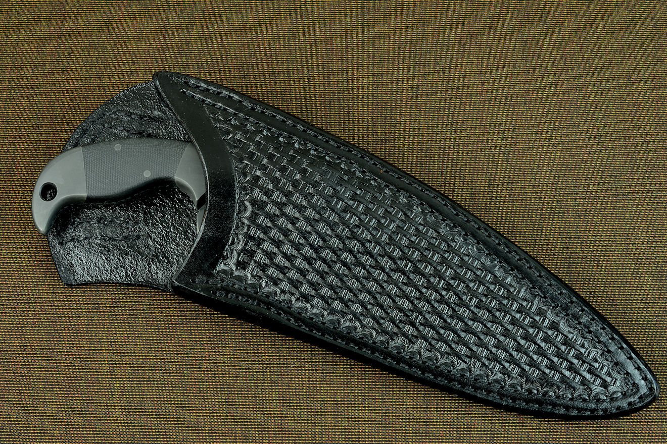 This knife package also includes a basketweave pattern hand-stamped leather sheath, made of 9-10 oz. leather shoulder, dyed black and sealed. The sheath was included for quiet operations, when moving against hard objects (concrete or stone) could telegraph a position through noise. It's also useful for traditional and conventional wear options. The sheath has double-row stitching throughout, and at the belt loop with the toughest polyester thread, water and sunlight resistant. The knife fits deep and secure into the sheath, with the handle exposed and the back of the sheath rises high to protect the wearer. The entire sheath (body and welts) is double-row stitched for extreme durability. The sheath edges are dressed and smoothed for comfort; the entire sheath is sealed with acrylic for water resistance, permanence, and longevity.