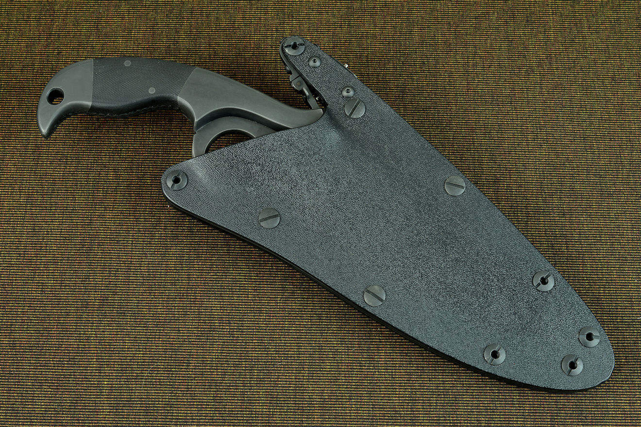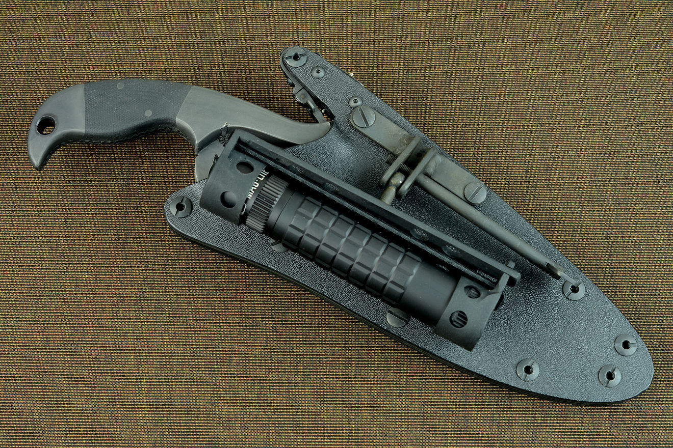 This knife is made in my new "Shadow" line of counterterrorism knives; this is a very special knife. I've created the Shadow line because my counterterrorism clients have repeatedly requested completely subdued packages, knives and full accessory compliments that are dark, flat, minimized, and with minimal visual imprint. While these could be called stealthy, that wouldn't quite be accurate since these are highly effective, substantial, and imposing weapons and tools that are not easily hidden! It has taken a lot of research and experimentation to come up with the processes that define the Shadow line. I start with my effective and well-recognized combat and counterterrorism knife designs, and add as many features and accessories possible so that these ensembles will interface with all the gear, in every situation, as dictated by my combat and counterterrorism clients. They have given me the guidance to create this gear, and I believe it is the best of its field in the entire world. I know of no other knife maker or manufacturer that has even come close, and none that have even tried.
