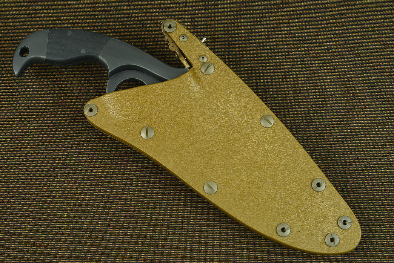 The locking sheath is absolutely the finest made in the world today, and has been for many years. I first designed these by request of USAF Pararescuemen in the early 1990s, and in the hundreds I've made, I've never had a failure of a single one. This is because they are extremely well-built, tremendously durable, and highly corrosion resistant. They are completely waterproof, with all surfaces and components either treated, naturally waterproof, or stainless steel. The sheaths are built of double thickness (.125" thick) kydex (methyl acrylate and polyvinyl chloride) over a welt-frame of black or coyote tan anodized 5052H32 corrosion resistant high strength aluminum alloy. I've meticulously anodized all of the aluminum surfaces, even through holes, of each welt component, mount, fitting, and fixture for extremely high durability, ultimate corrosion resistance, strength enhancement, and muted or matching camouflage appearance. If you're not familiar with anodization, it's a chemo-electric process that creates a near-ceramic hard surface on the aluminum alloy, a surface that increases wear resistance tremendously, and a surface that can accept permanent dyes that are sealed in place. For my black kydex sheaths, the anodized aluminum color is black for low reflectivity and matching appearance, and for the coyote tan sheaths, the aluminum closely matches the sheath kydex and modern desert camo gear. For high durability, the anodized surface is a full 1 mil thick, and is sealed with a process that resists sunlight bleaching to the highest degree. The sheath is bonded with waterproof cement and bolted together with all appropriately colored or darkened 304 stainless steel Chicago screws for zero care and extreme corrosion resistance while being minimized and non-reflective.